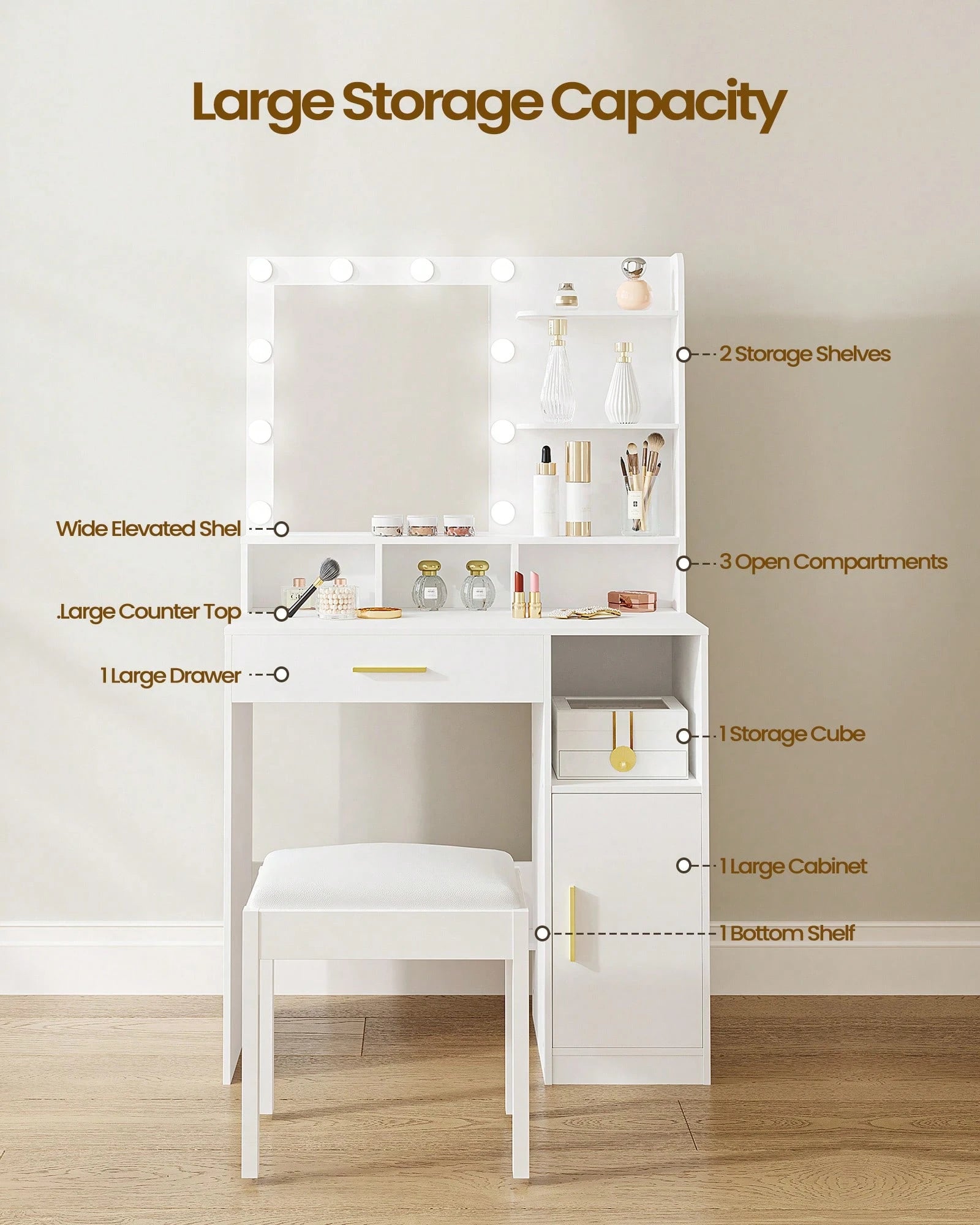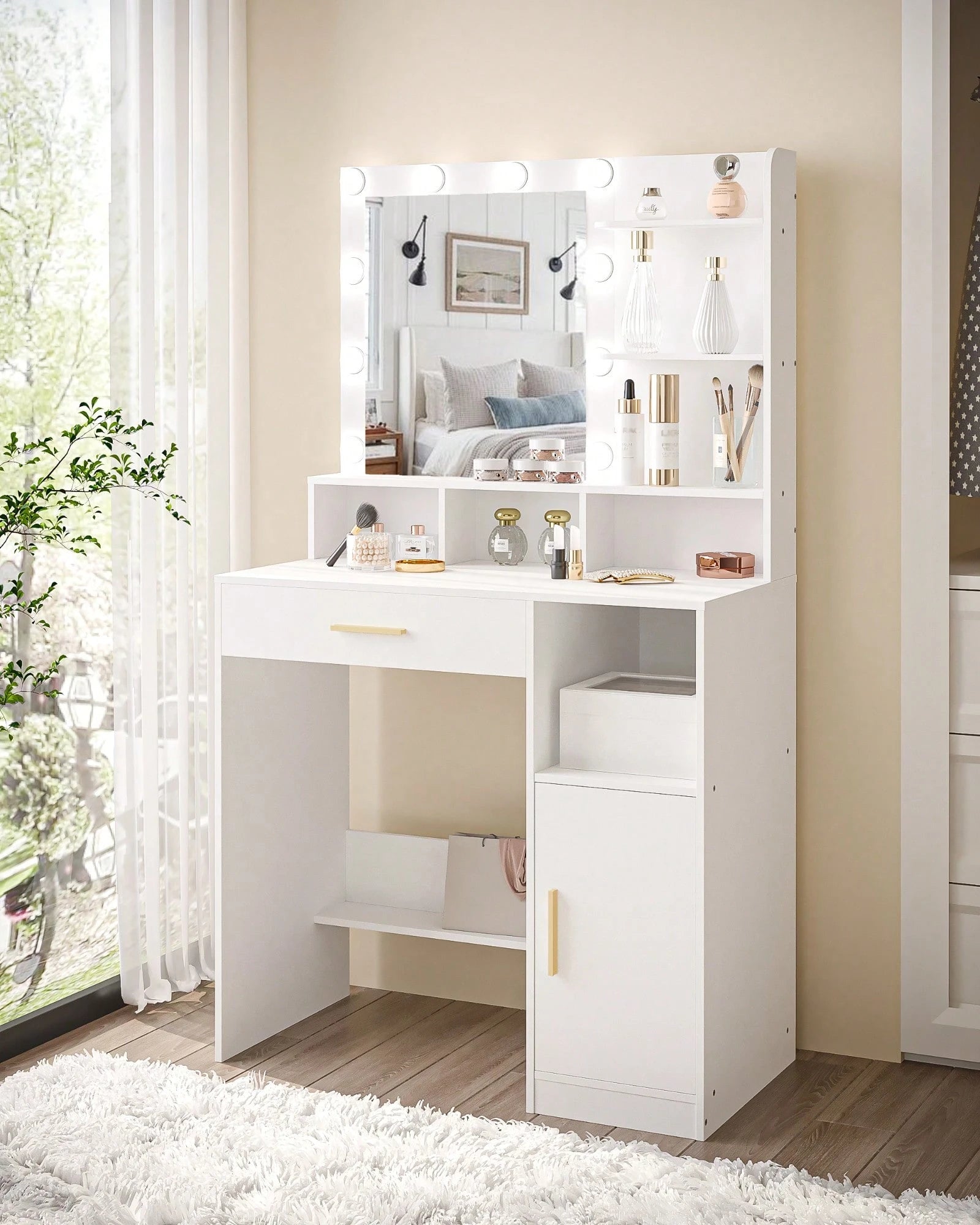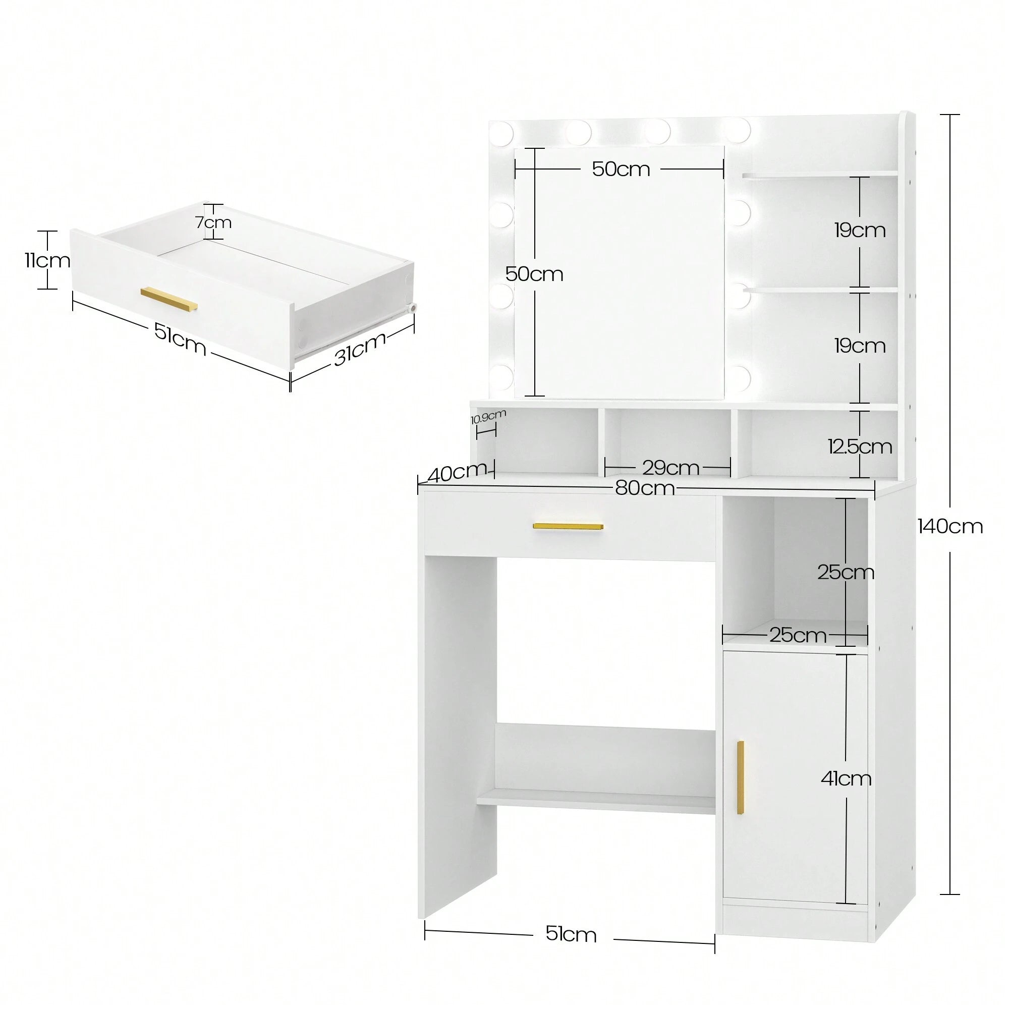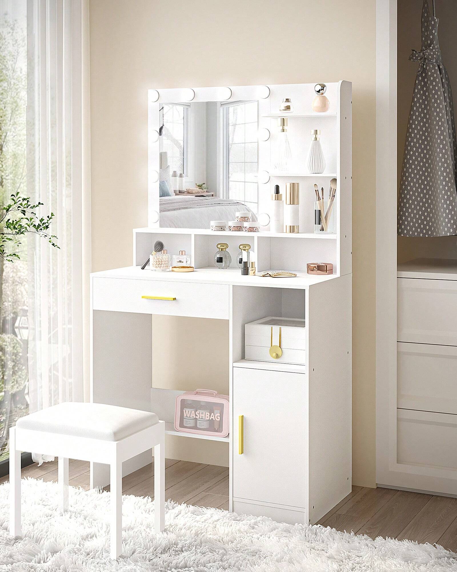 La struttura robusta e stabile garantisce durabilità nel tempo, mentre l'ampio cassetto e l'armadietto integrato offrono spazio organizzato per cosmetici e accessori.