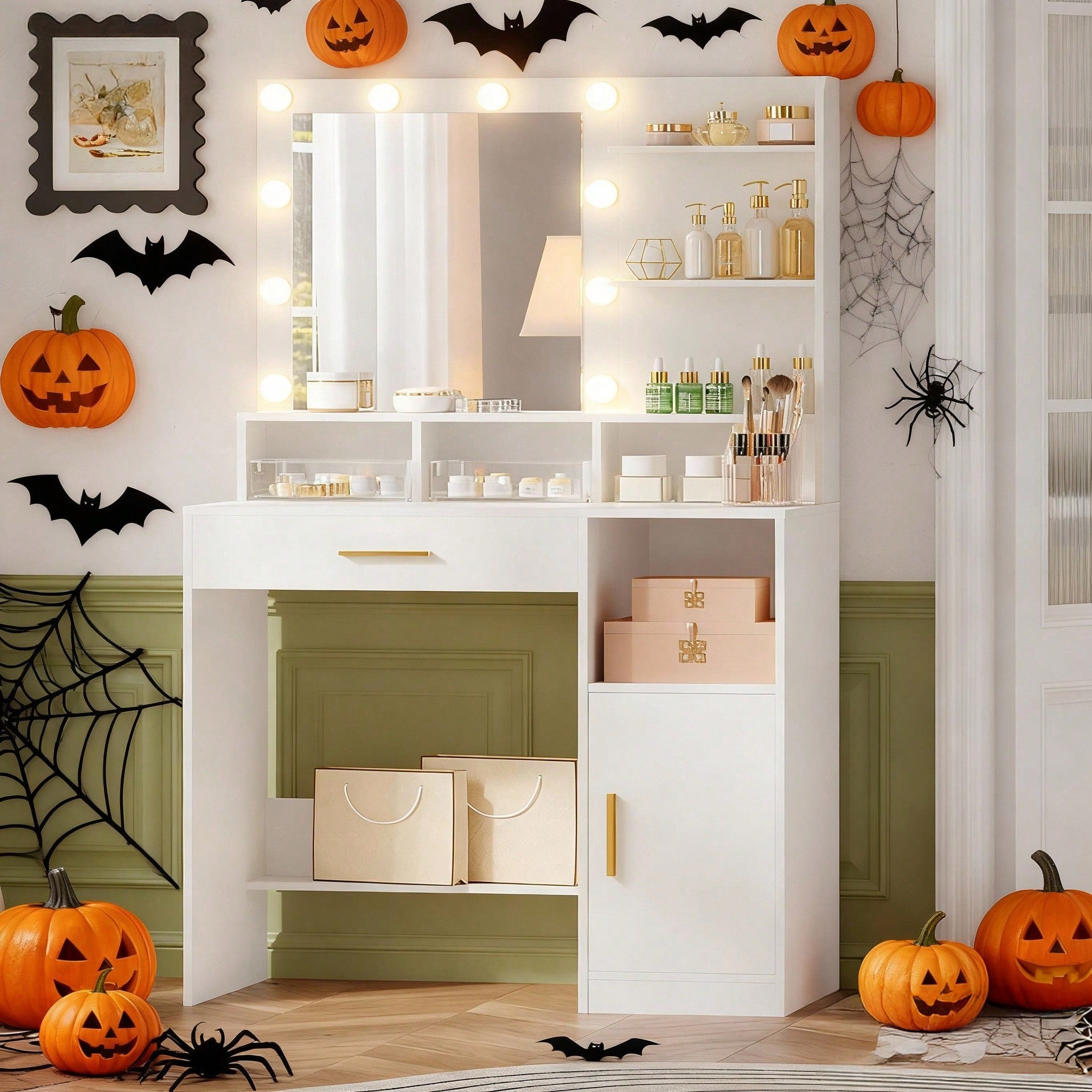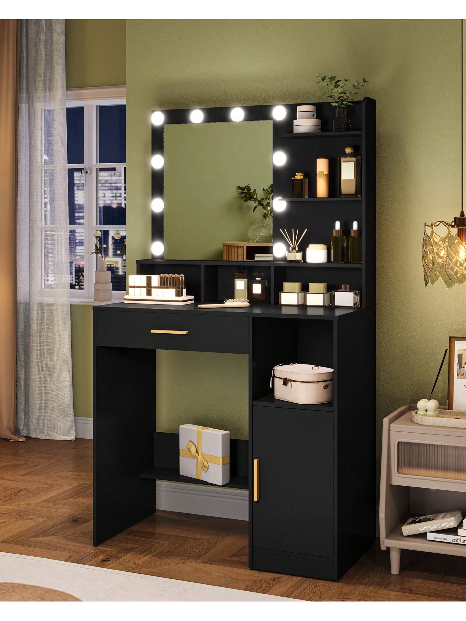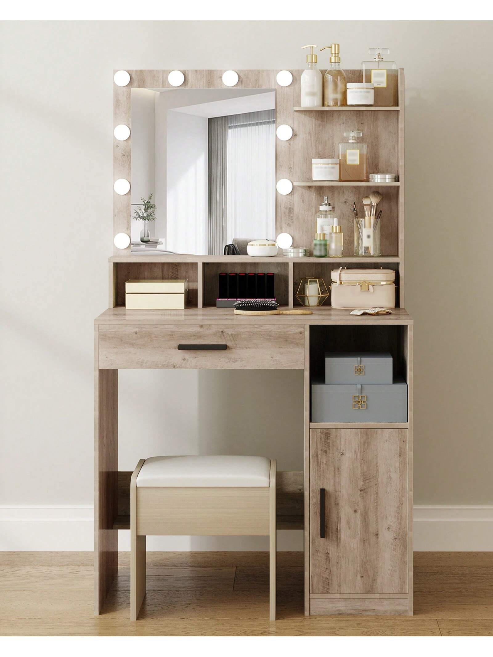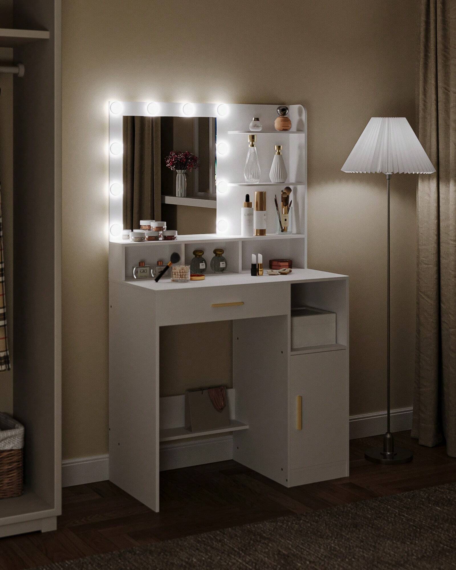 Toeletta da trucco moderna con specchio grande e illuminazione regolabile per un'applicazione del make-up precisa in qualsiasi condizione di luce. La struttura robusta e stabile garantisce durabilità nel tempo, mentre l'ampio cassetto e l'armadietto integrato offrono spazio organizzato per cosmetici e accessori. Design elegante e funzionale, ideale per chi ricerca...