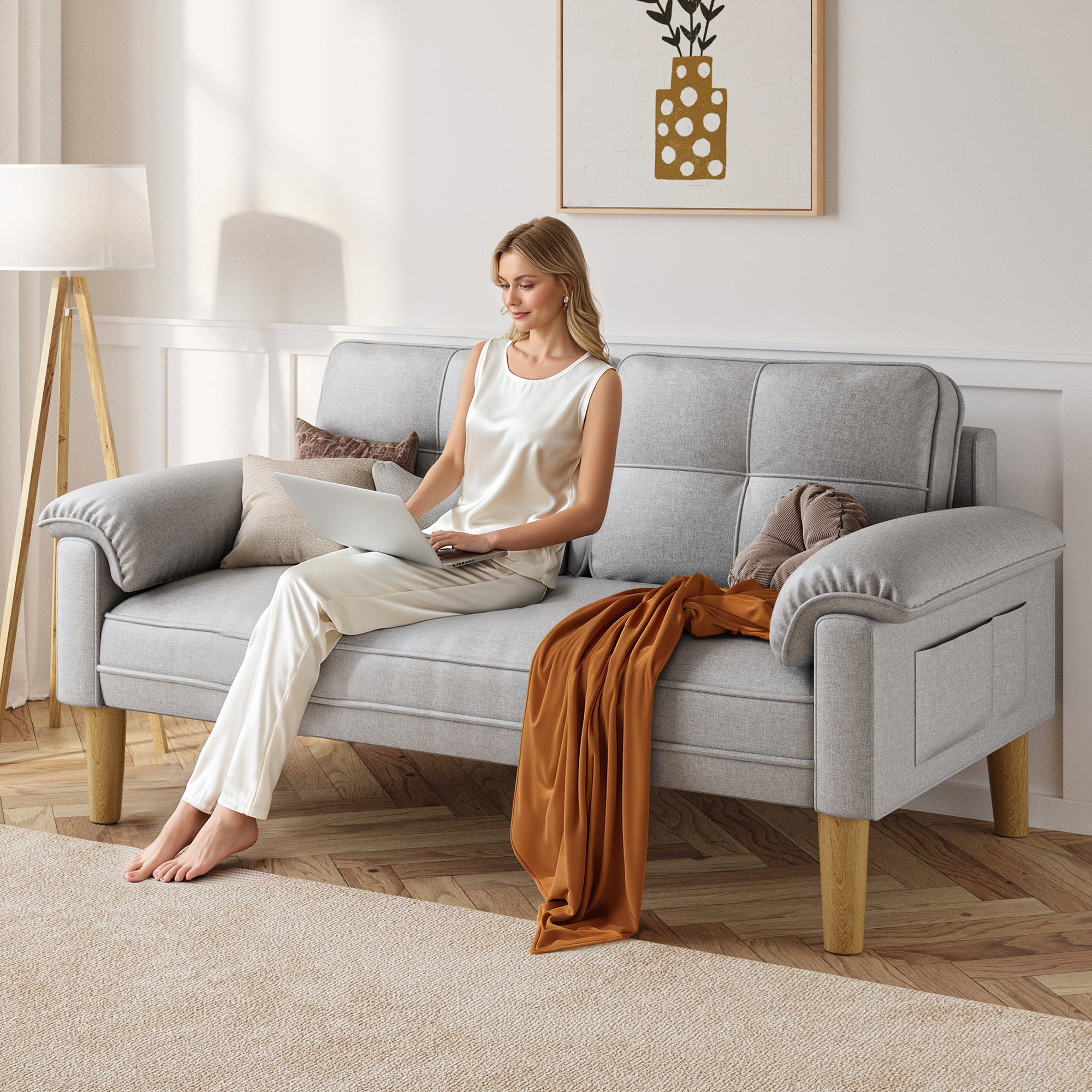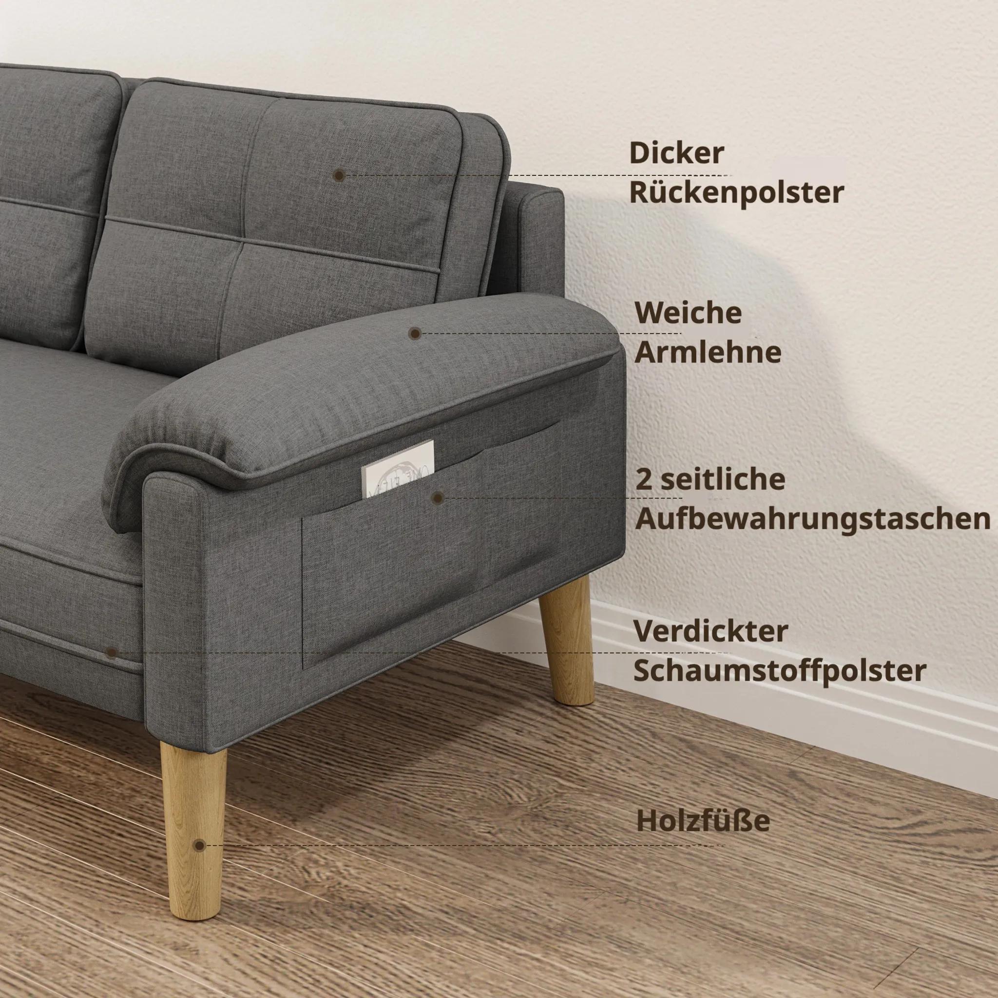 Divano a due posti grigio scuro con tasche laterali Tessuto delicato sulla pelle e struttura