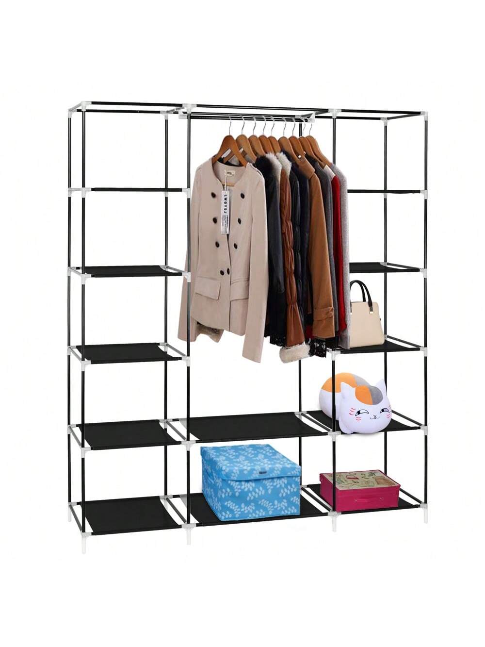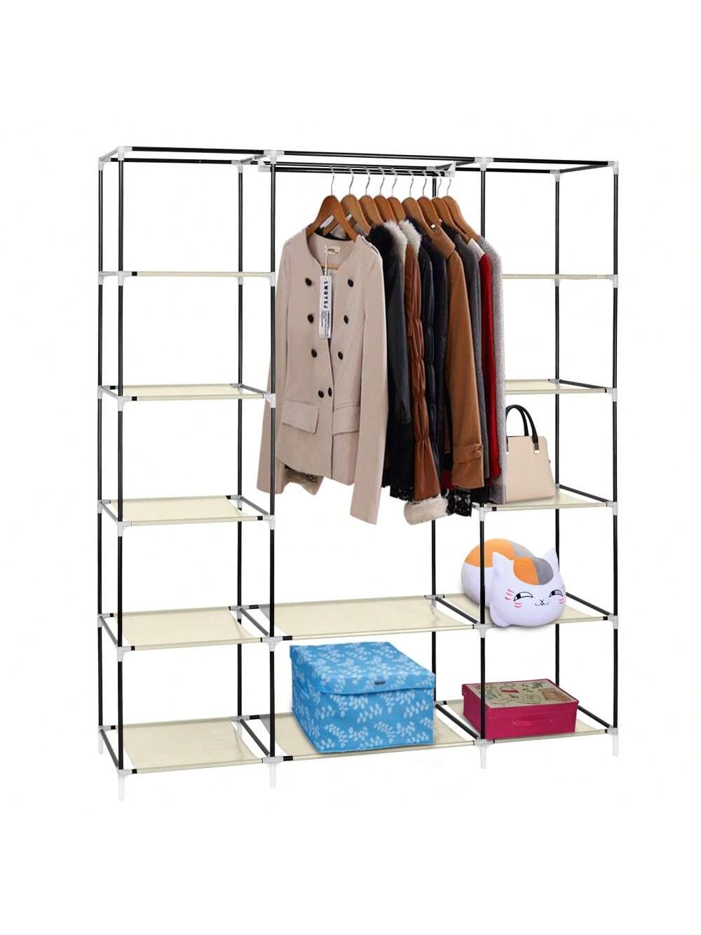 Il bastone appendiabiti mobile e i 12 ripiani portaoggetti ti offrono spazio sufficiente per i tuoi abiti lunghi e i vestiti piegati.