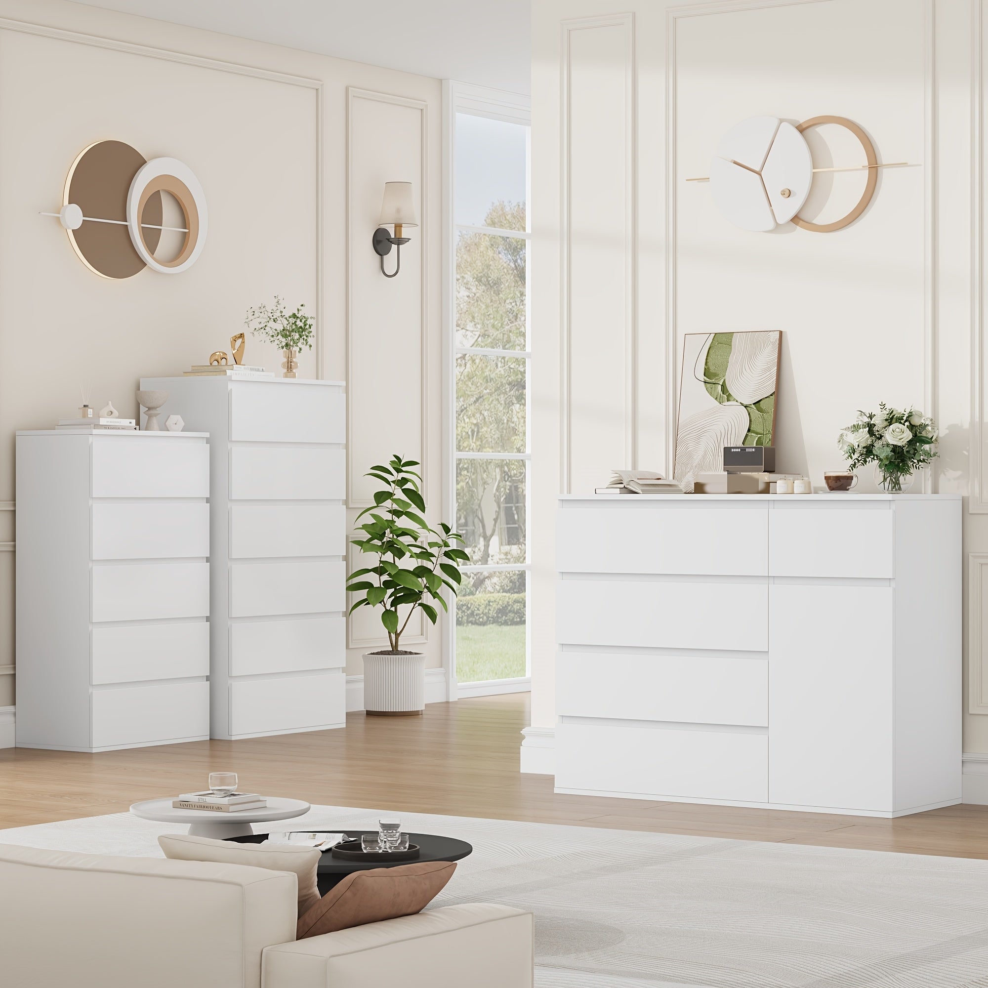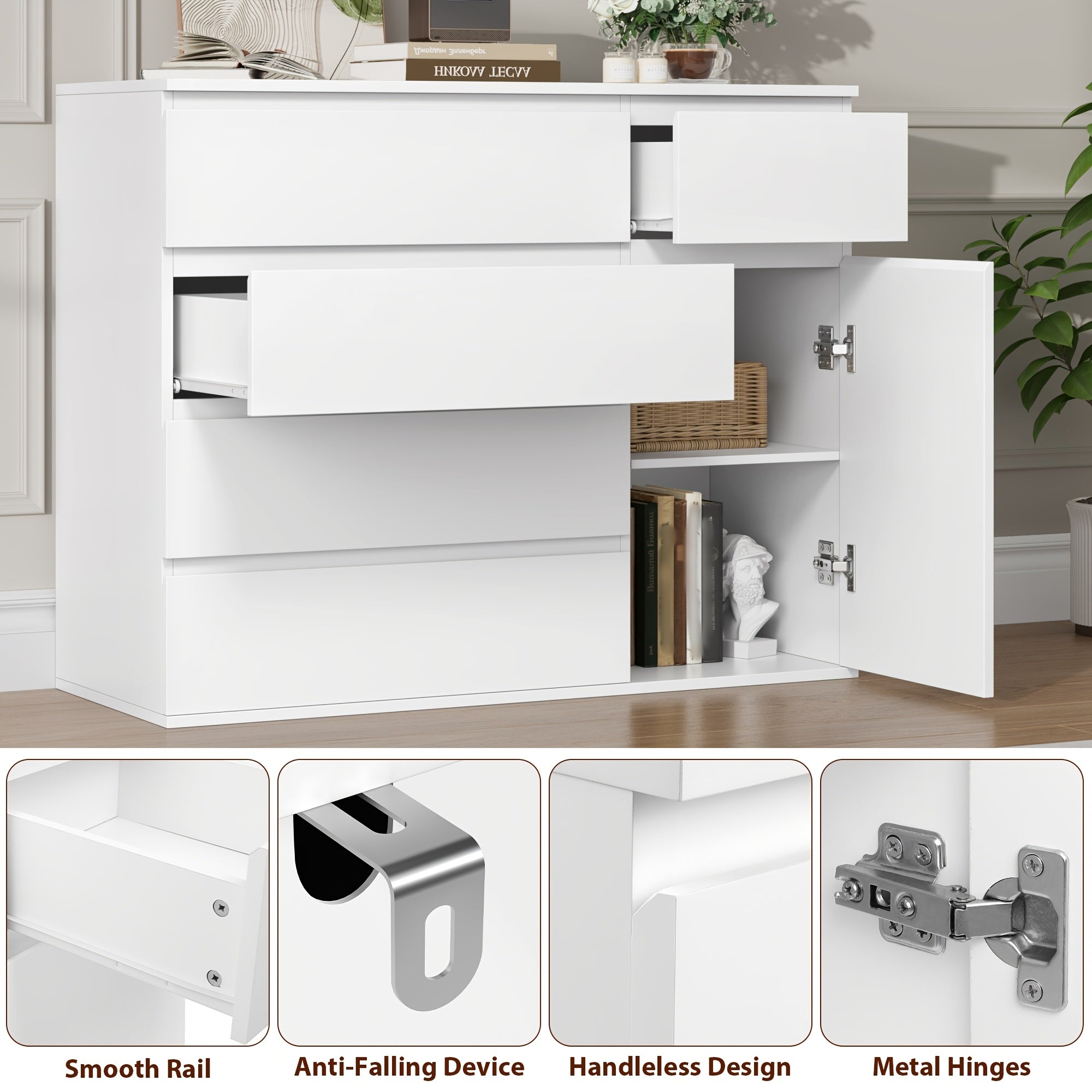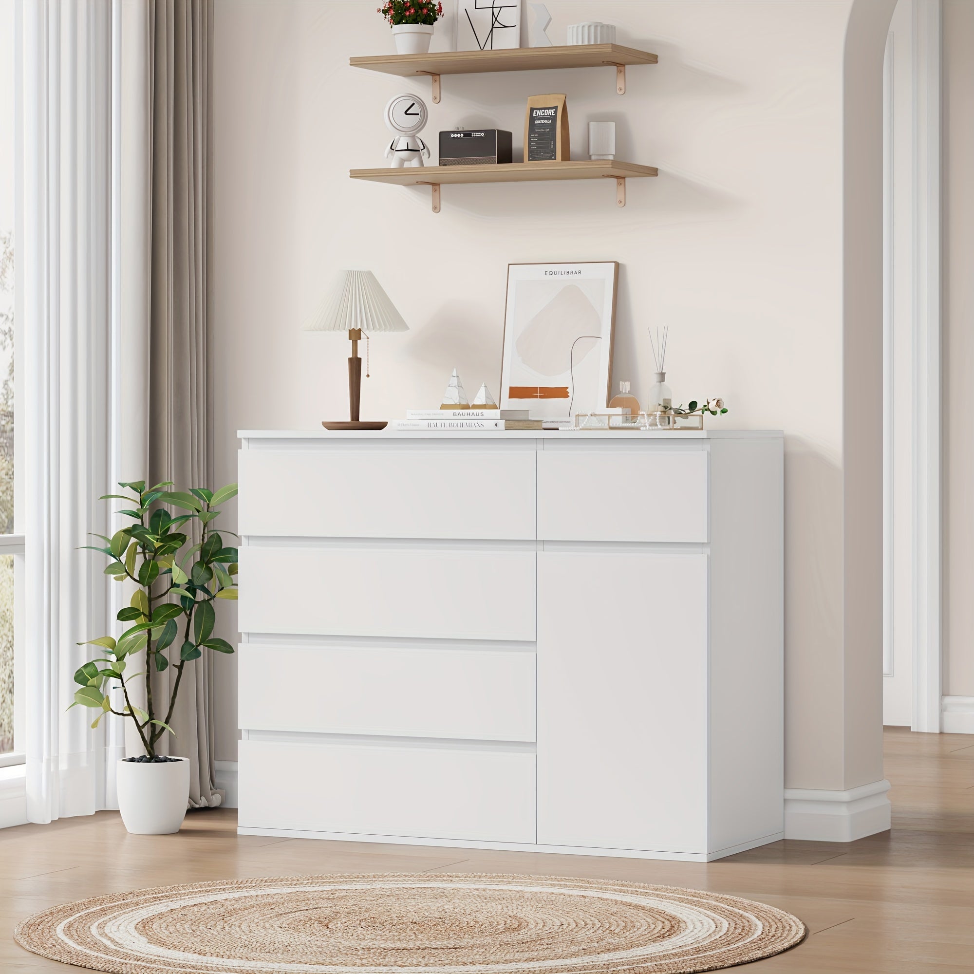- Comò moderno in bianco puro con cinque capienti cassetti e eleganti maniglie in legno naturale.