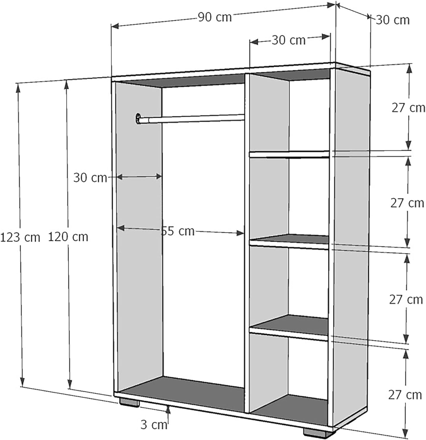 Dimensioni:- Esterne (AxLxP): 123 x 90 x 30 cm- Scomparti (AxP): ciascuno 27 x 30 cm- Lunghezza dell'asta: 55 cm- Altezza dei piedini: 3 cm
