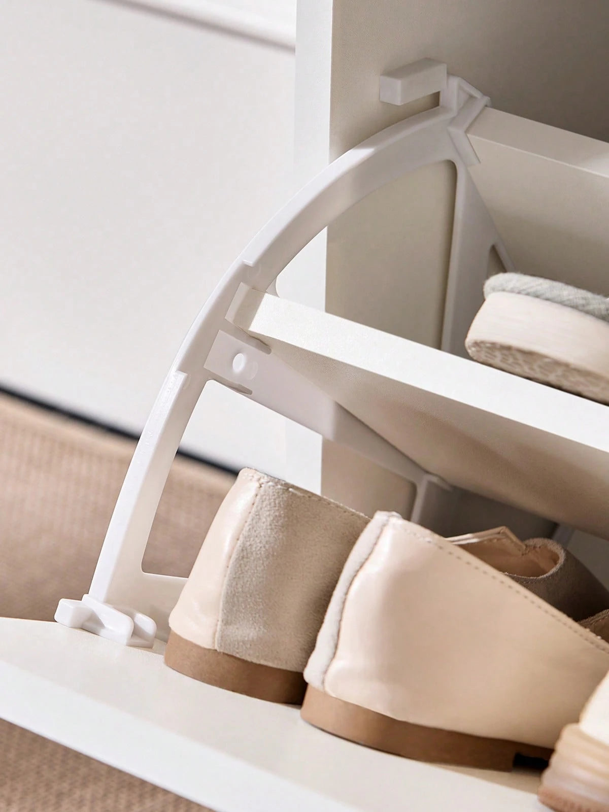 Scarpiera ribaltabile in bianco con design salvaspazio ideale per ingressi e corridoi.