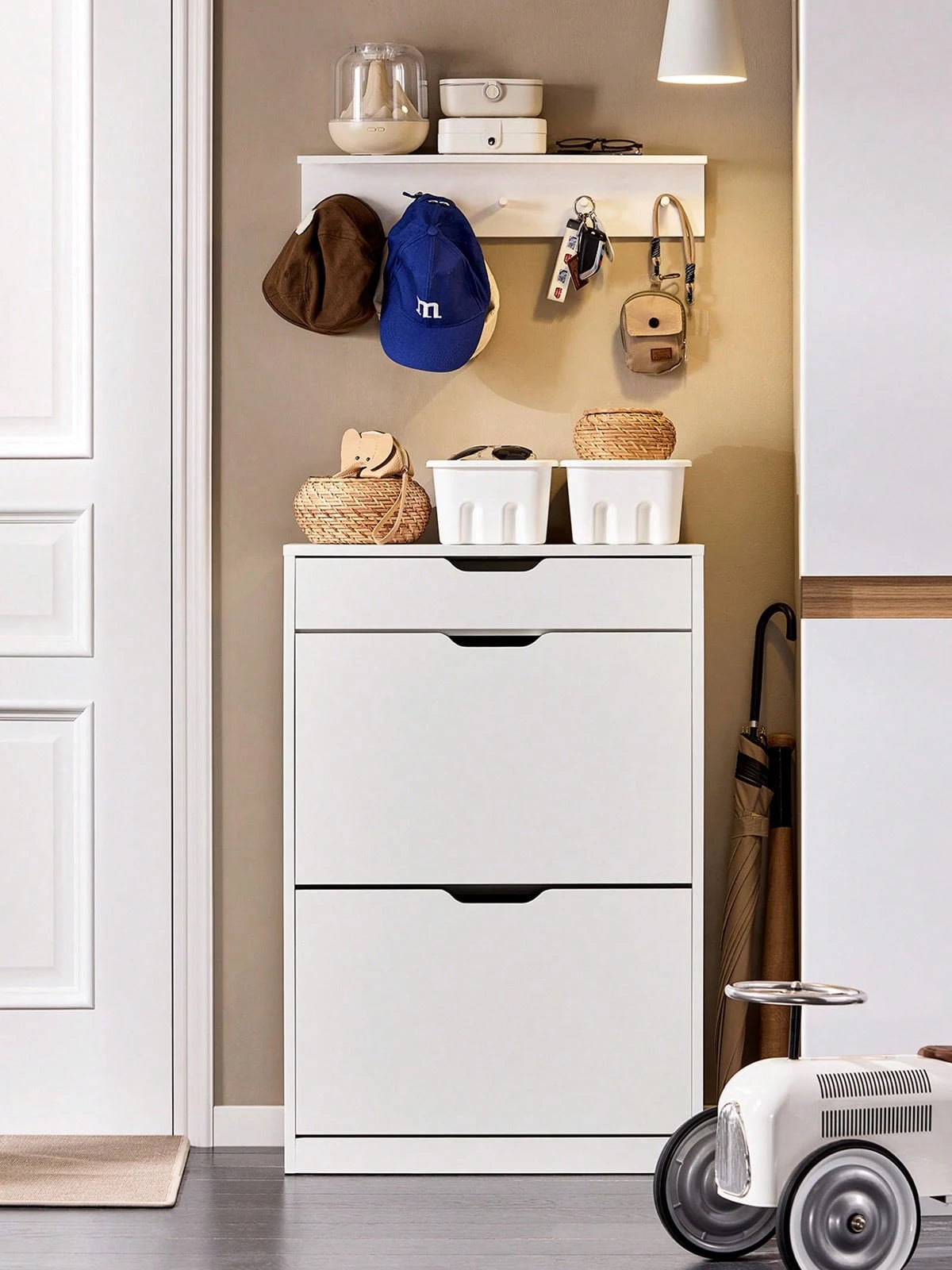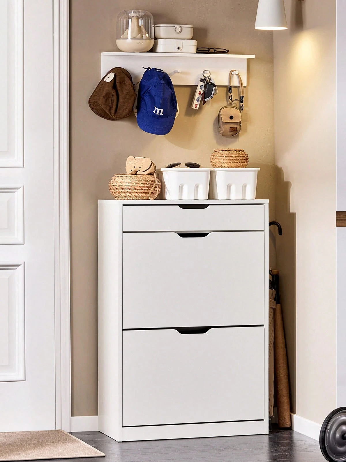 Dotata di 2 ante ribaltabili e 1 cassetto, offre ampia capacità di stoccaggio per mantenere le scarpe organizzate e fuori dalla vista.