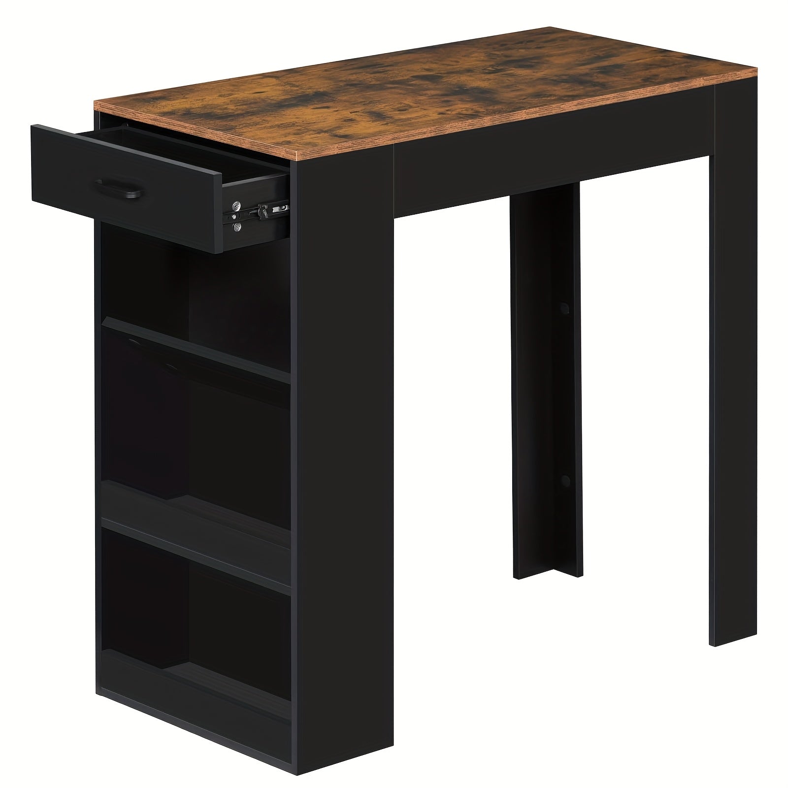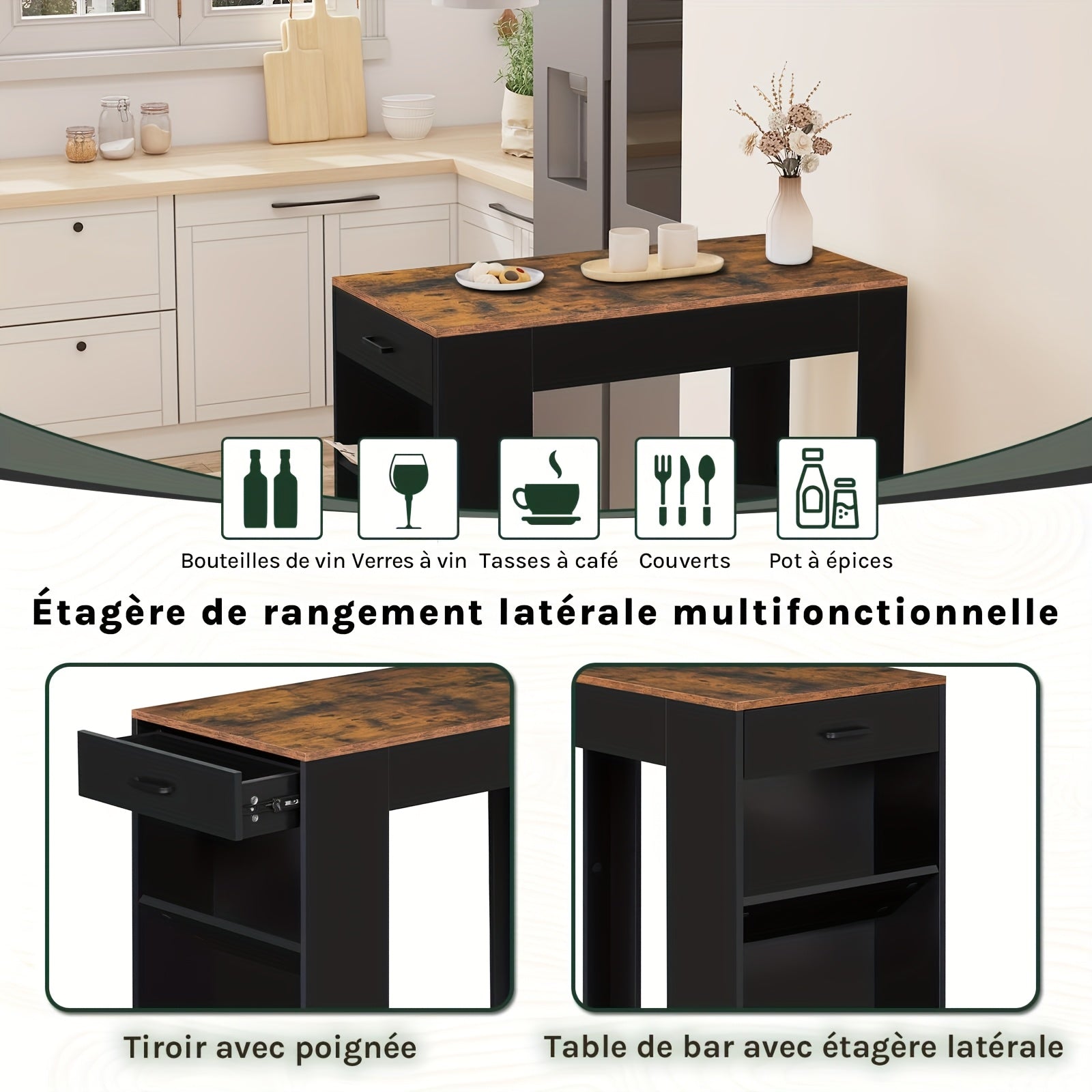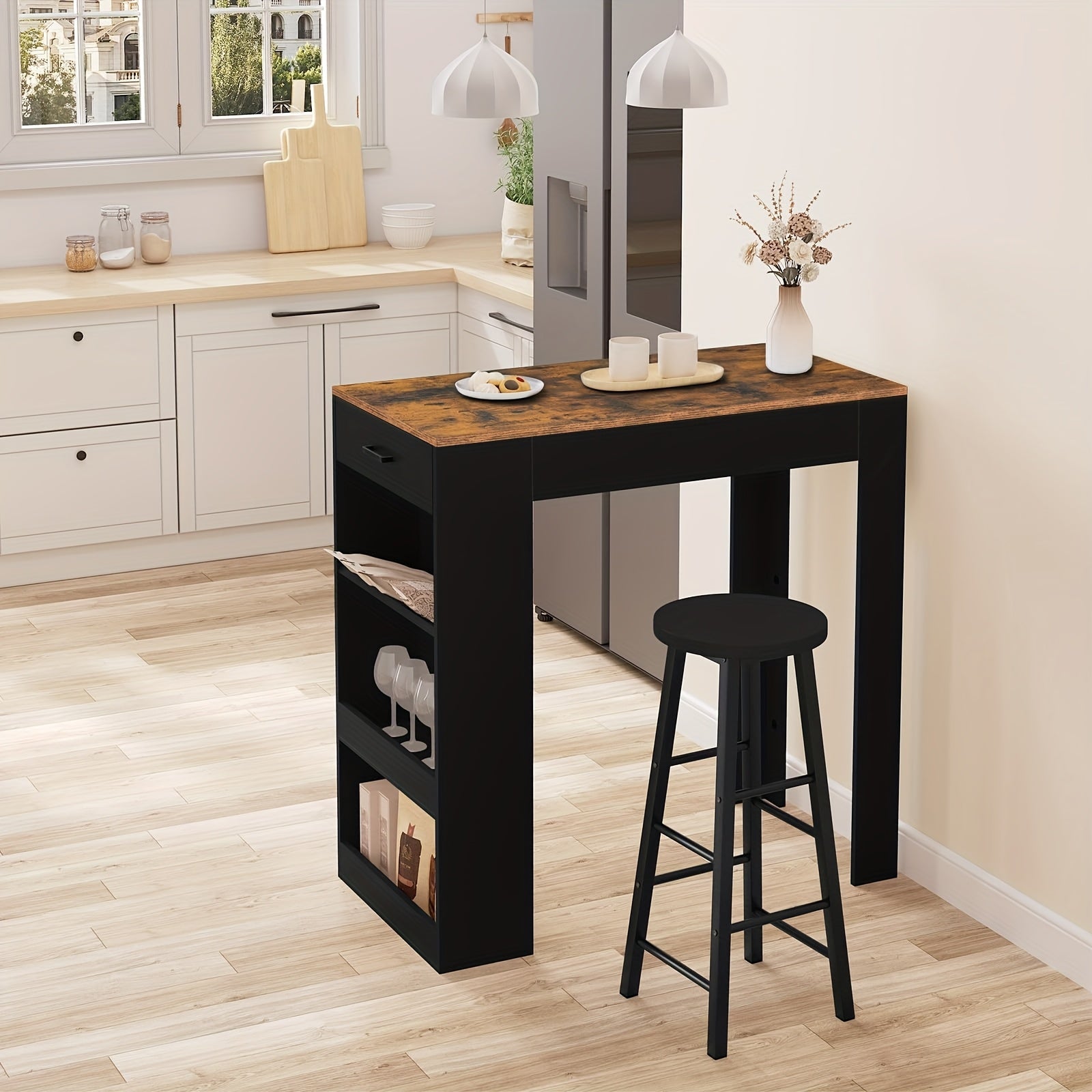 Trasforma il tuo spazio con questo tavolo bar retrò marrone che unisce stile vintage e praticità moderna. Perfetto per la cucina, il soggiorno o la sala da pranzo, offre un design elegante e sottile che non ingombra. Con 1 cassetto e 3 ripiani generosi, hai tutto lo spazio che serve...