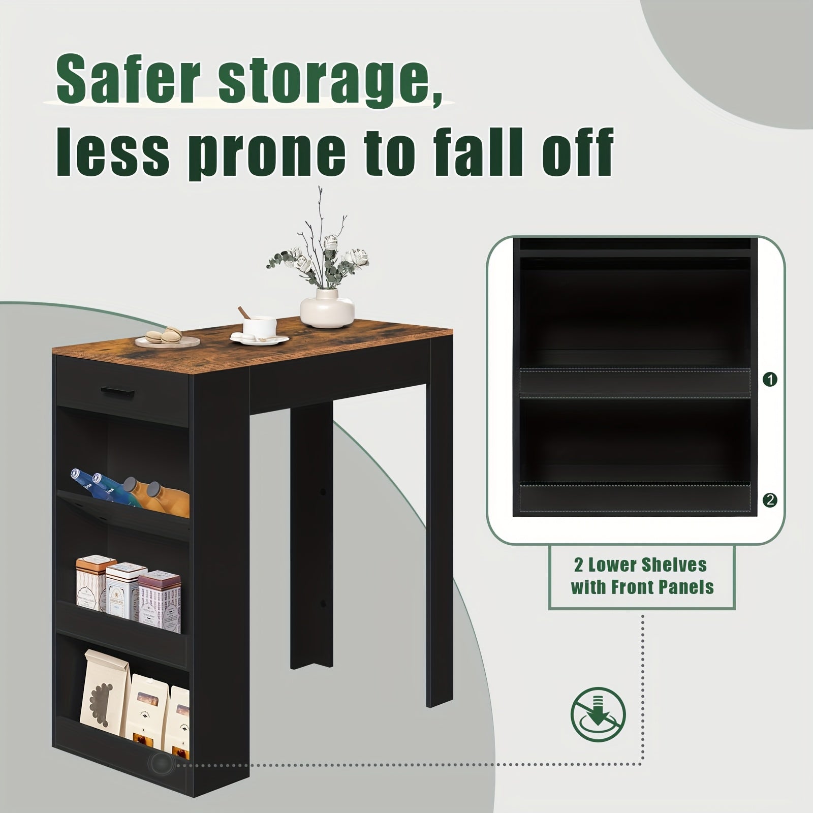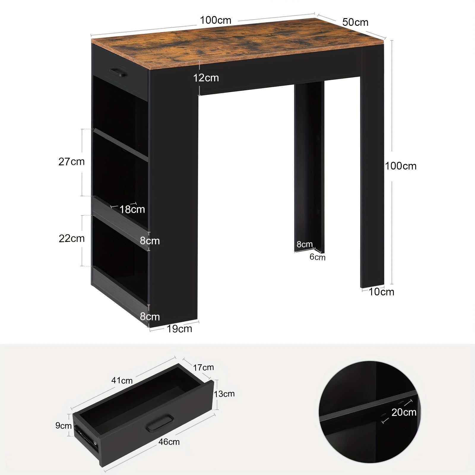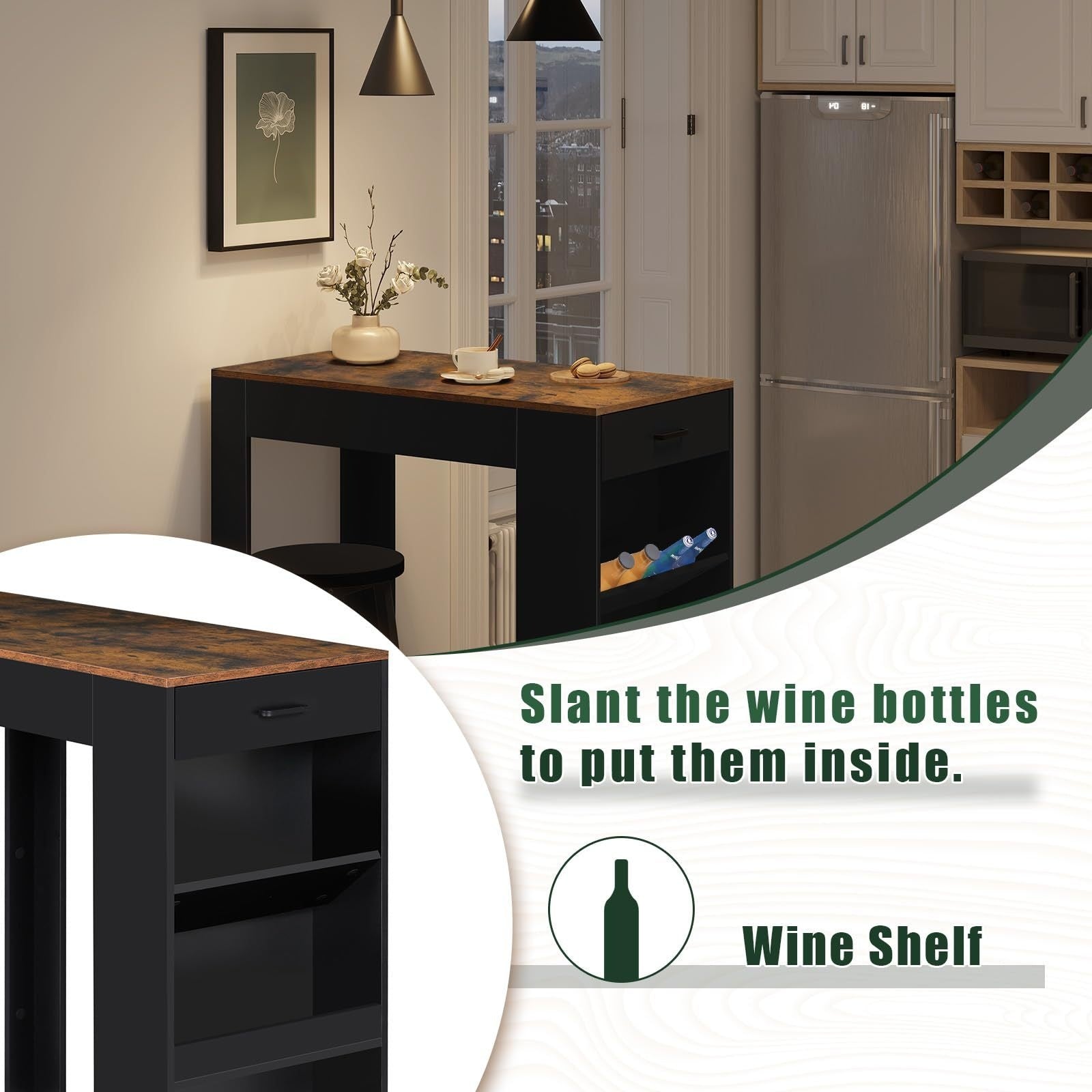 Trasforma il tuo spazio con questo tavolo bar retrò marrone che unisce stile vintage e praticità moderna. Perfetto per la cucina, il soggiorno o la sala da pranzo, offre un design elegante e sottile che non ingombra. Con 1 cassetto e 3 ripiani generosi, hai tutto lo spazio che serve...