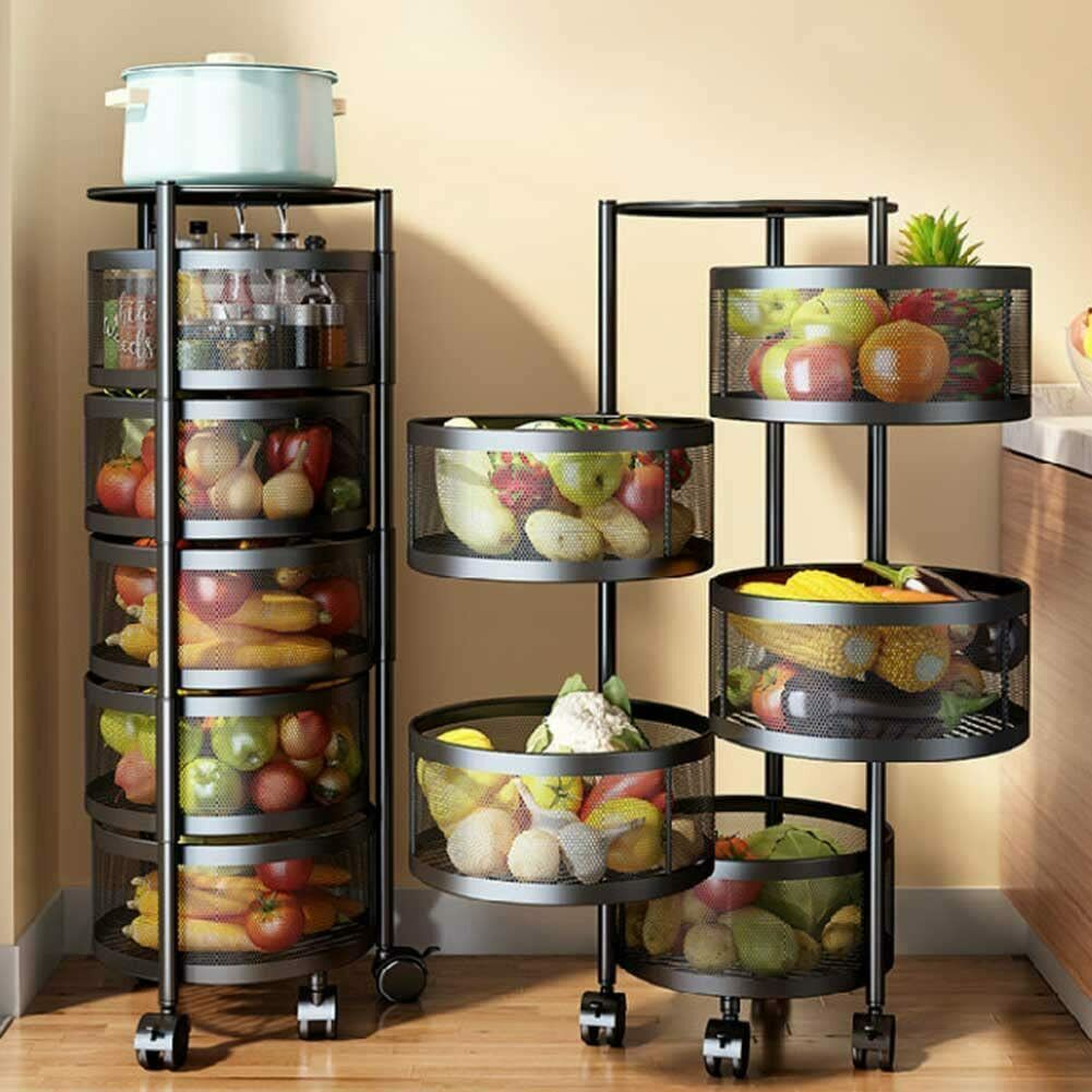 Carrello da cucina dal design moderno a cilindro, comodo, affidabile e pratico realizzato interamente in metallo di altissima qualità verniciato a polvere in un bellissimo colore nero, fornito di 5 capienti cesti apribili + un ripiano superiore utili per contenere frutta verdura, stoviglie e tutto ciò che vorrai.