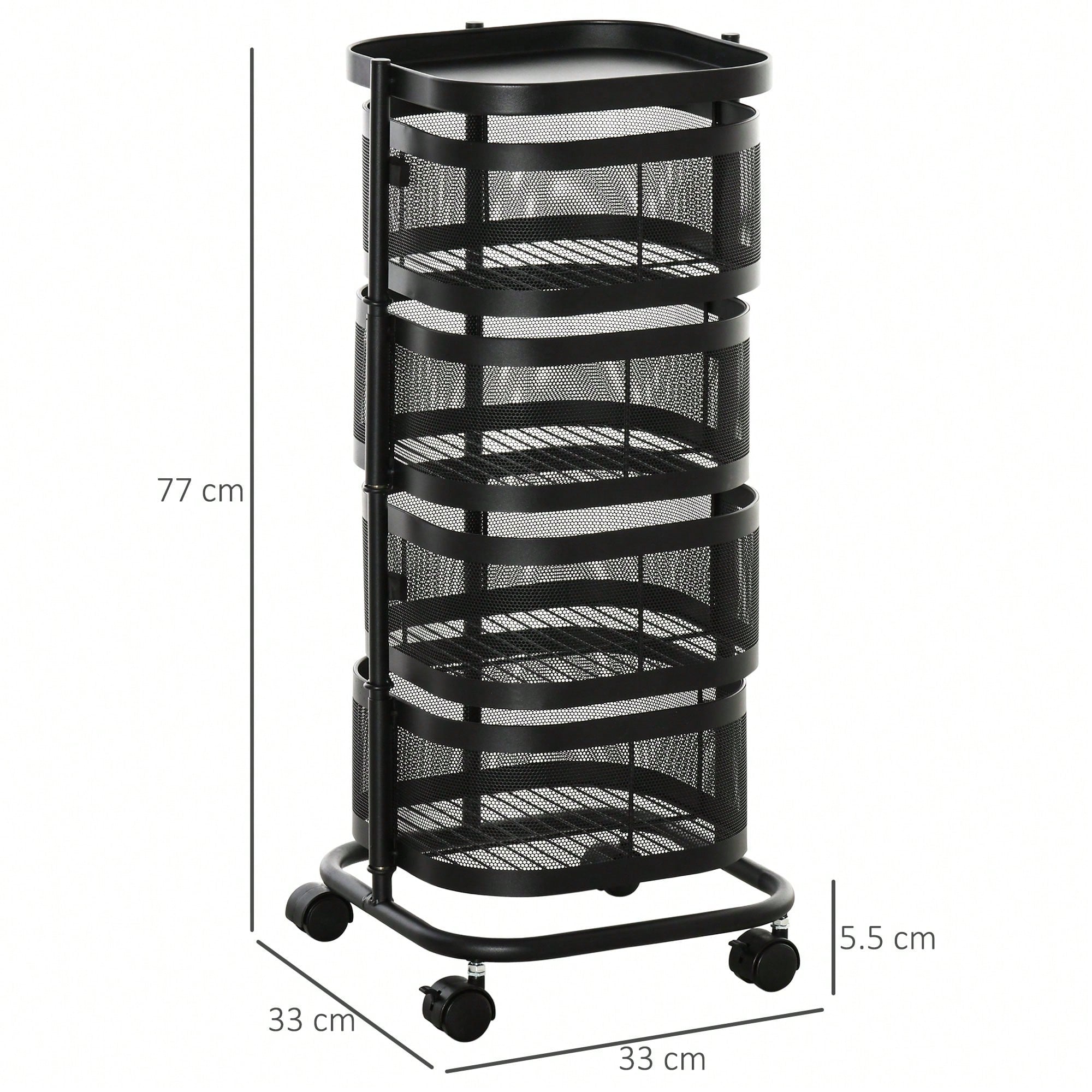 Con 4 cestelli in rete, un pratico piano d'appoggio e ruote girevoli che si muovono in ogni direzione, sposta facilmente quello che ti serve da una stanza all'altra.