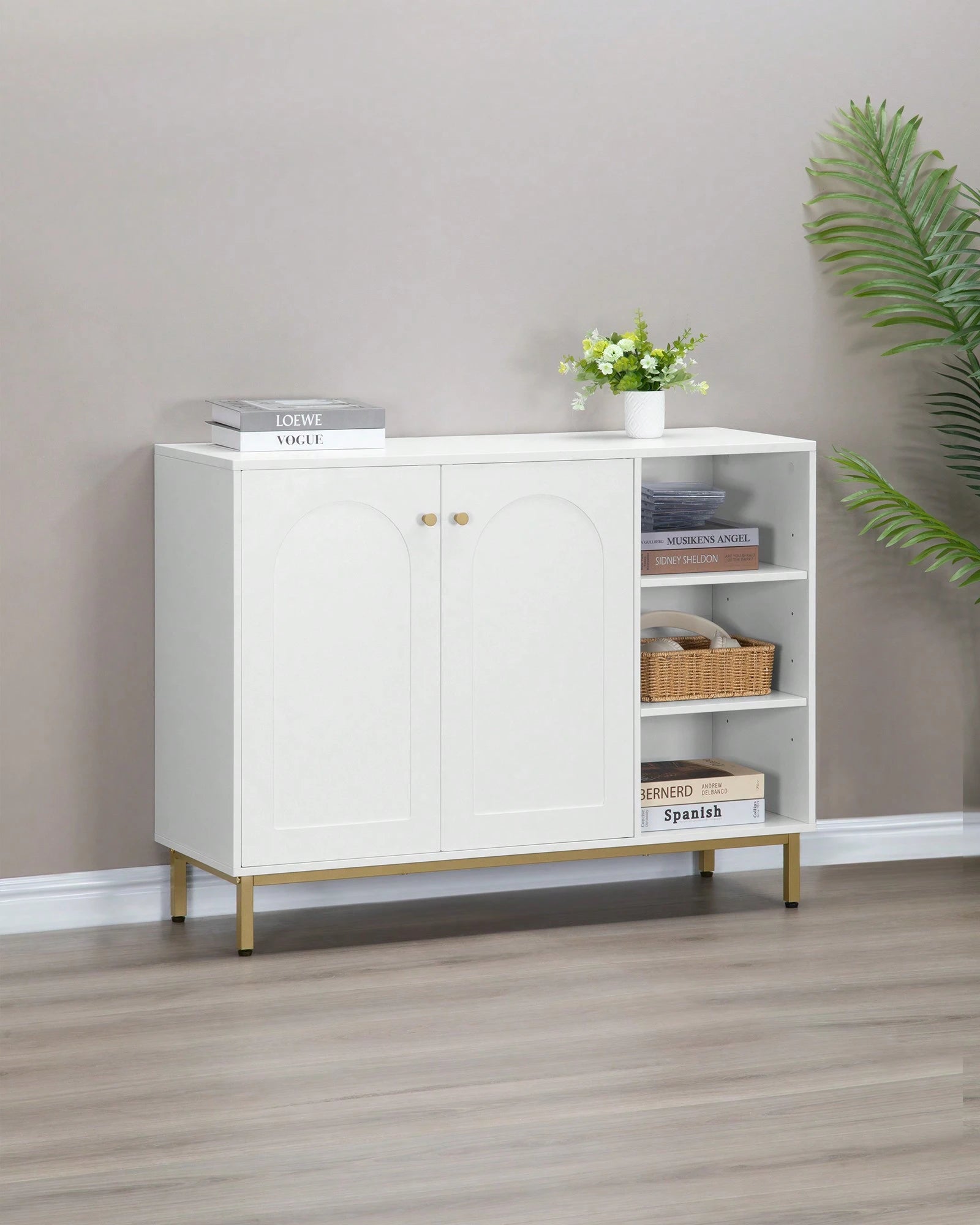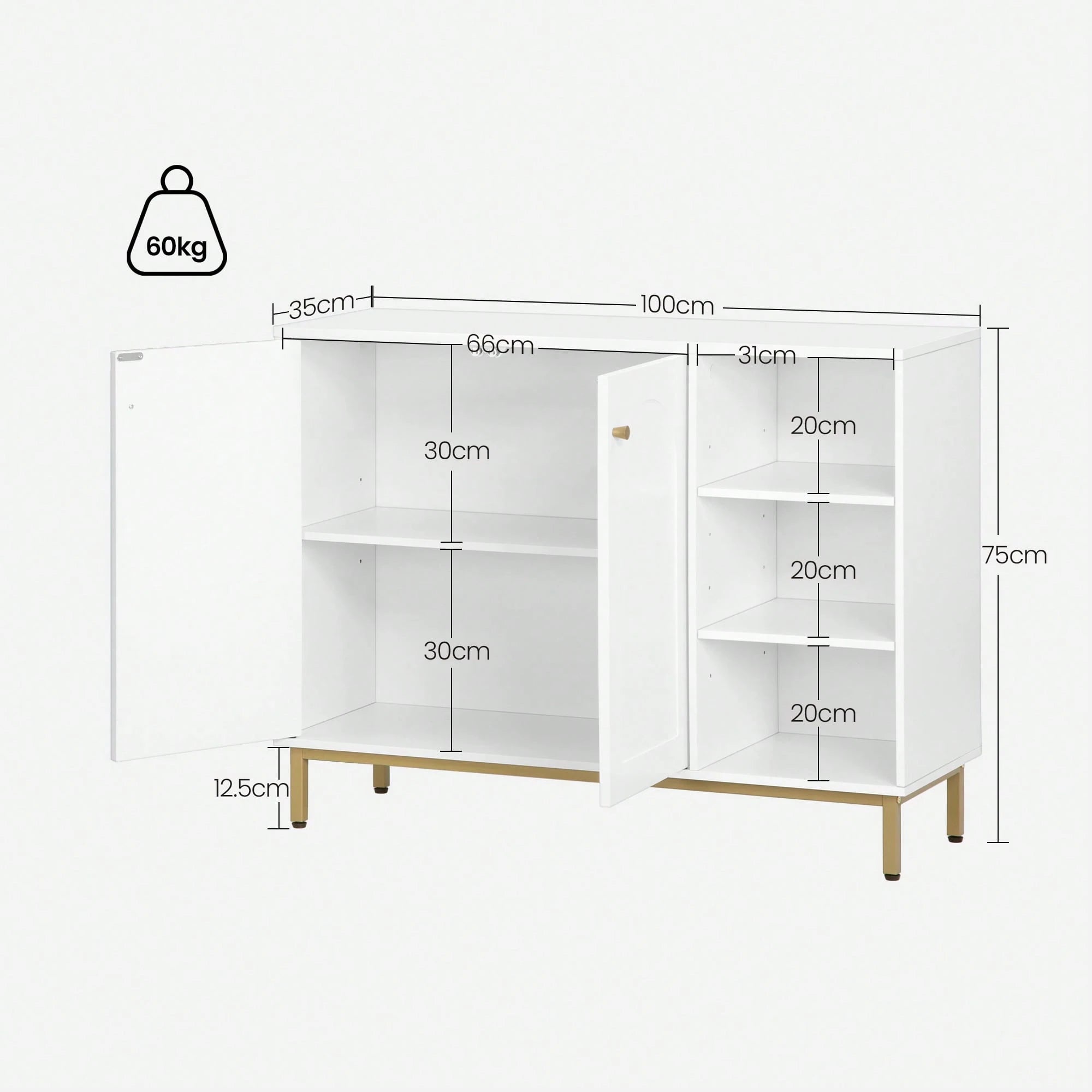 • Dotato di 3 ripiani aperti regolabili e 2 ante pratiche, offre una capacità di