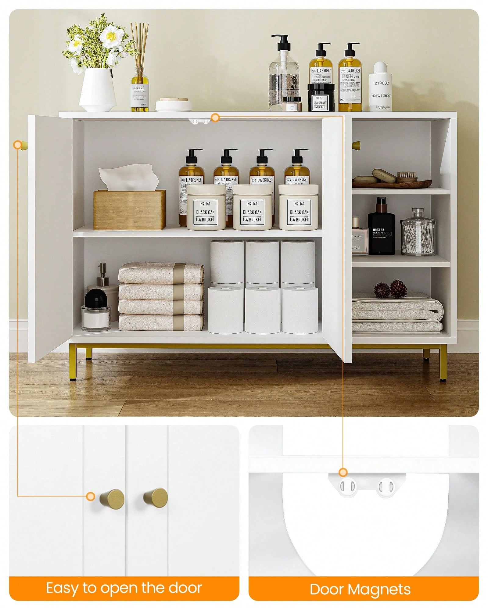 Trasforma il tuo spazio con questo mobile da bagno versatile e intelligente! Dotato di 3 ripiani aperti regolabili e 2 ante pratiche, offre una capacità di stoccaggio generosa per organizzare tutto ciò che serve.  Perfetto per il bagno, ma anche per il soggiorno, l'ingresso o la cucina, questo armadietto autoportante...