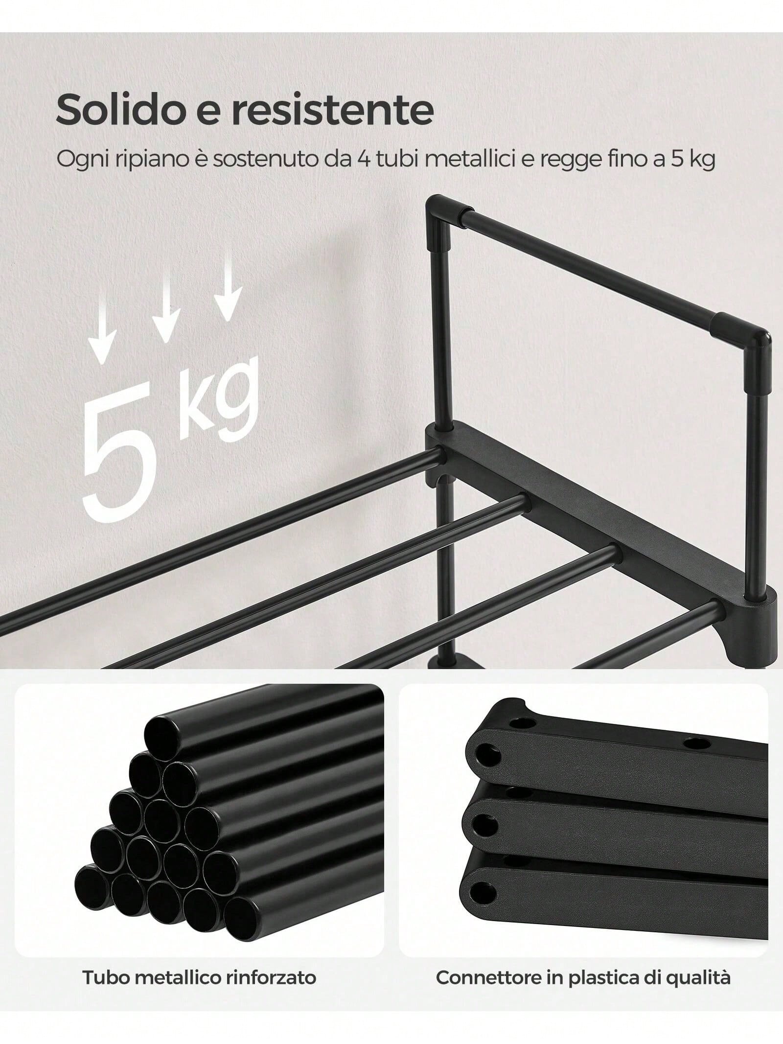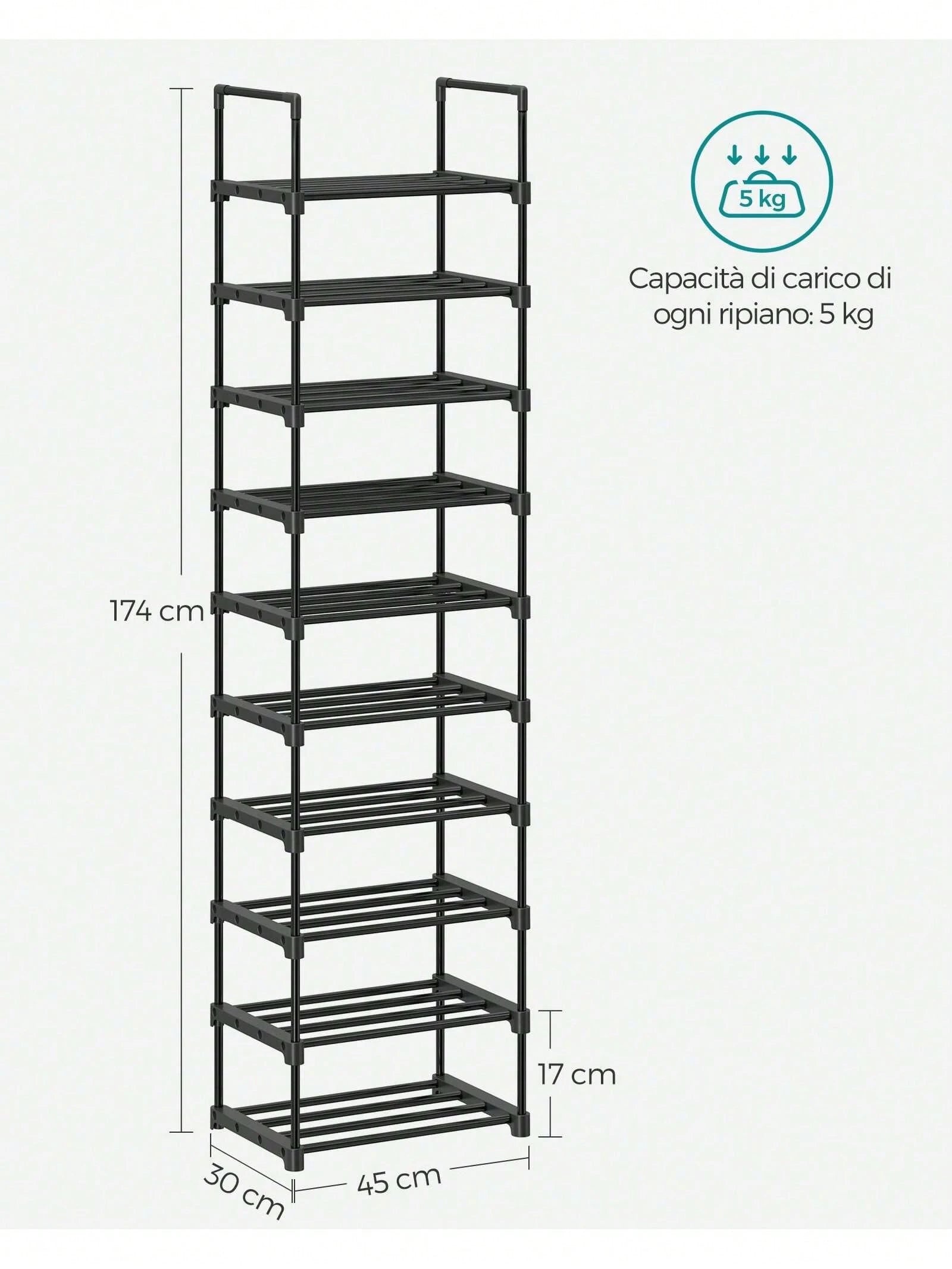 Scarpiera in metallo con 10 ripiani spaziosi, ideale per organizzare e conservare scarpe in modo ordinato. La struttura compatta (45 x 30 x 174 cm) si adatta perfettamente a ingressi, soggiorni, camere da letto e cucine senza occupare troppo spazio. Realizzata in robusto metallo nero, offre stabilità e durabilità nel...