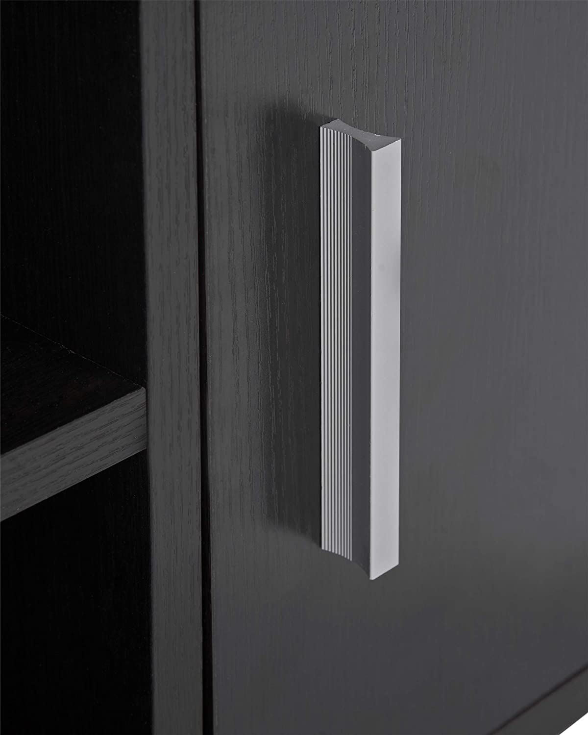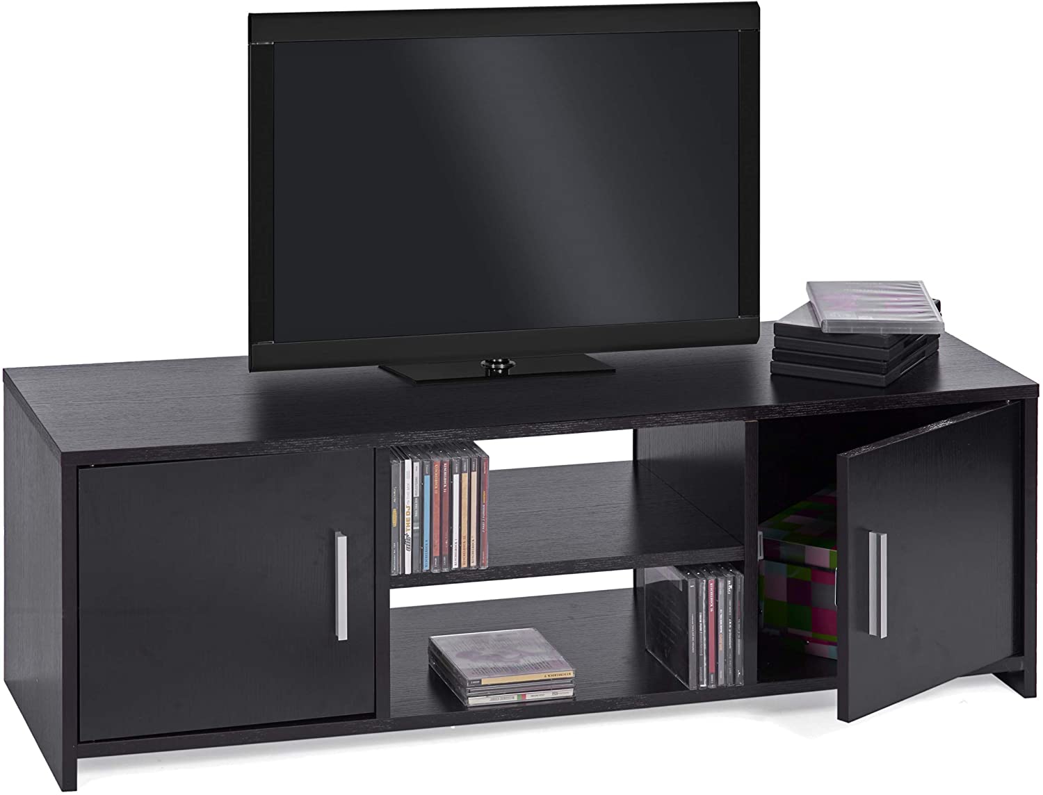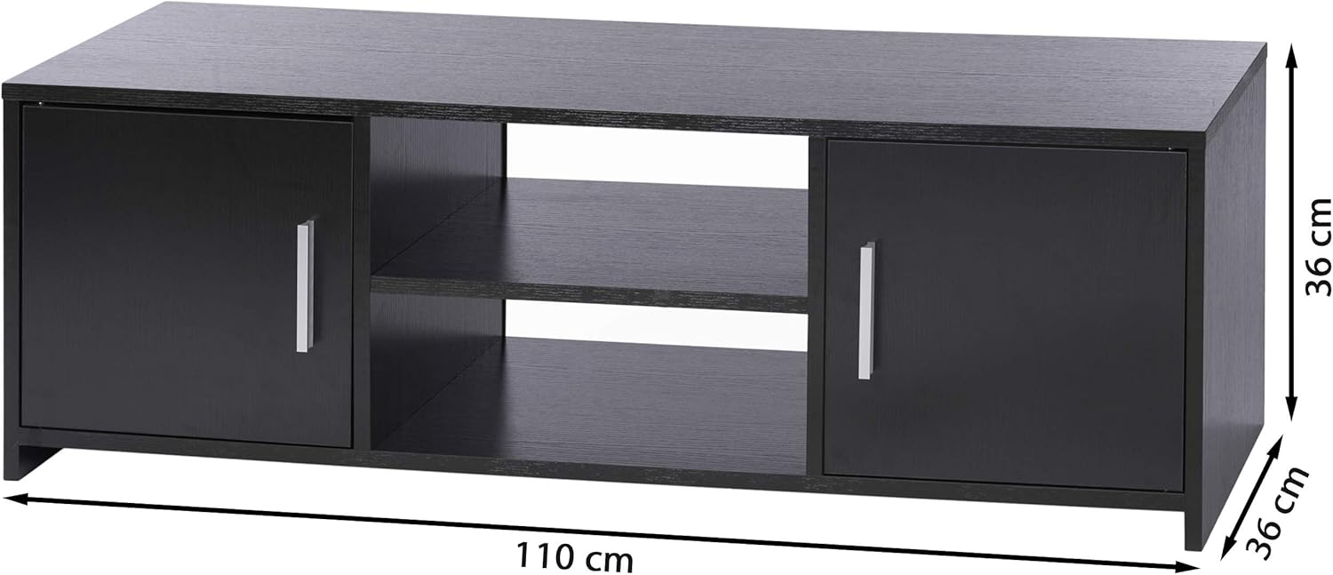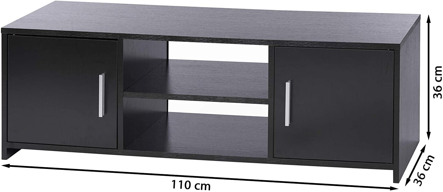 Il mobile TV è diviso in due scomparti con un ripiano e due ante con maniglie in metallo, offrendo spazio sufficiente per ricevitori, lettori Blu-Ray o film preferiti.