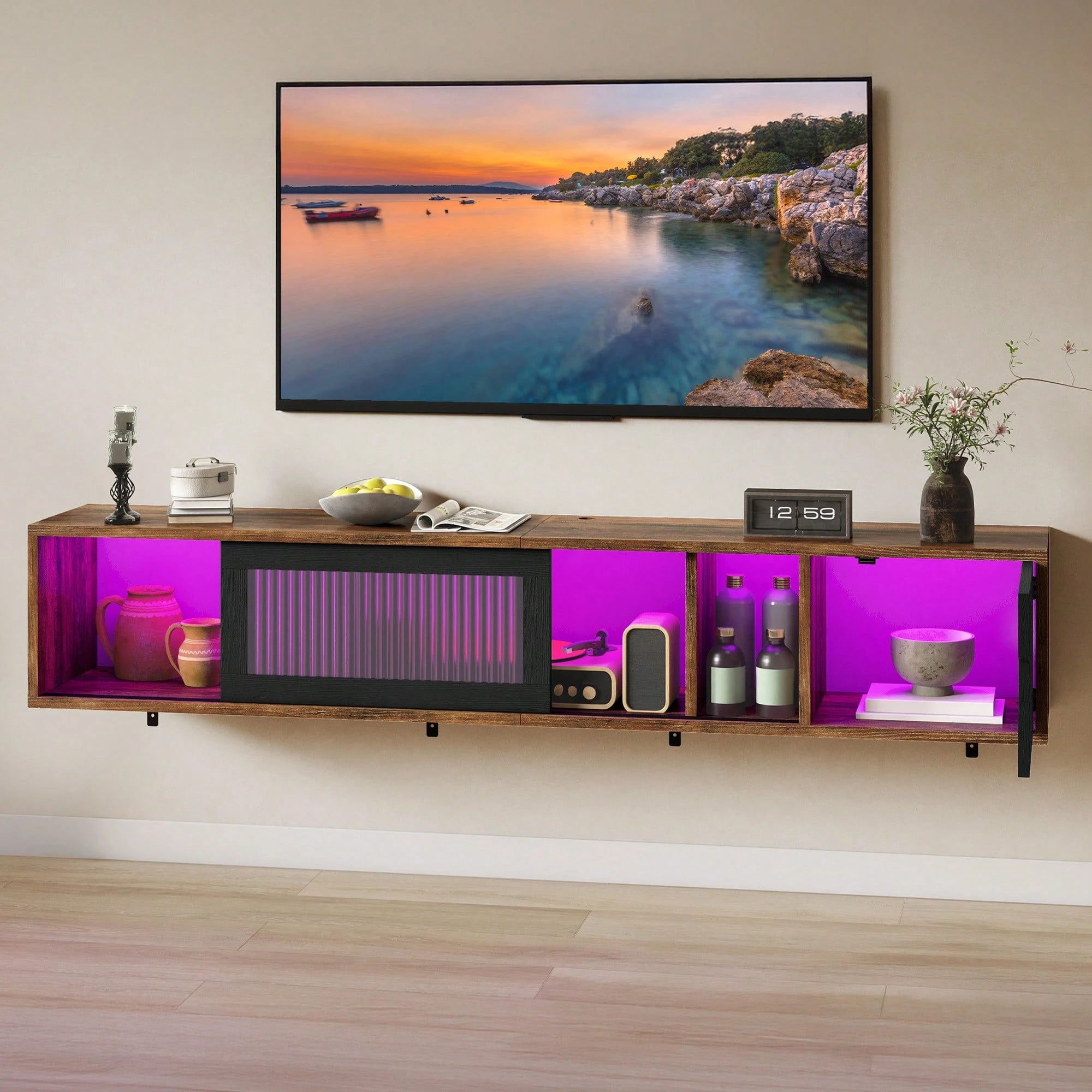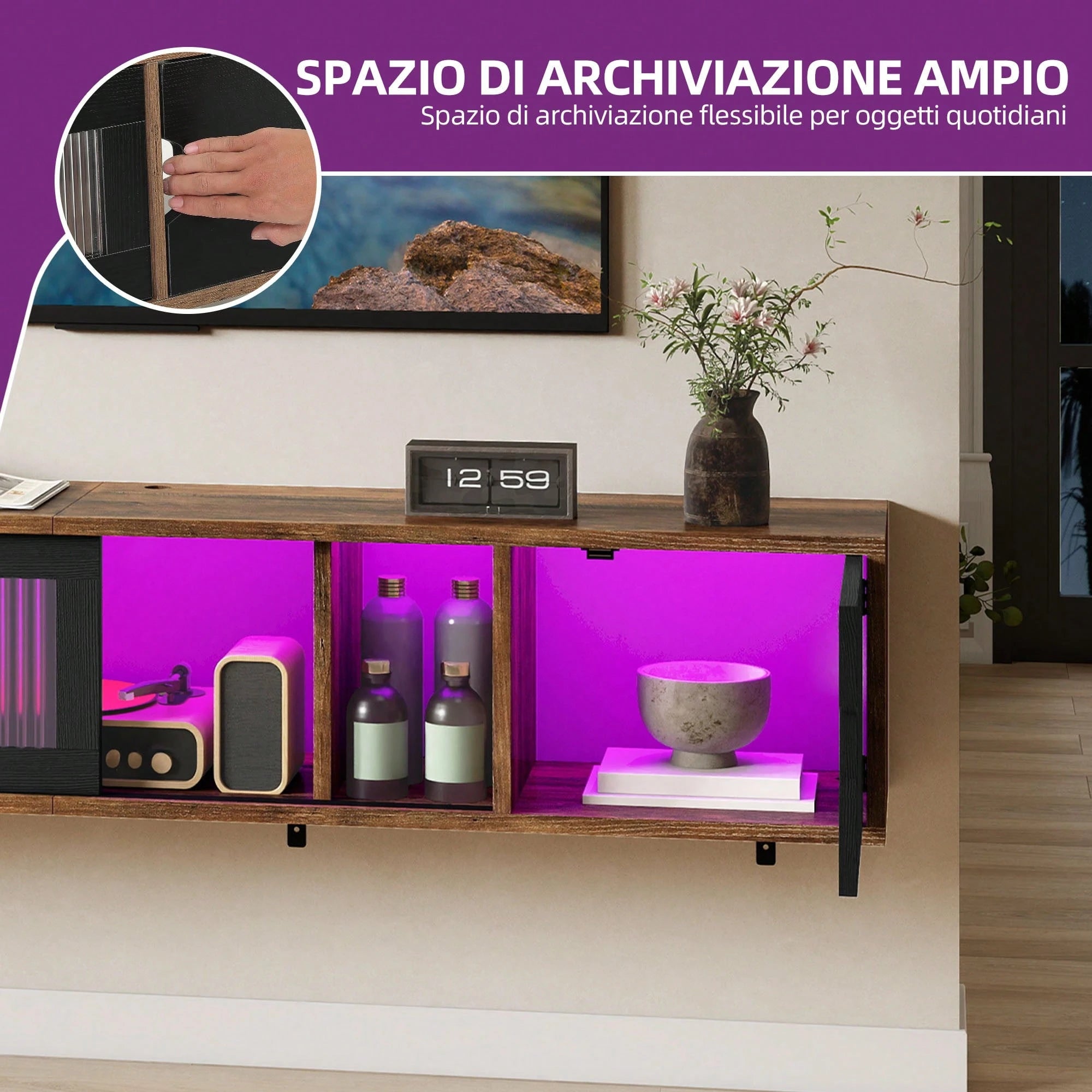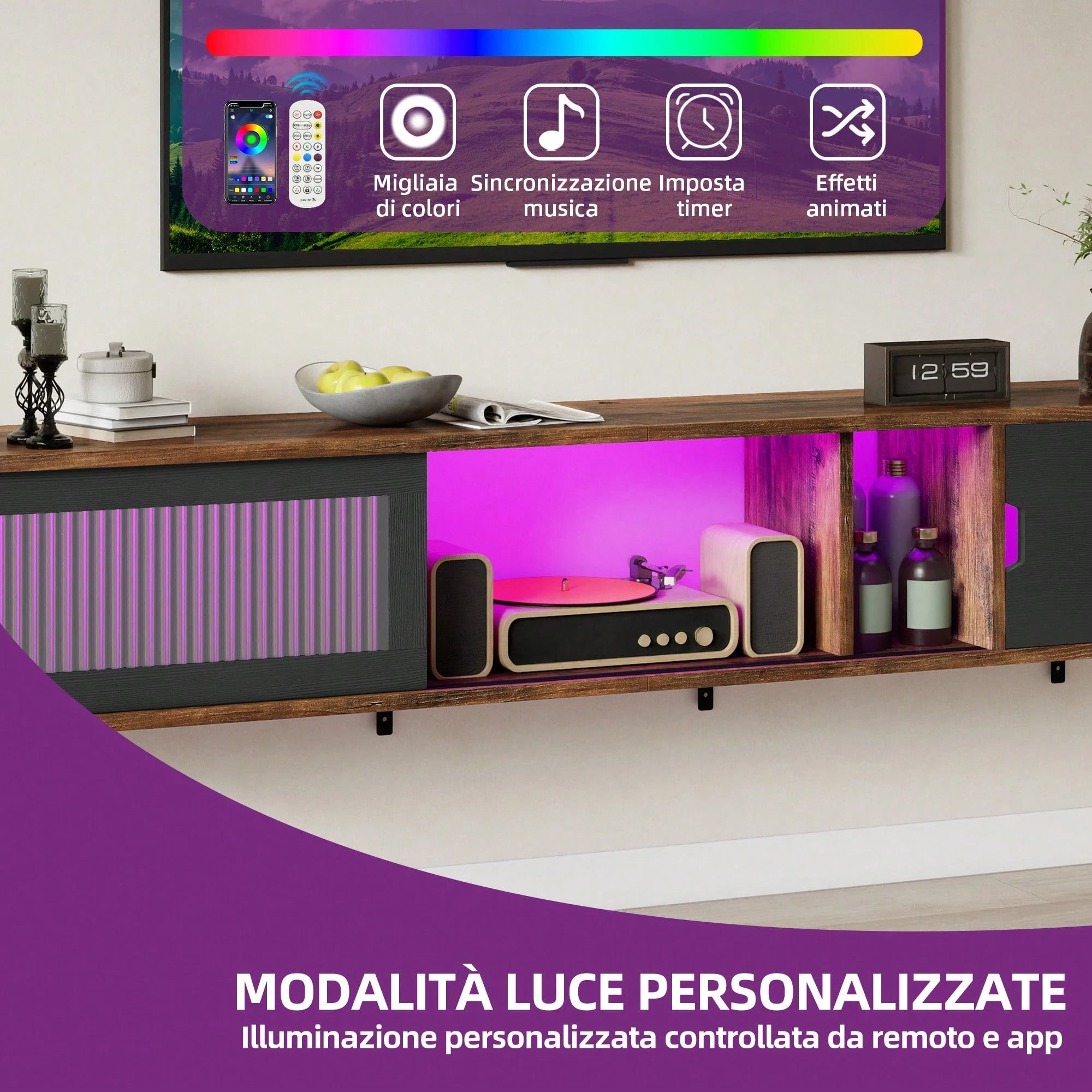 Questo mobile TV sospeso da 148 cm accoglie TV fino a 65 pollici e vanta 7 LED RGB