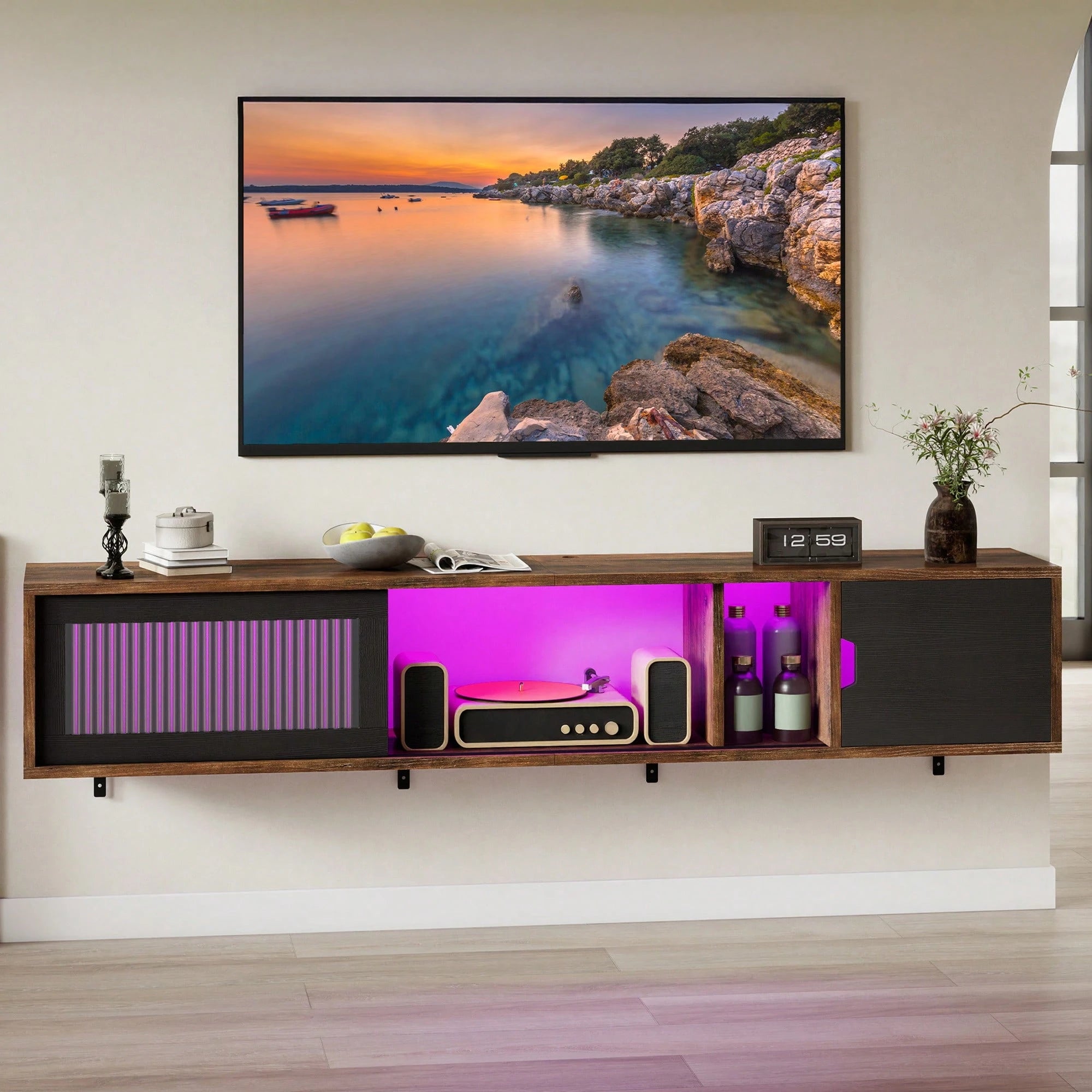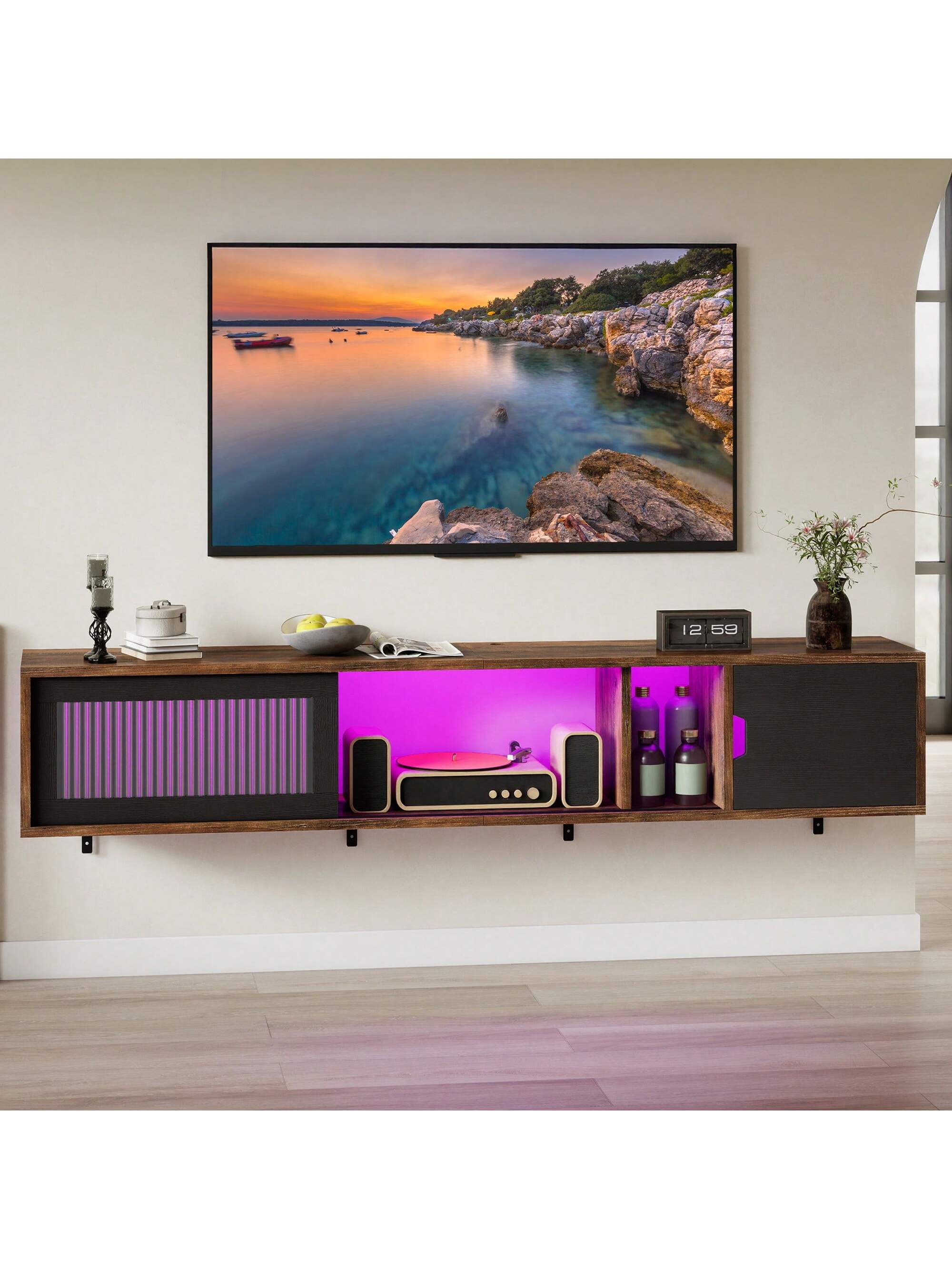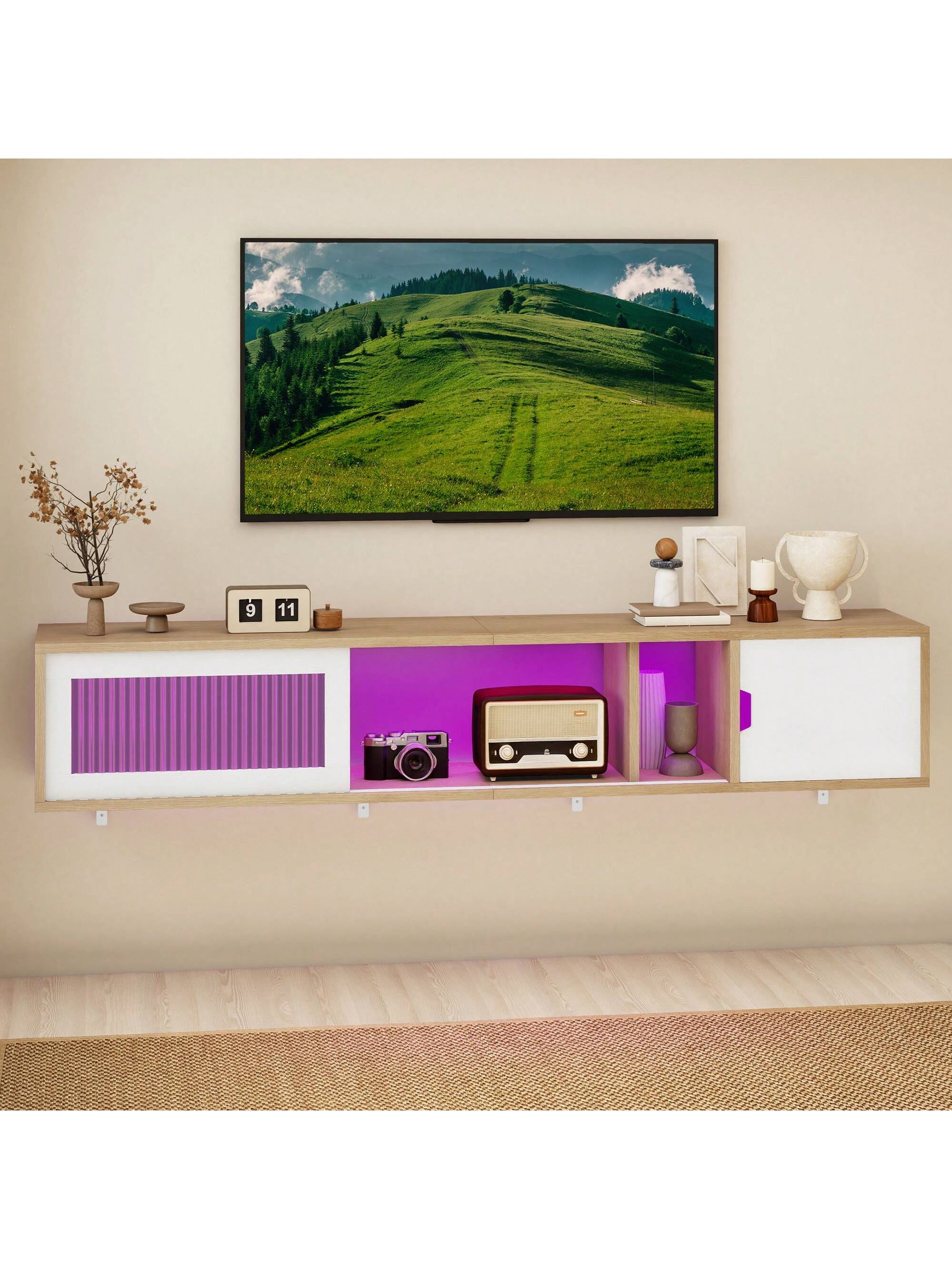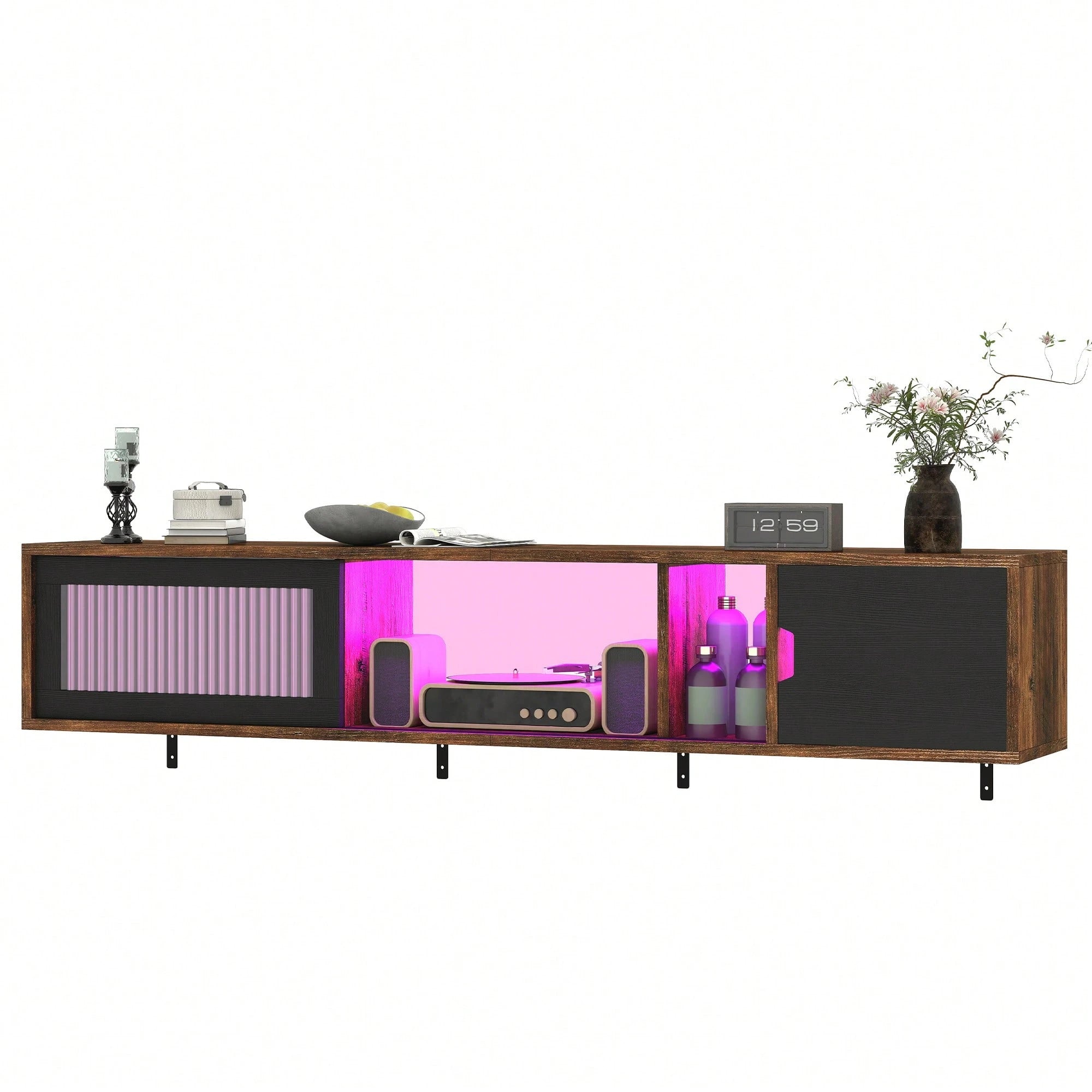 Questo mobile TV sospeso da 148 cm accoglie TV fino a 65 pollici e vanta 7 LED RGB