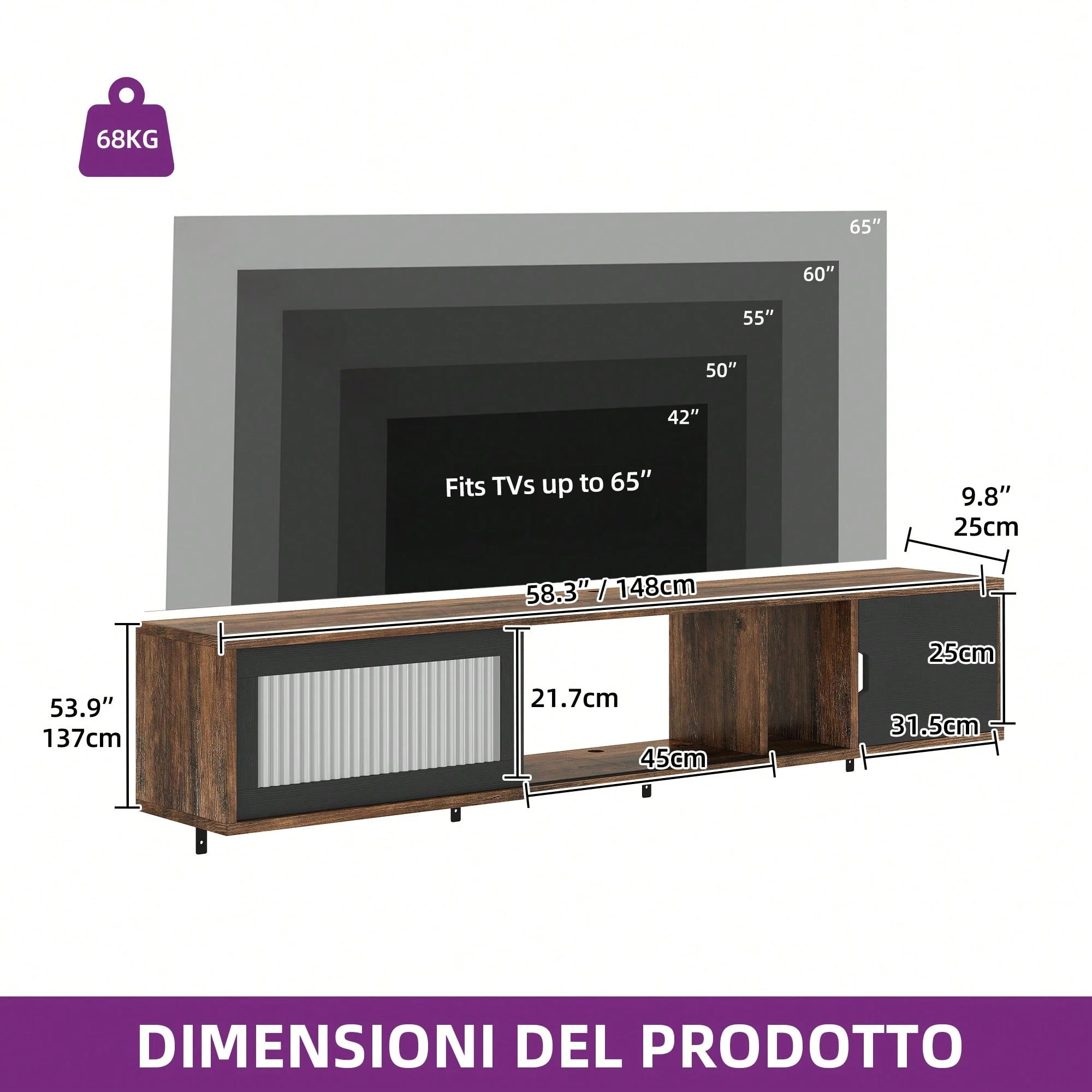 Mobile TV sospeso 148 cm – Per TV fino a 65 pollici con 7 LED RGB (22 modalità)
