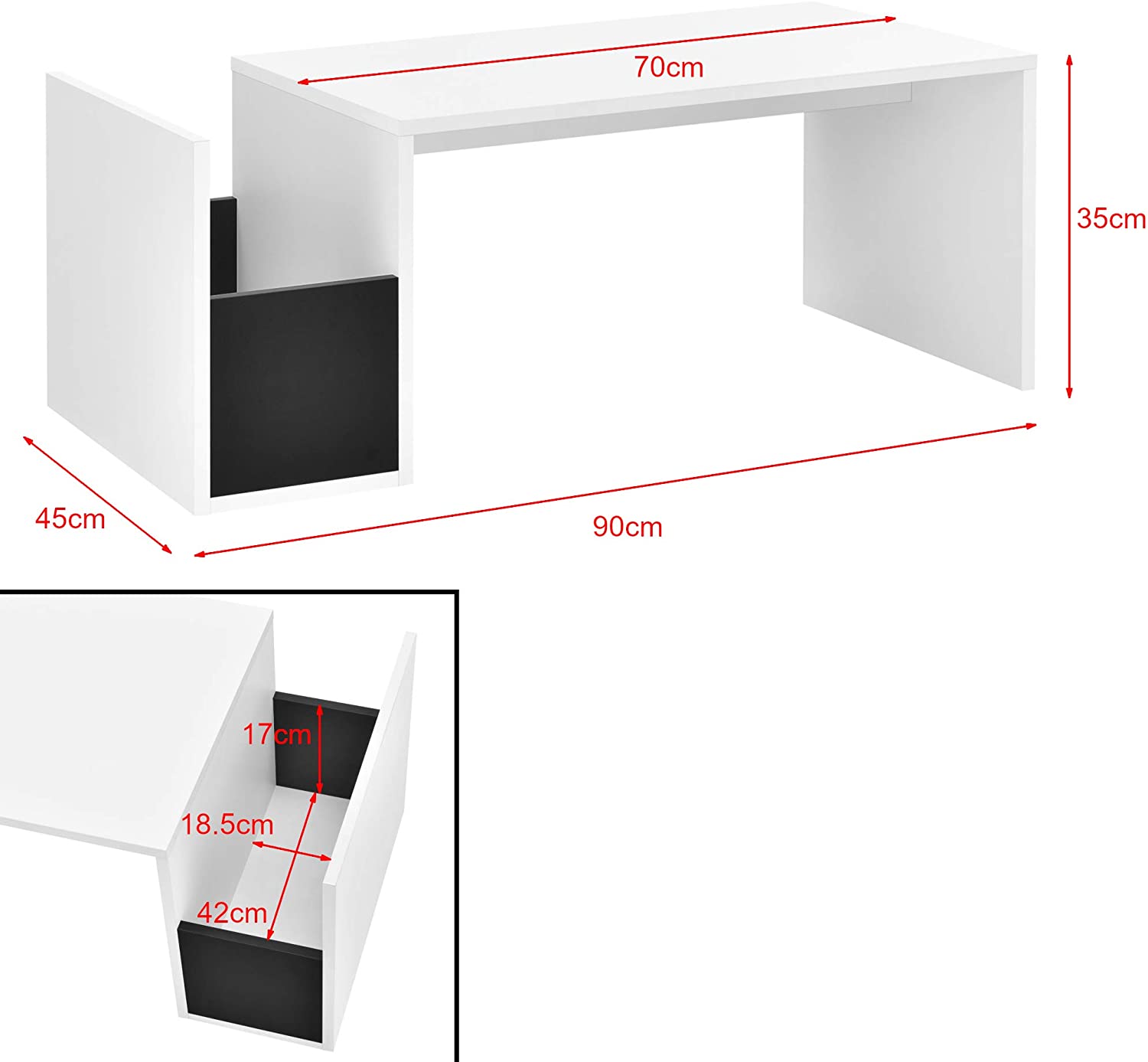 - Misure: totale (Lu x La x A): 90 x 45 x 35 cm - lunghezza del piano tavolo: 70cm interno del contenitore (Lu x La x A): 42 x 18,5 x 17/35 cm - spessore del piano tavolo: 1,5 cm