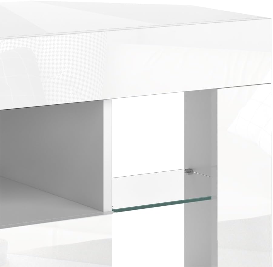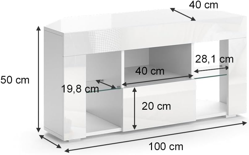 Colore: bianco, lucido. Dimensioni: 100 x 50 x 40 cm (larghezza x altezza x profondità). Peso: 23,1 kg. Materiale: (Corpo: truciolato, 16 mm, rivestimento in resina melamminica. Ripiani: vetro)
