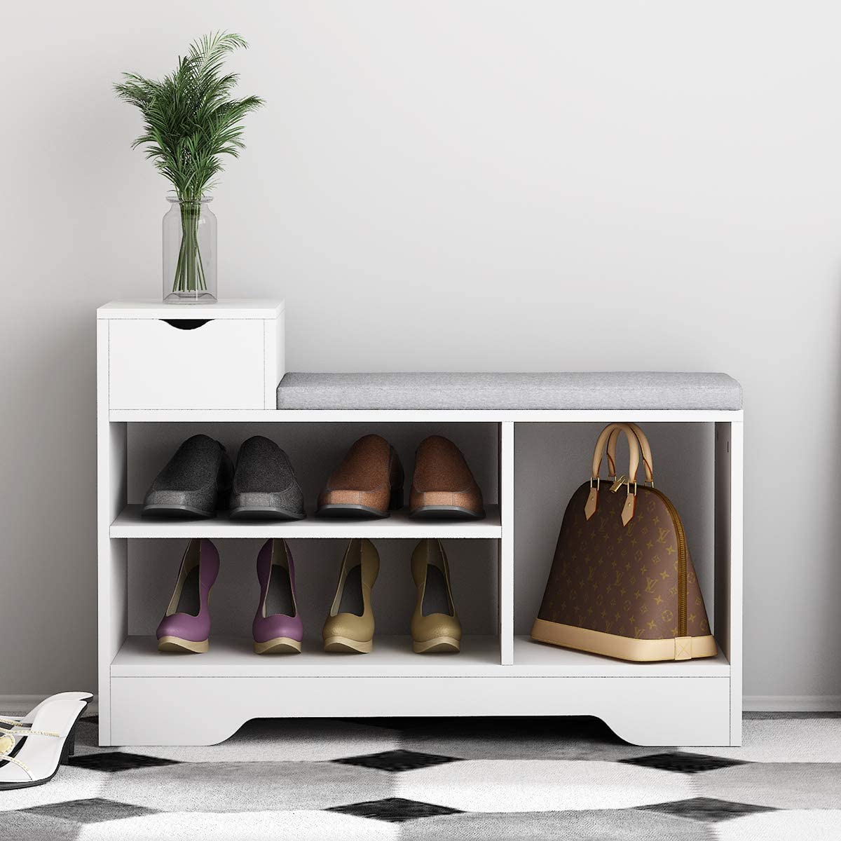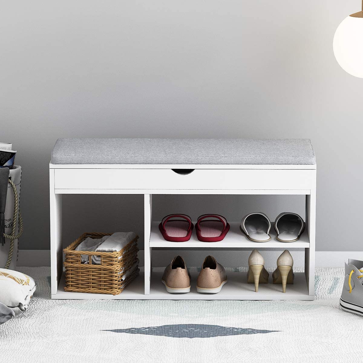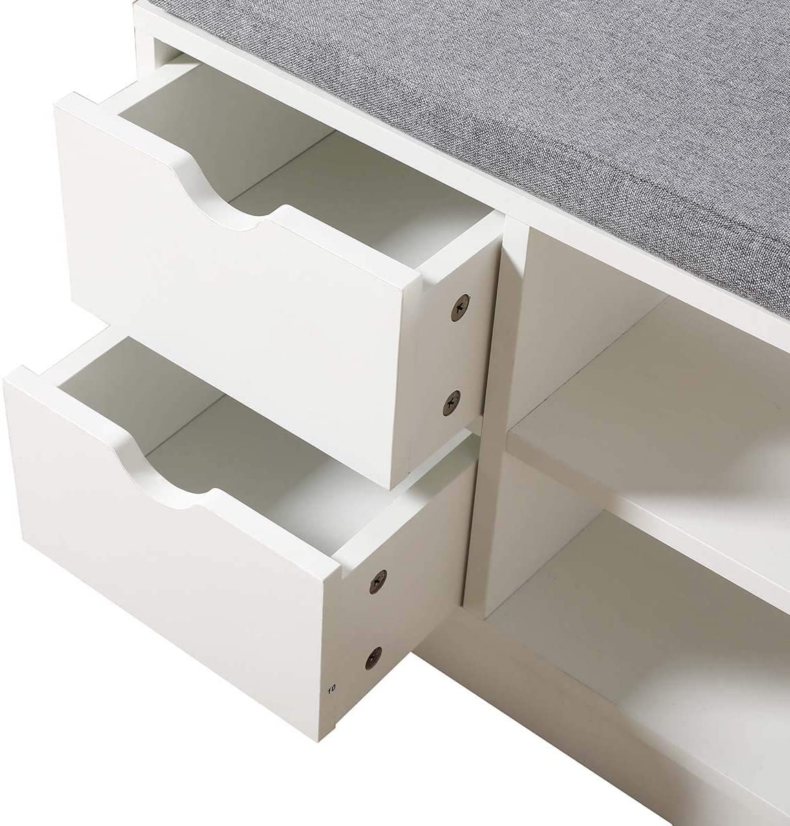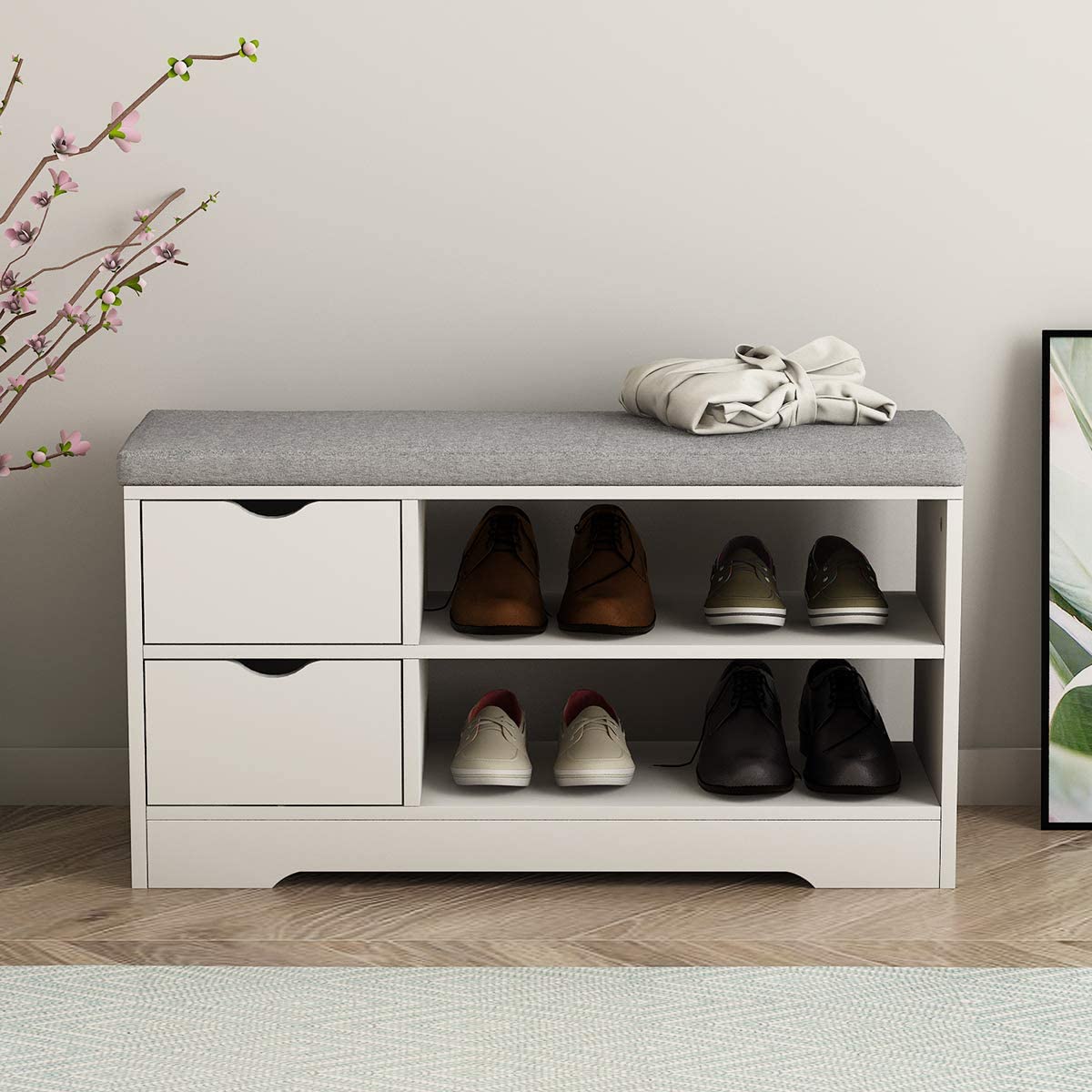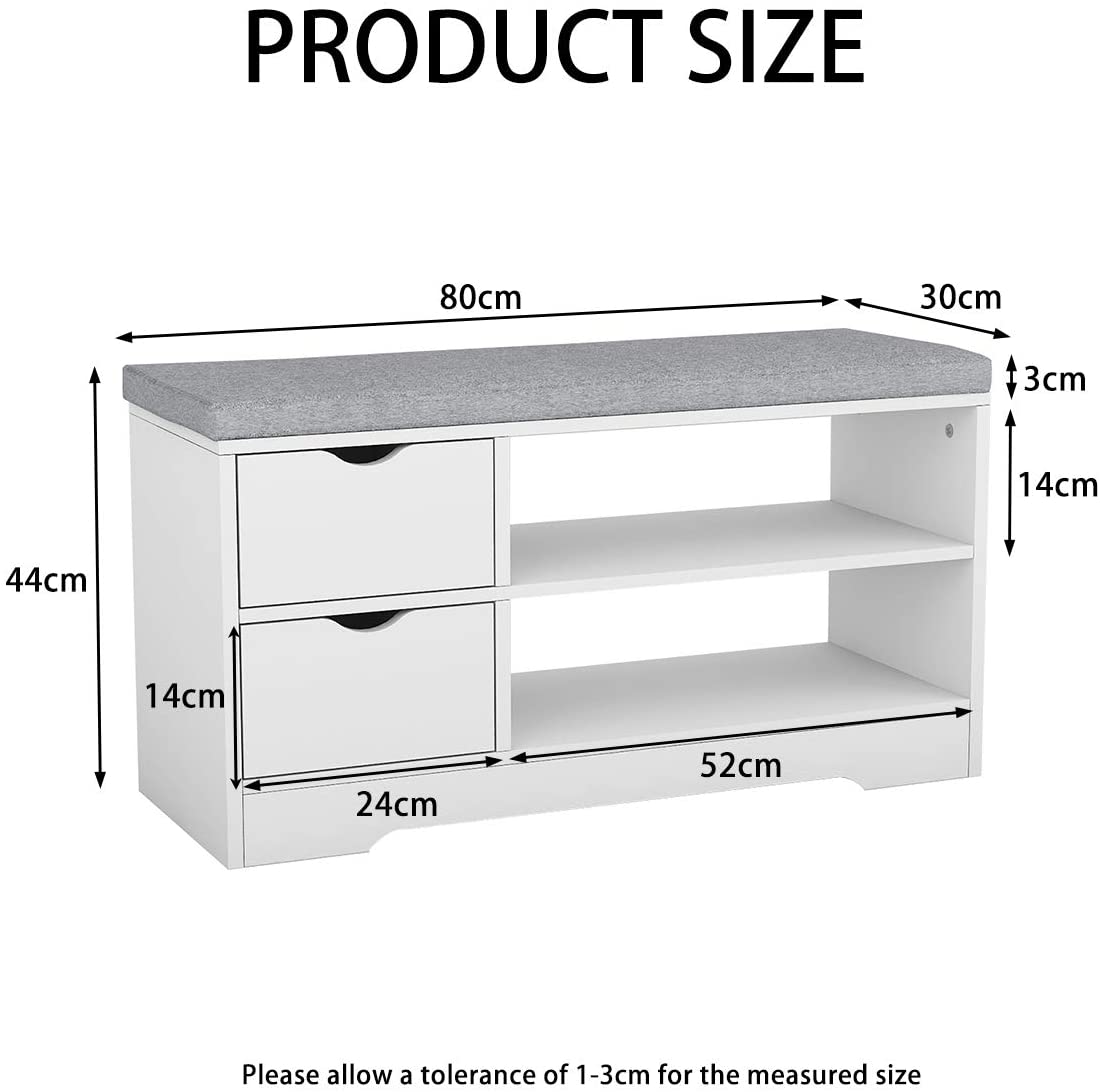 Panca Scarpiera ingresso Bianco in Legno con 2 Cassetto e Cuscino di Seduta Mobili