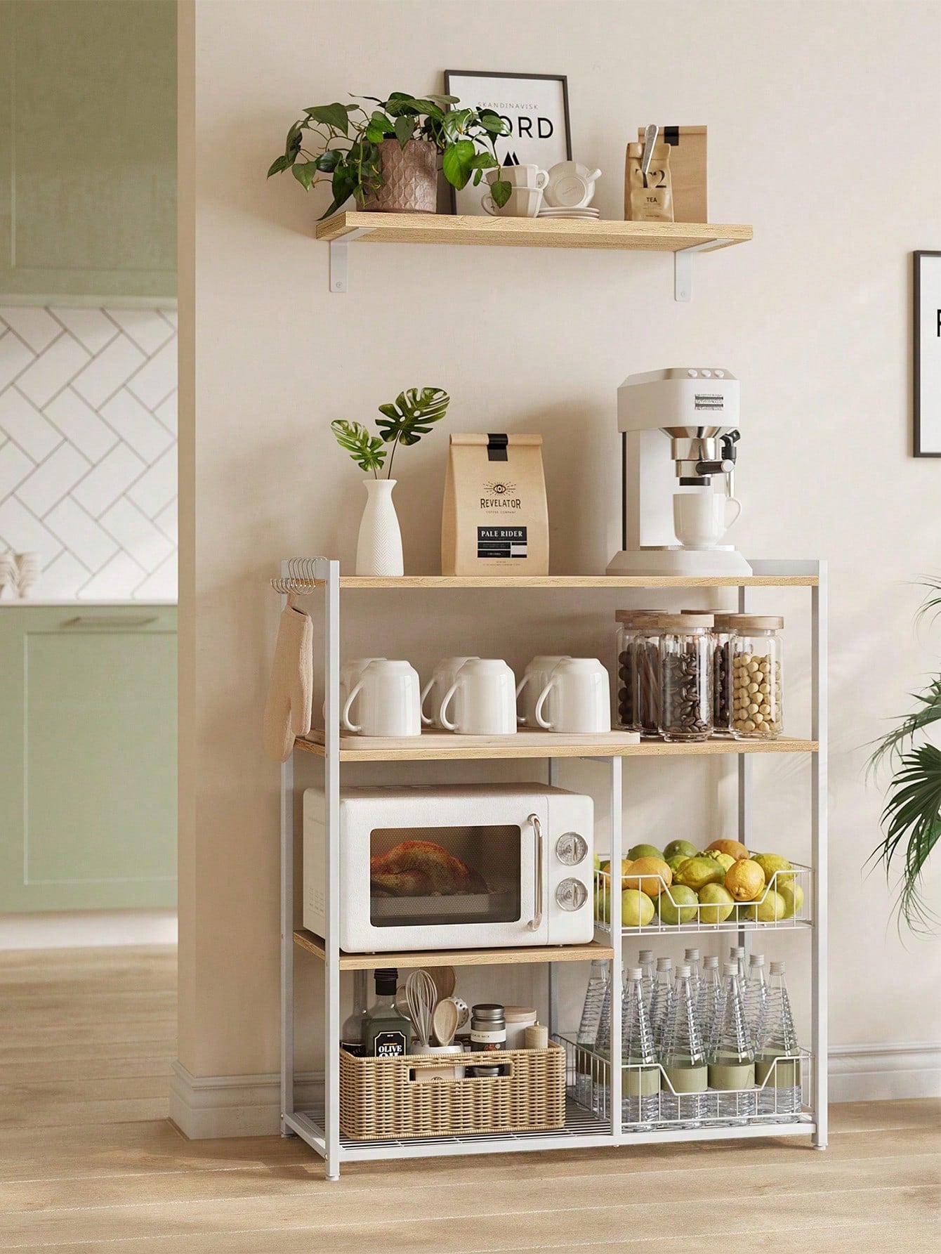 Scaffale multifunzionale per microonde e organizzazione cucina. Struttura robusta da 80 x 35 x 95 cm con piano d'appoggio superiore, due ripiani regolabili e due cesti in rete metallica estraibili per massimizzare lo spazio.  Dotato di ganci laterali per appendere utensili e accessori.  Disponibile in quattro combinazioni di colori: Marrone...