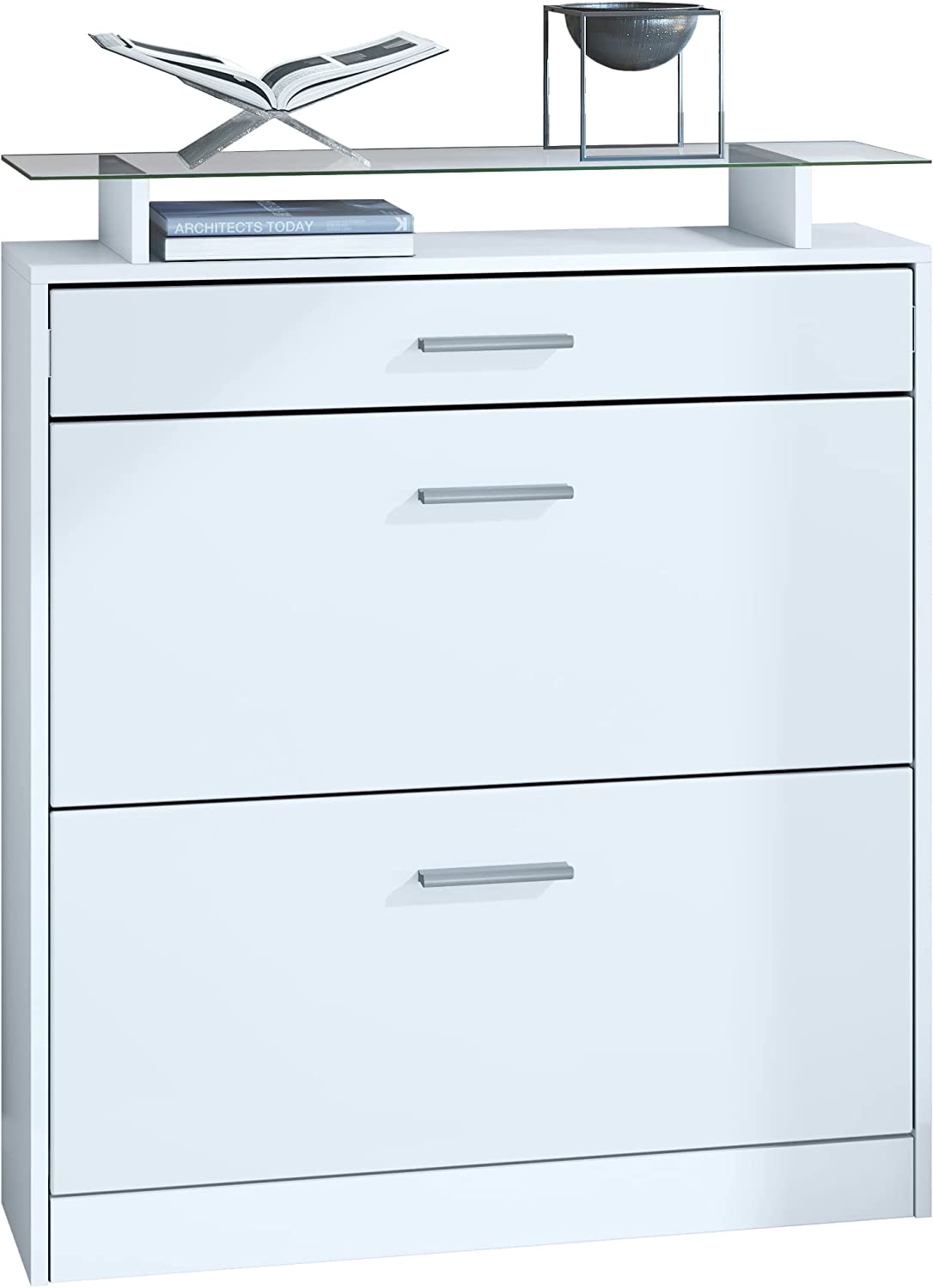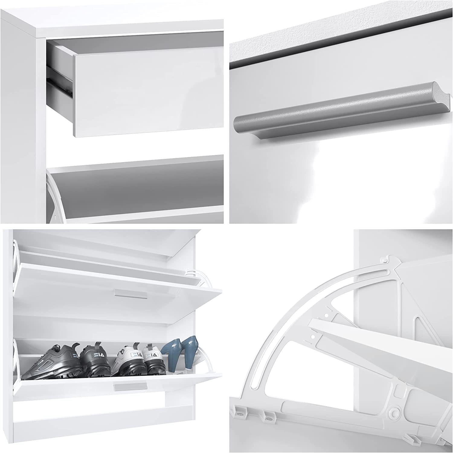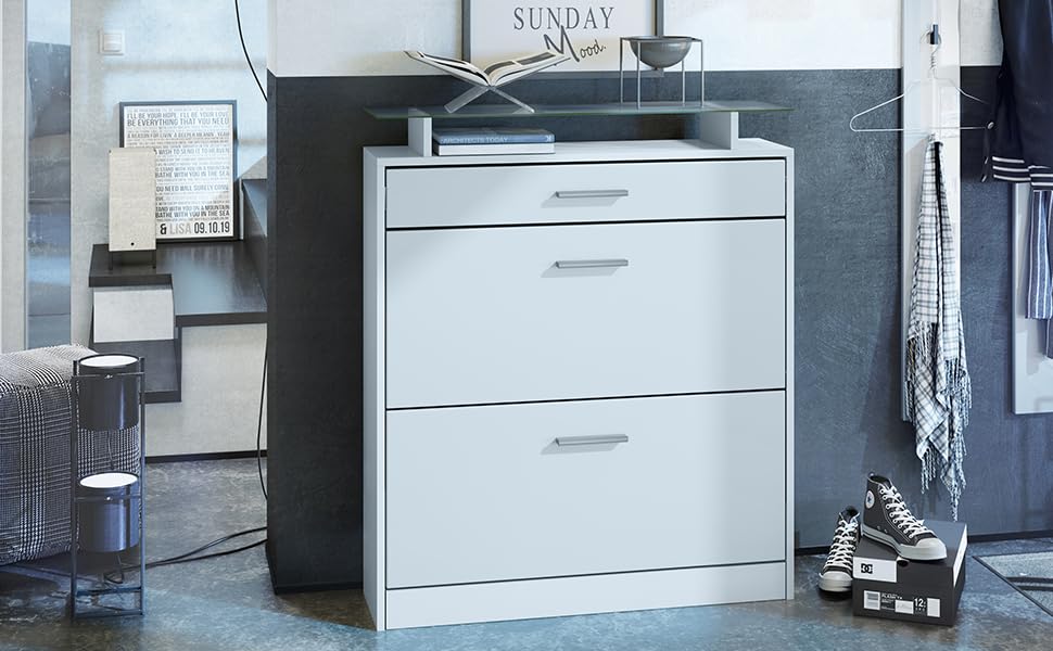 La scarpiera salvaspazio si presenta come un pratico mobile dal design moderno per l'ingresso. La scarpiera sottile è dotata di due ganci per scarpe con doppi supporti e di un cassetto scorrevole. Inoltre, il ripiano in vetro sulla scarpiera offre spazio per diversi accessori. Con le guarnizioni incluse è...