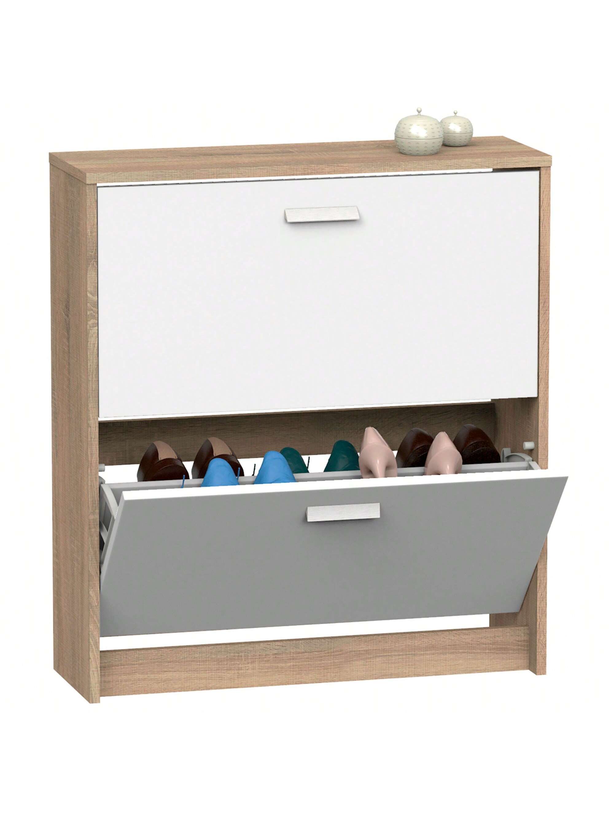 - Dispone di 2 ante a ribalta con ferramenta in ABS resistente che permettono di organizzare le scarpe in 2 file per ogni anta, offrendo una capacità fino a 12 paia.
