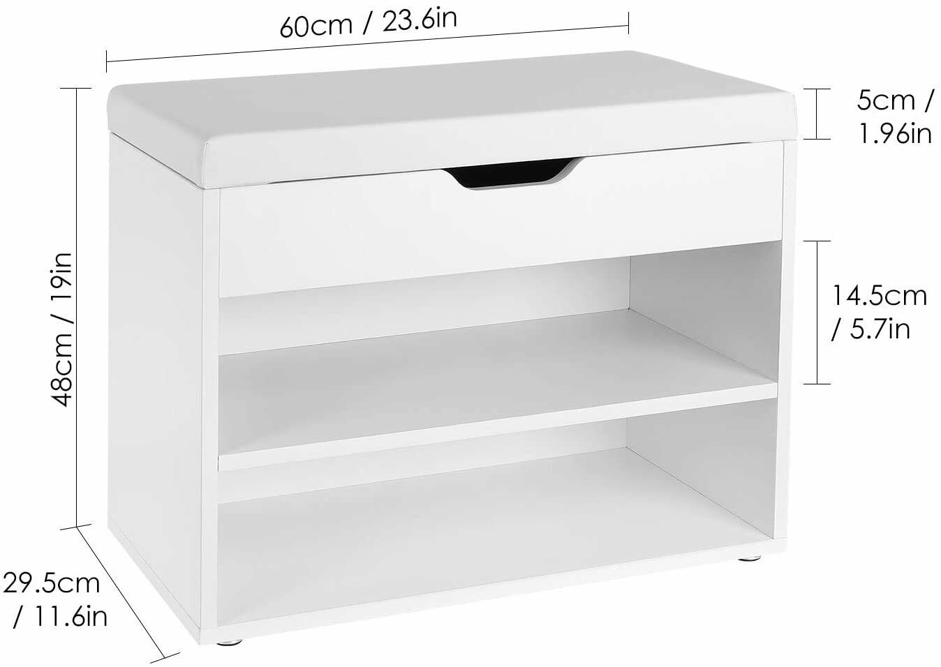 • 【Disegno】:il cuscino ha uno spessore di circa 5 cm e ti siedi molto comodamente sulla scarpiera. Ci sono piedini antiscivolo sotto la scarpiera per evitare danni al pavimento.