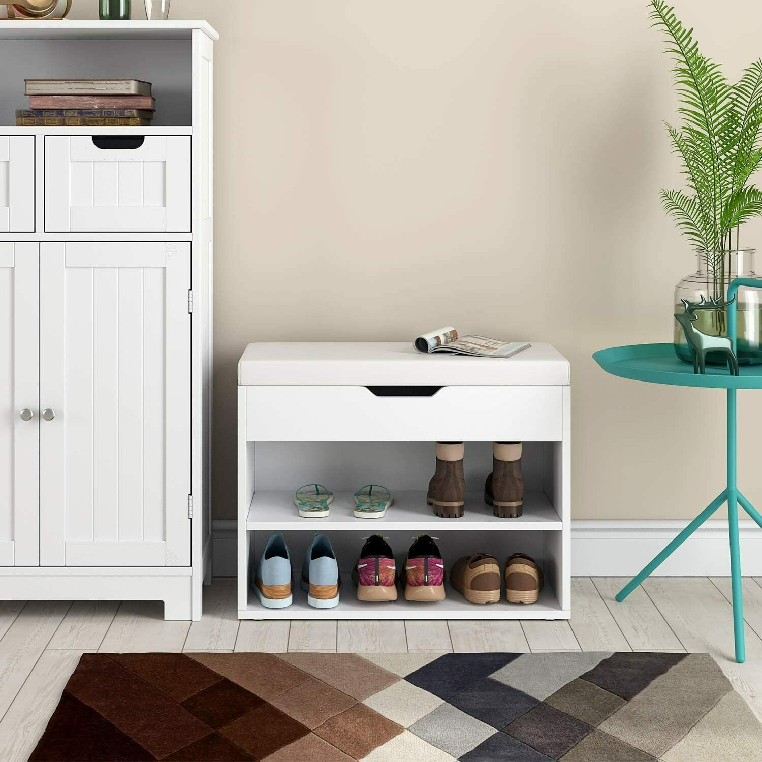 • 【Pratico】: questa scarpiera può essere utilizzata come sgabello o scarpiera. Dopo aver aperto il cuscino, c'è un piccolo spazio per cappelli e sciarpe ecc.