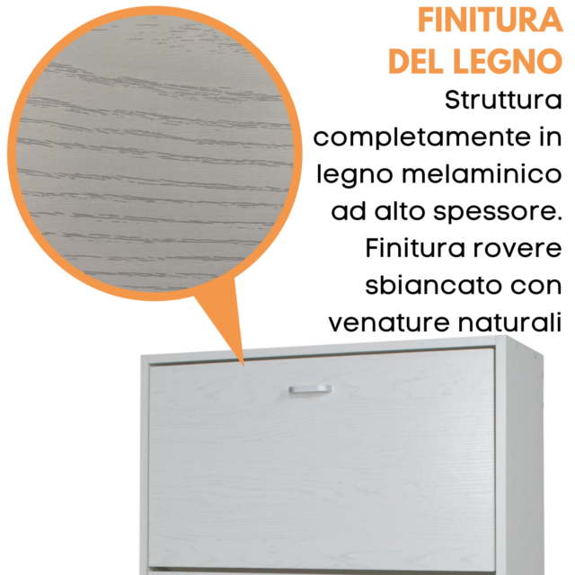 Scarpiera il legno melaminico ad alto spessore con raffinata finitura effetto rovere naturale. Questo mobile è un complemento d'arredo dall'elevata capienza (da 16 a 24 scarpe) e con pratiche ante ribalte a doppia profondità.