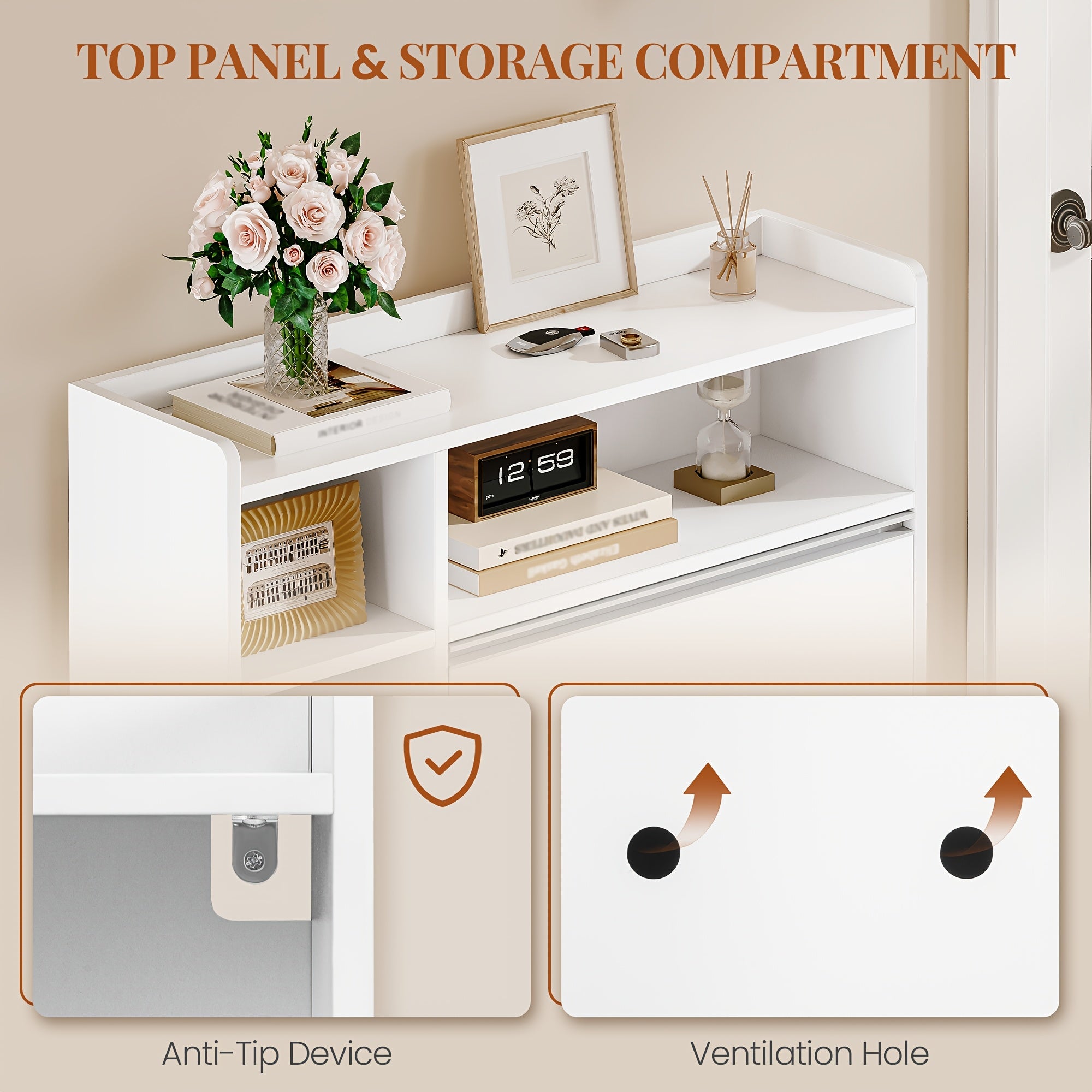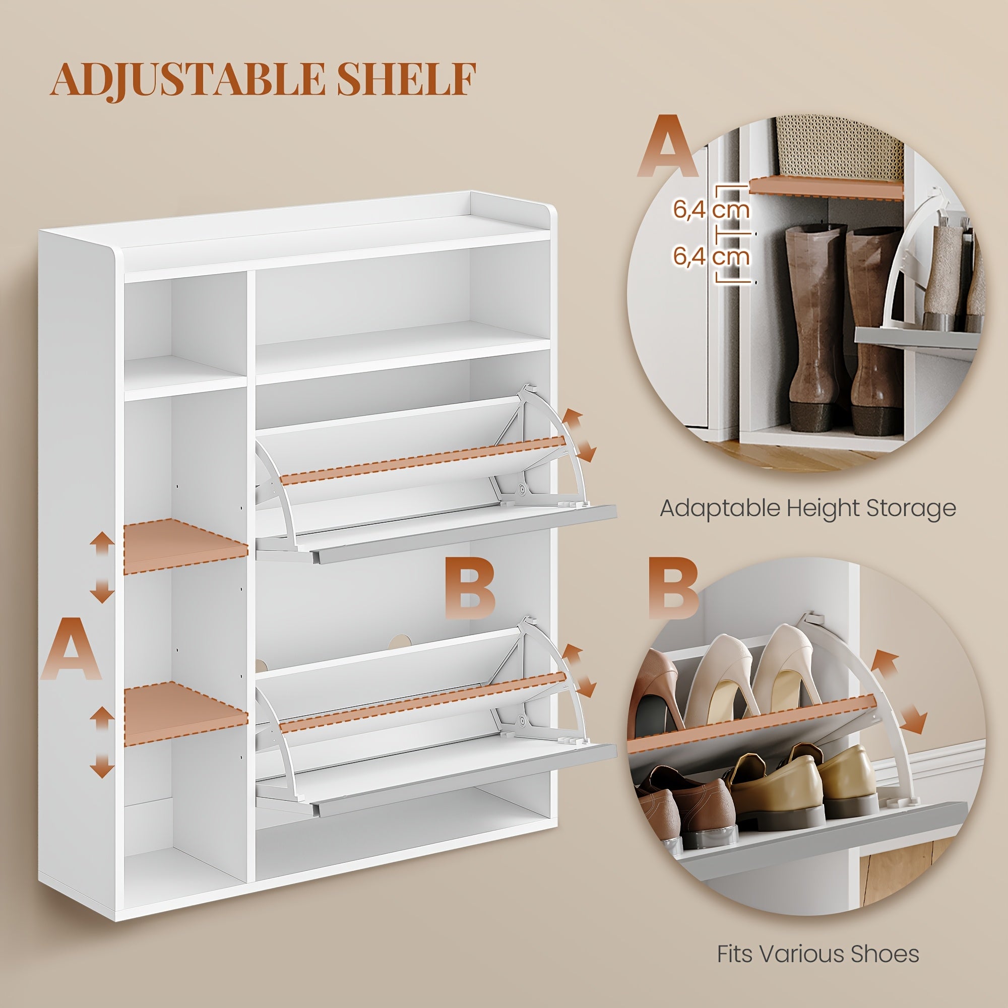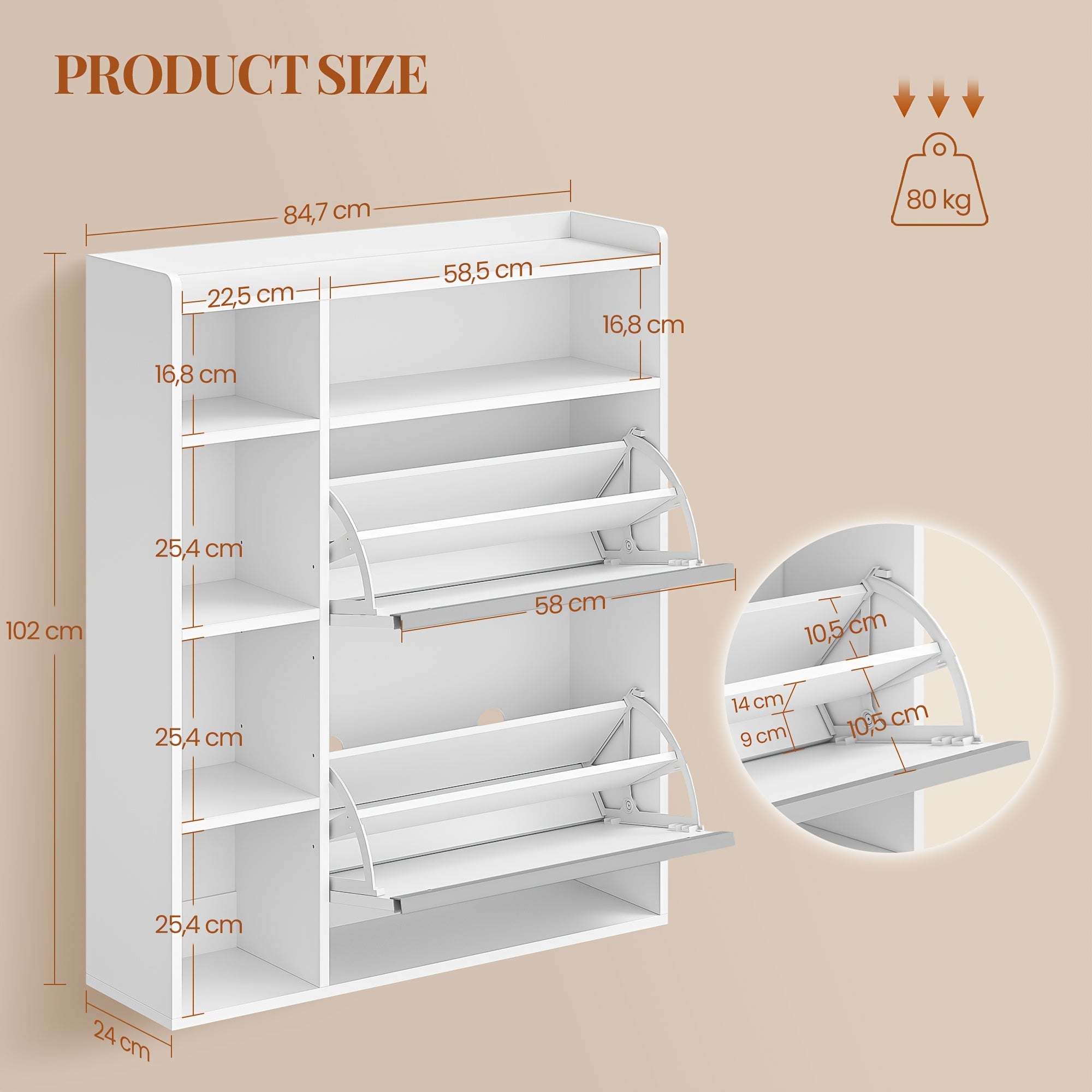 Scarpiera compatta e funzionale con design minimalista in bianco. Dotata di 2 ante e 5 scomparti aperti regolabili, offre spazio per 8-12 paia di scarpe mantenendo un ingombro ridotto.  Le dimensioni contenute (84.7 x 24 x 102 cm) la rendono ideale per ingressi, corridoi e spazi limitati.  La struttura regolabile...