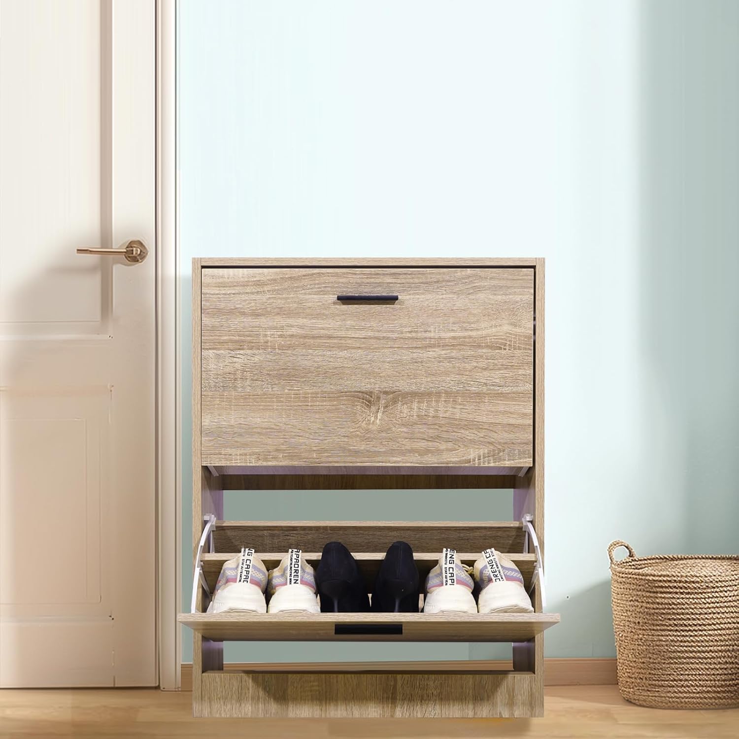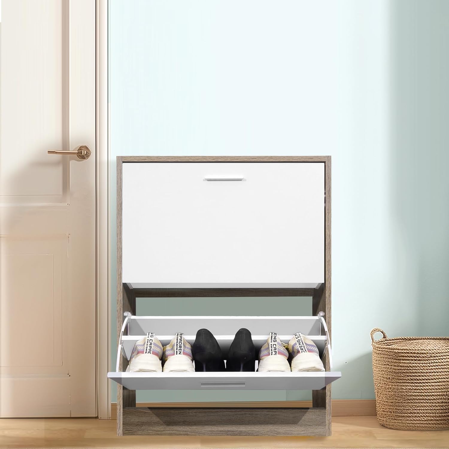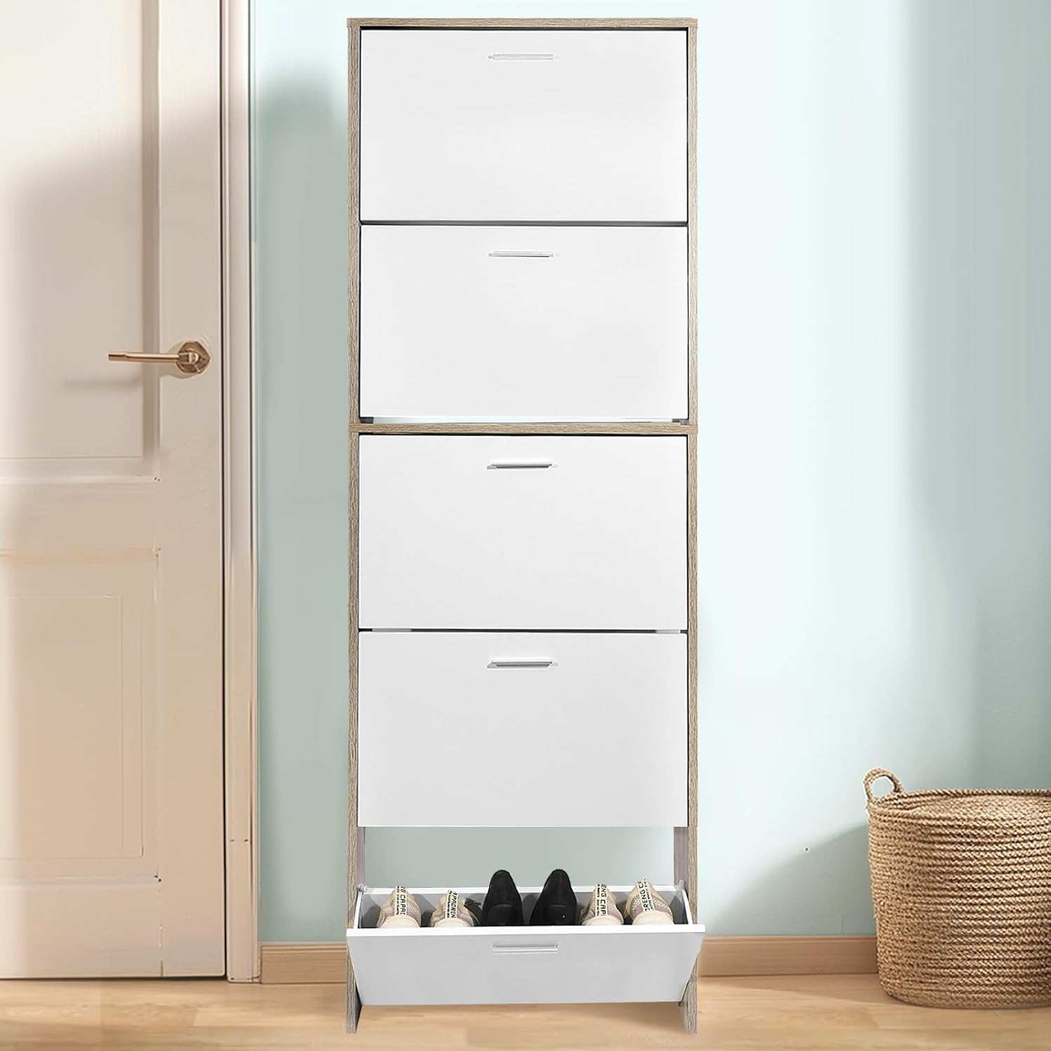 - Portascarpe bianco con bordi effetto faggio. Questo mobile dallo stile scandinavo e naturale
