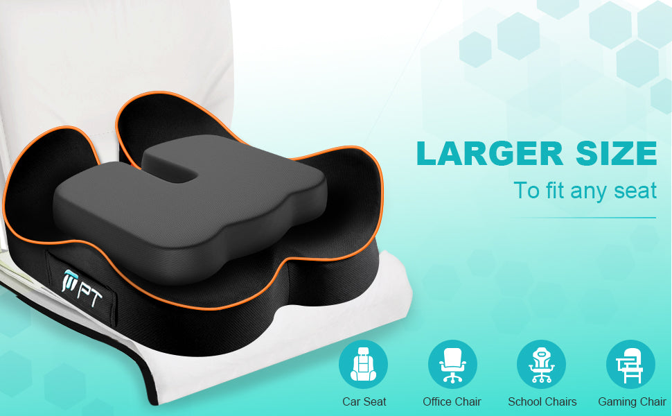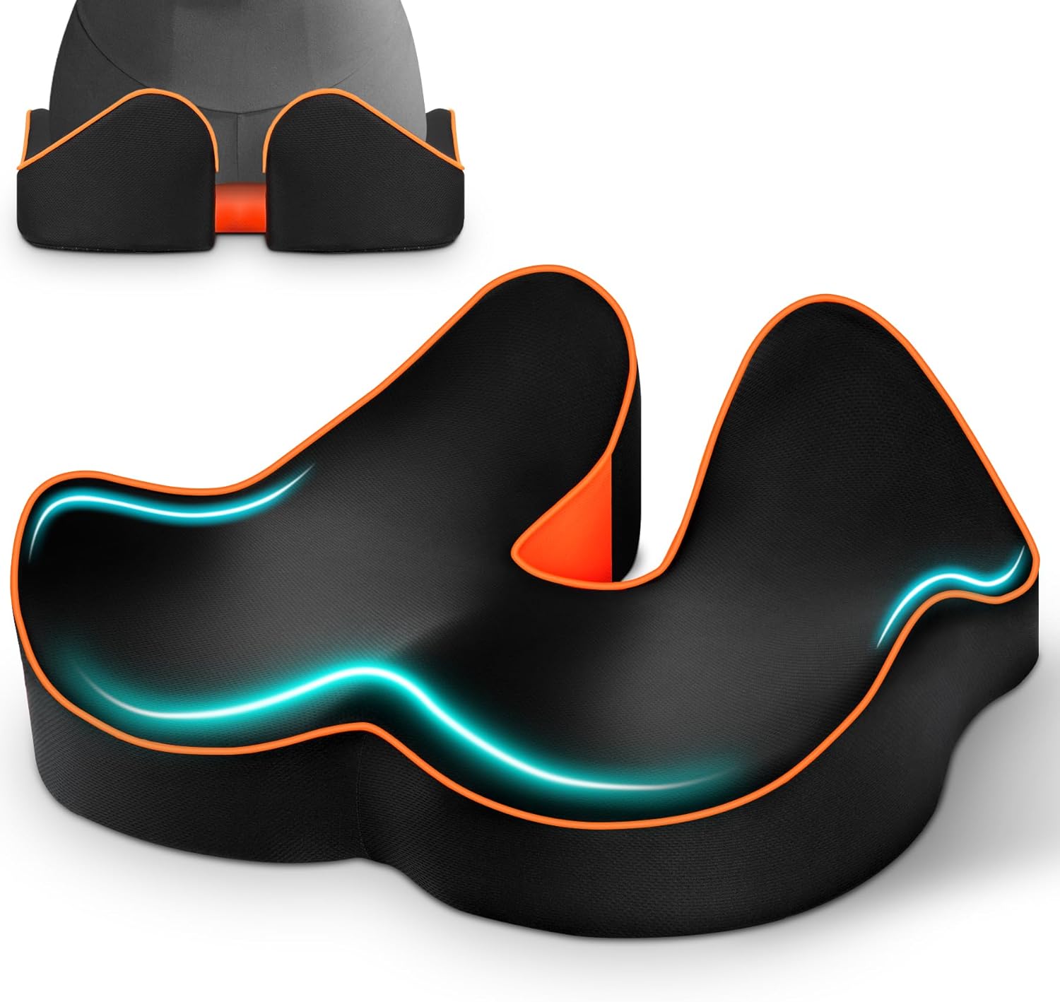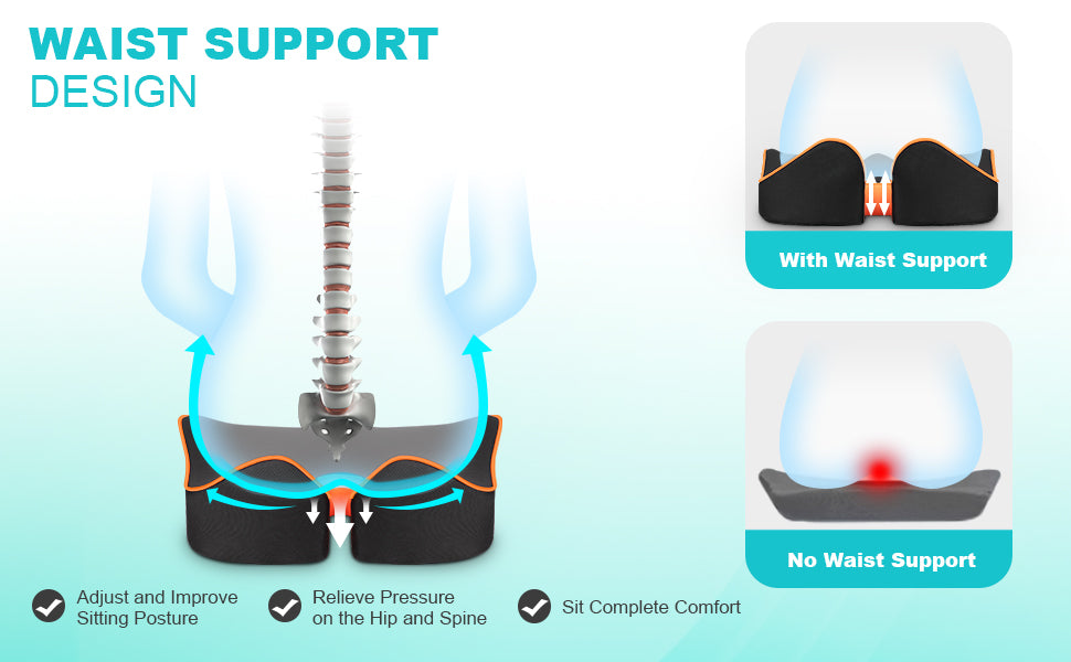 Design Ergonomico: Con una scanalatura a forma di U e ali laterali doppie concave. Il cuscino non solo riduce la pressione sul coccige e i sintomi delle emorroidi,