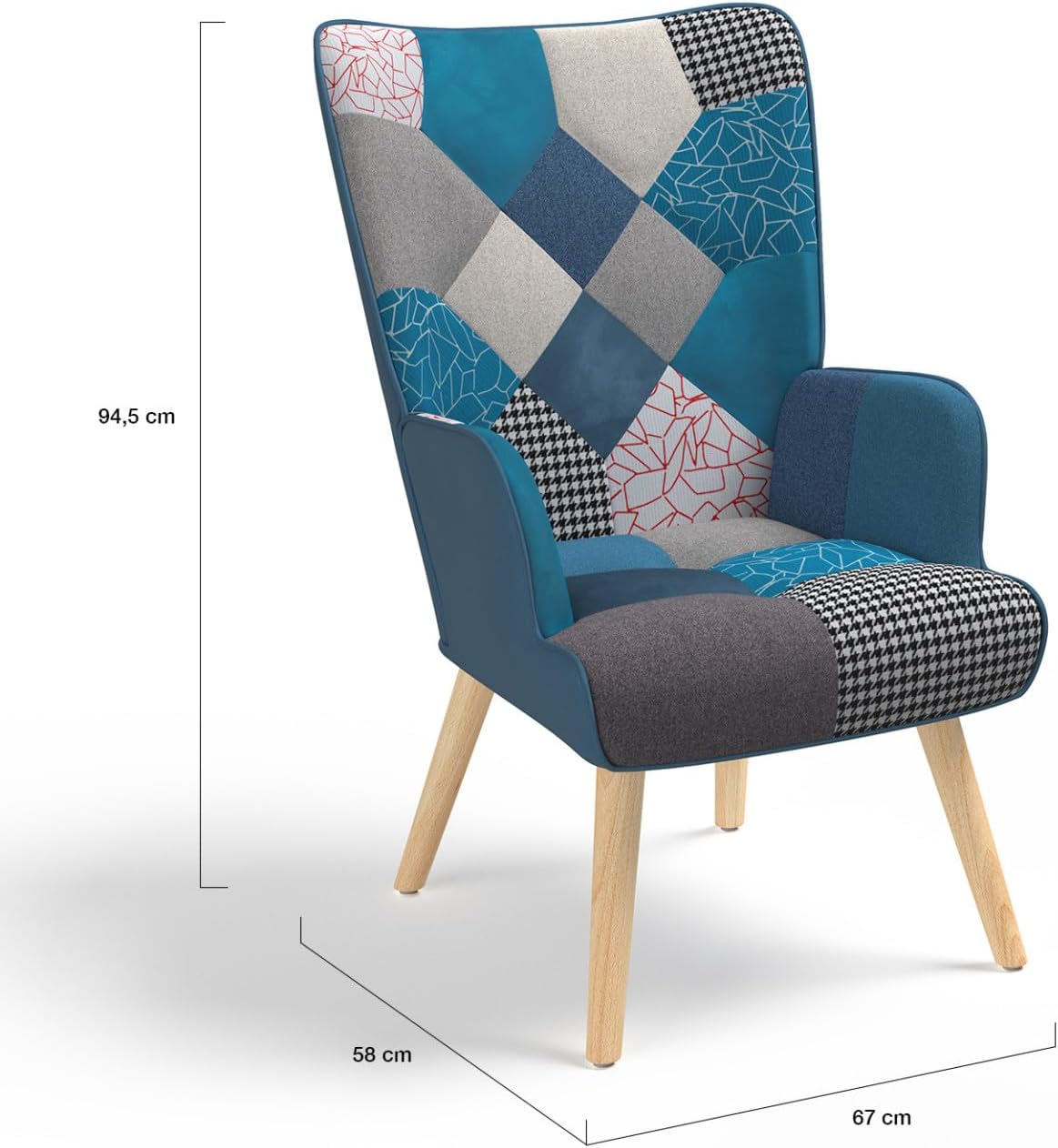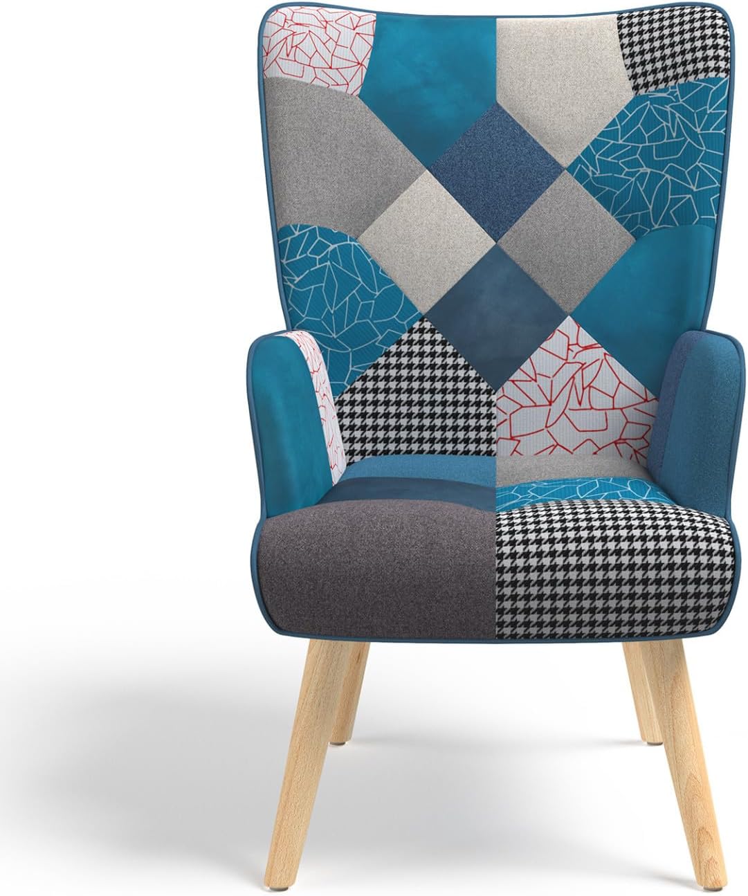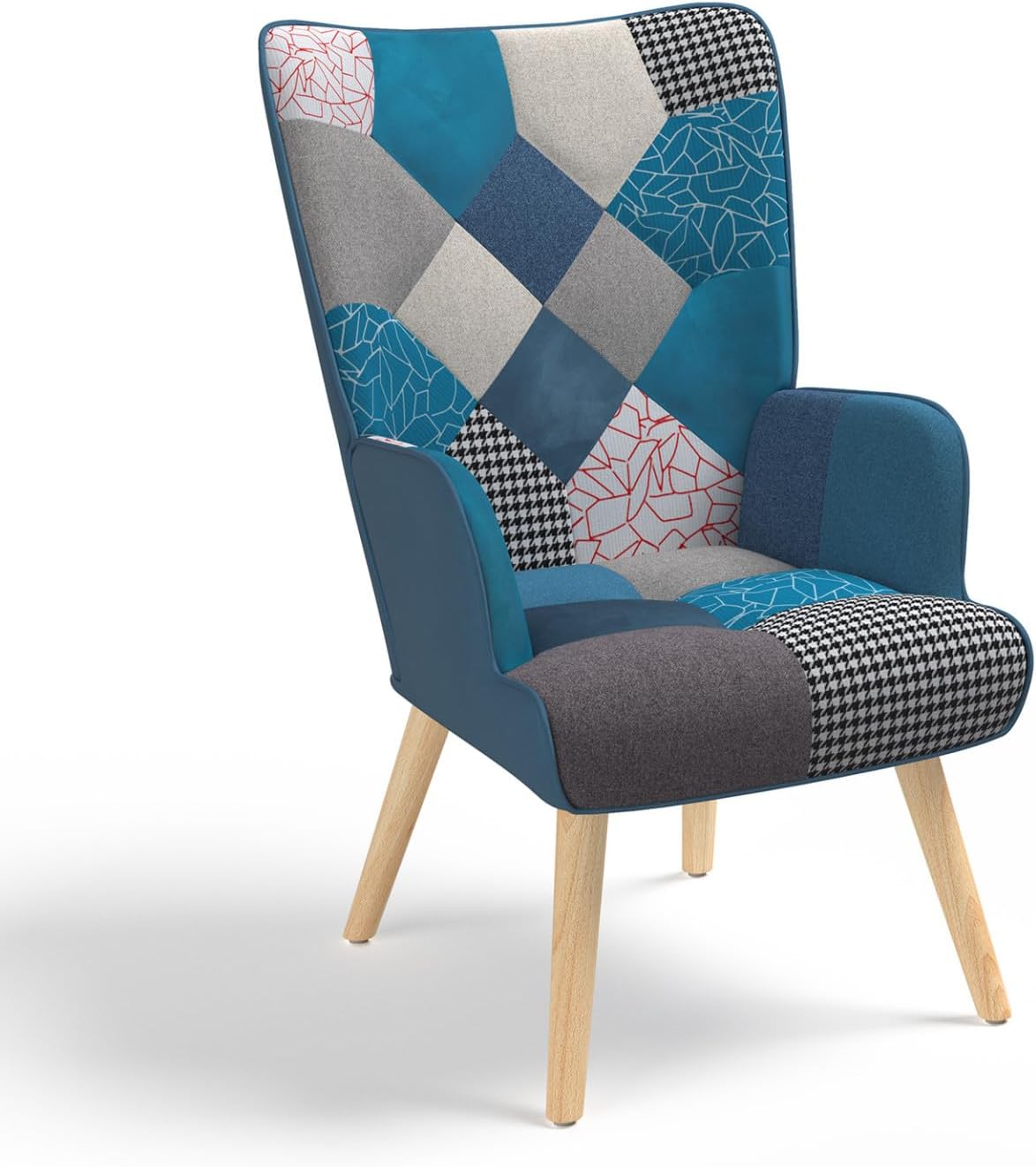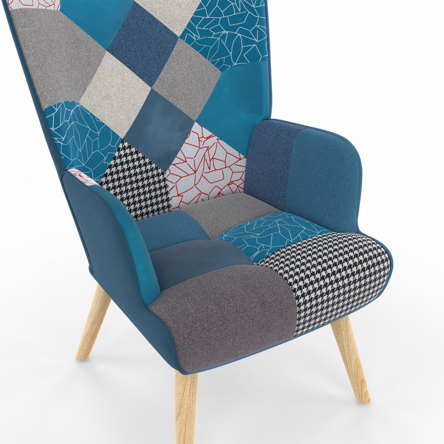 Poltrona scandinava in tessuto patchwork e velluto blu