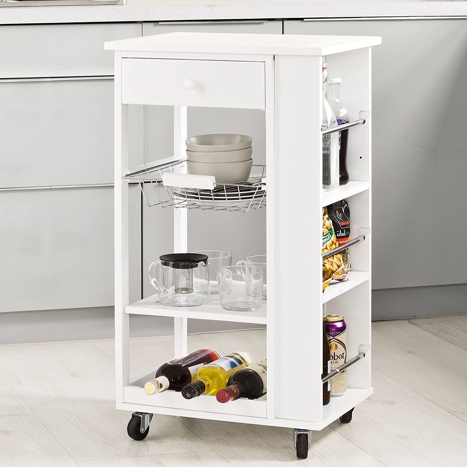Carrello da cucina moderno in bianco Un carrello di servizio con un cassetto,ripiani cestini e portabottiglie per tutti quelli che adorano decorare. Il disegno è semplice e raffinato, l'ideale per tenere in ordine la cucina e trovare un posto a ogni cosa! Materiale Piano di Legno di MDF, Struttura di...