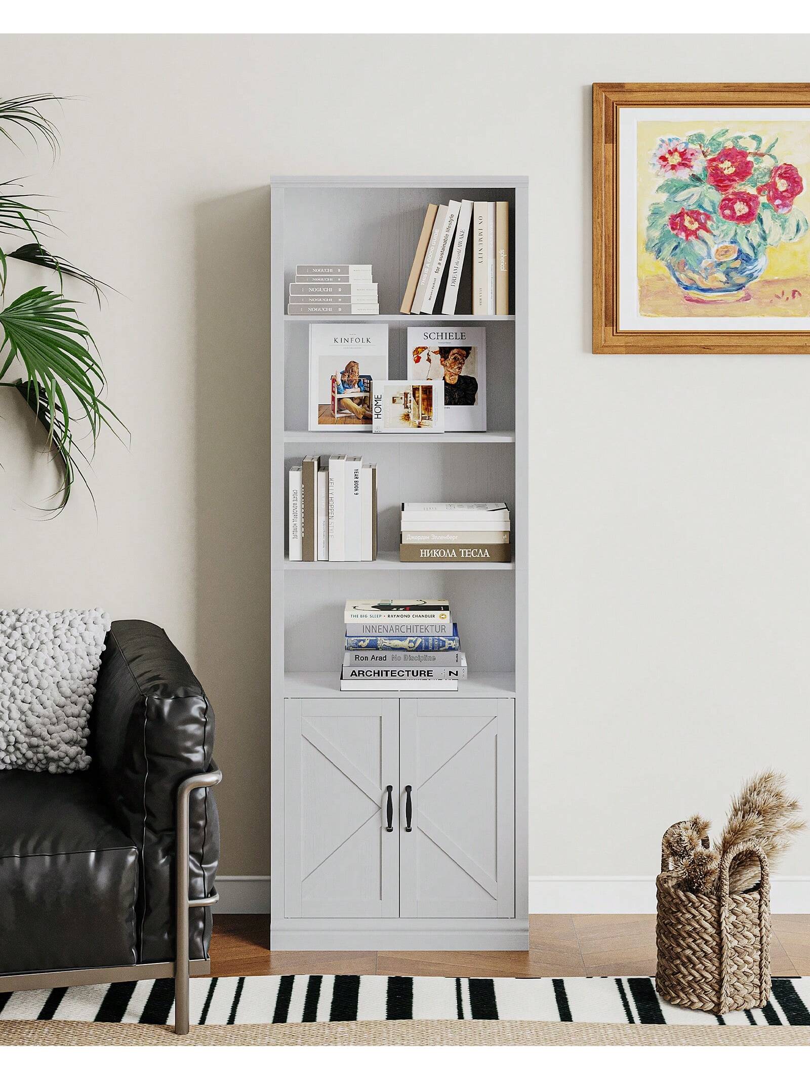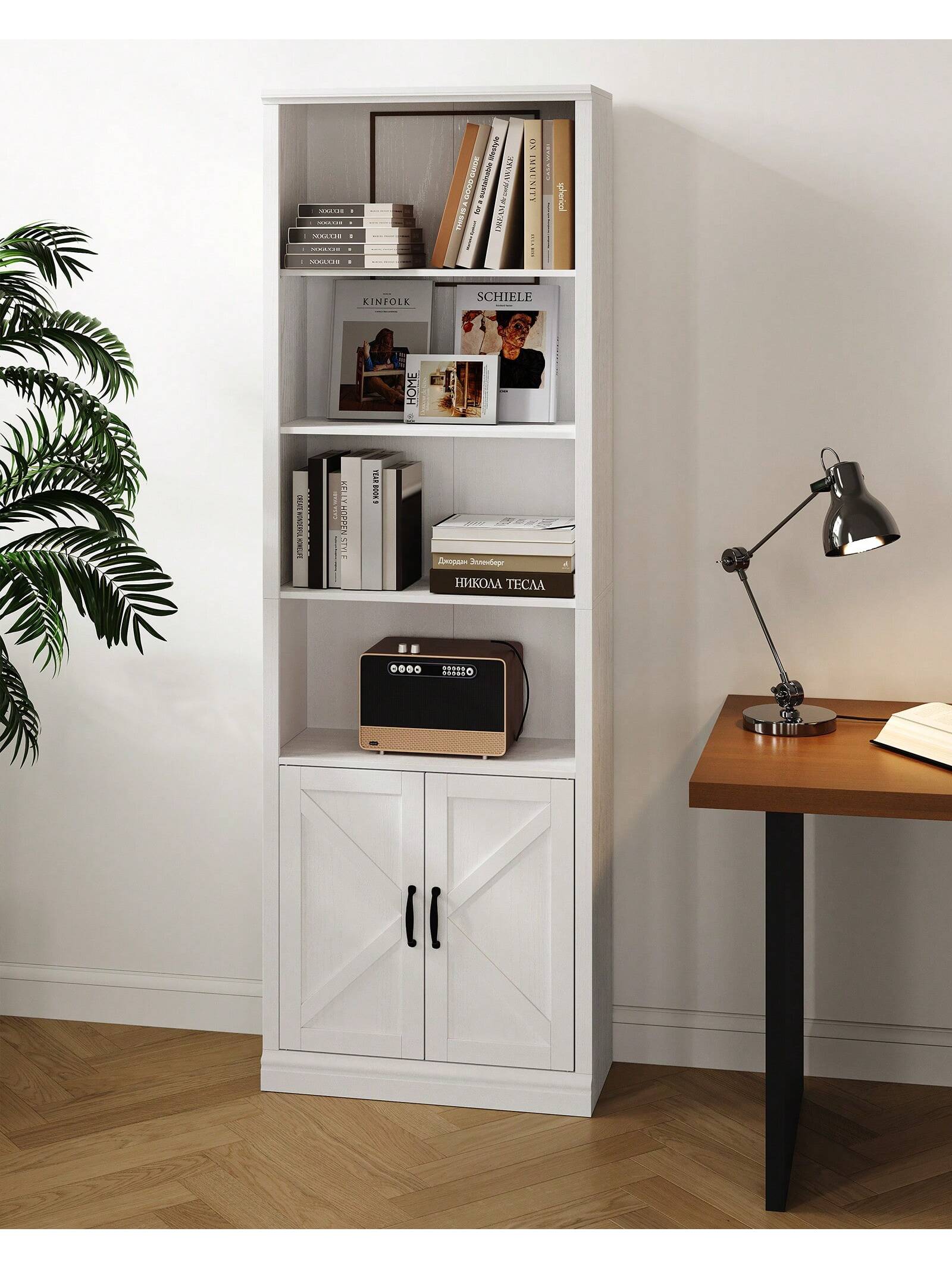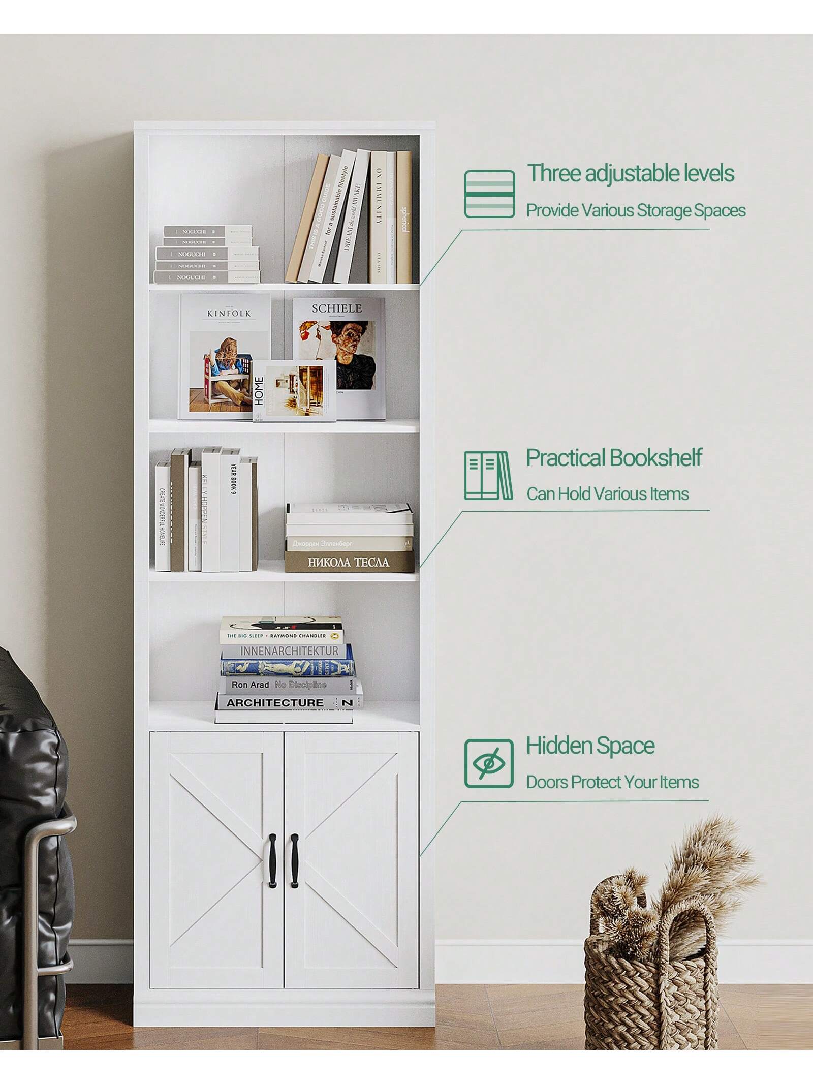 Ampio spazio di archiviazione]Lo scaffale è composto da 4 scomparti aperti e 1 scomparto nascosto nell'anta dell'armadio, che può essere utilizzato per opere d'arte, libri, immagini e altri oggetti.