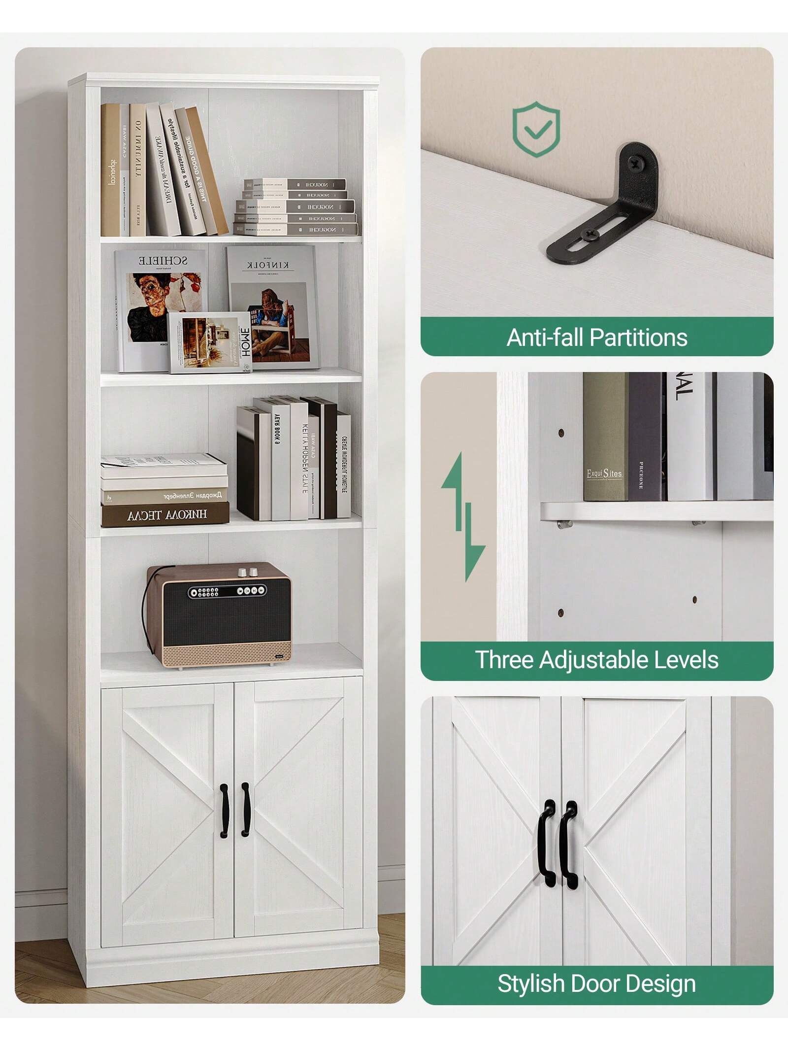 2.[Divisori regolabili]Il divisore superiore della libreria è regolabile su 3 livelli e rimovibile per ospitare oggetti di diverse dimensioni e forme. Il pannello mobile