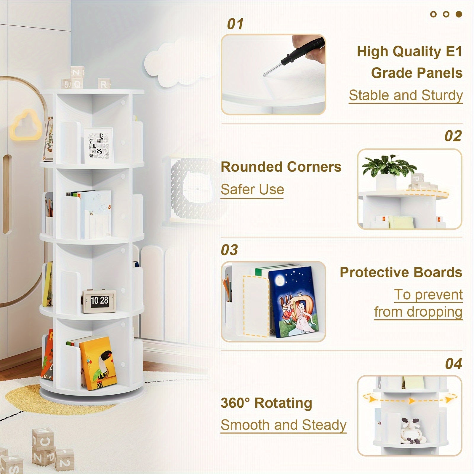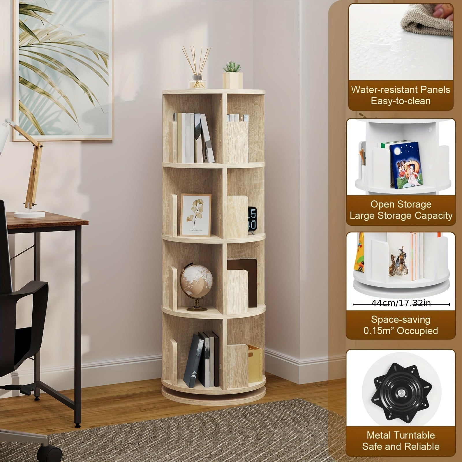 - Libreria girevole a 360° che massimizza lo spazio verticale con 4 livelli e 16 scomparti organizzati.