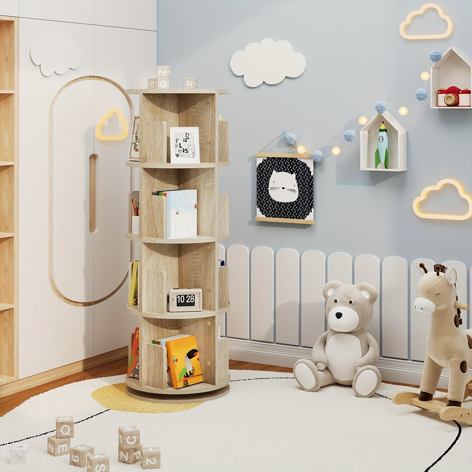 Libreria girevole a 360° che massimizza lo spazio verticale con 4 livelli e 16 scomparti organizzati. La struttura cilindrica (diametro 44 cm, altezza 127,4 cm) ruota completamente, permettendo accesso facile a tutti i ripiani senza spostare la libreria. Ideale per soggiorni, camere da letto e uffici, combina funzionalità di stoccaggio...