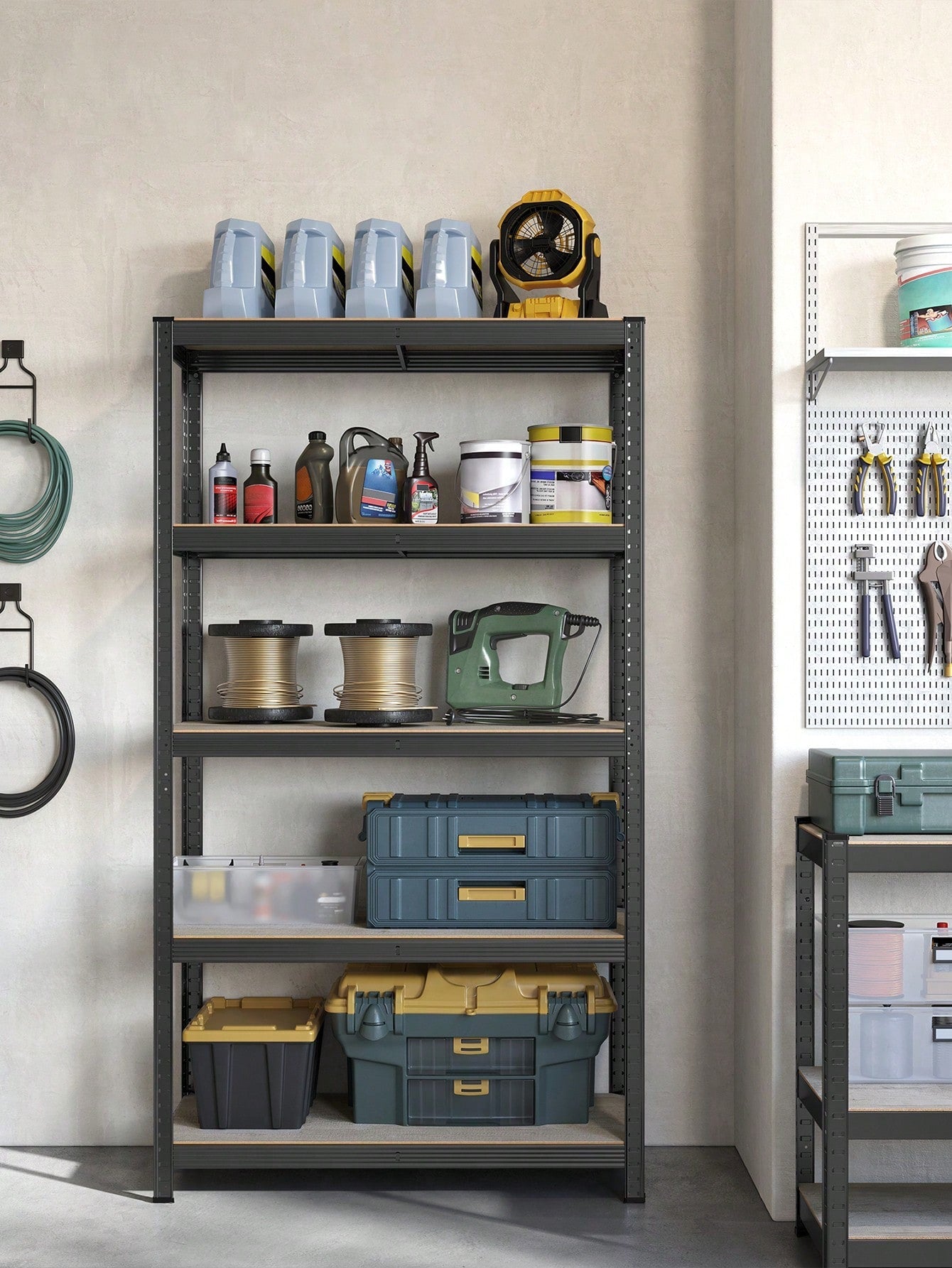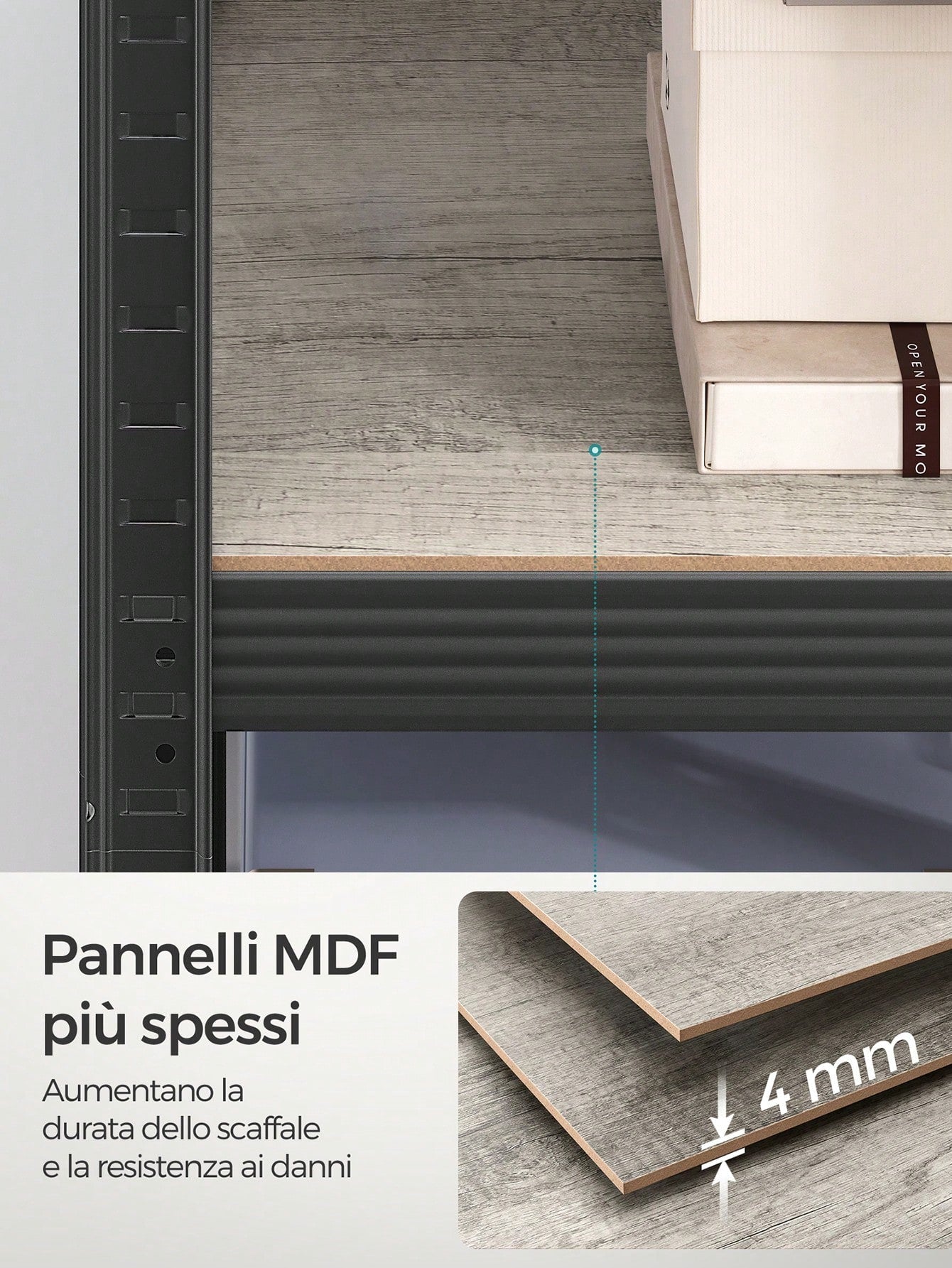 [Struttura robusta] I robusti ripiani di truciolato sono sostenuti da struttura in acciaio con barre di rinforzo aggiuntive, ogni ripiano può reggere fino a 80 kg/120 kg/130 kg, e sostenere in modo sicuro vernici, attrezzi e apparecchiature per il fitness
