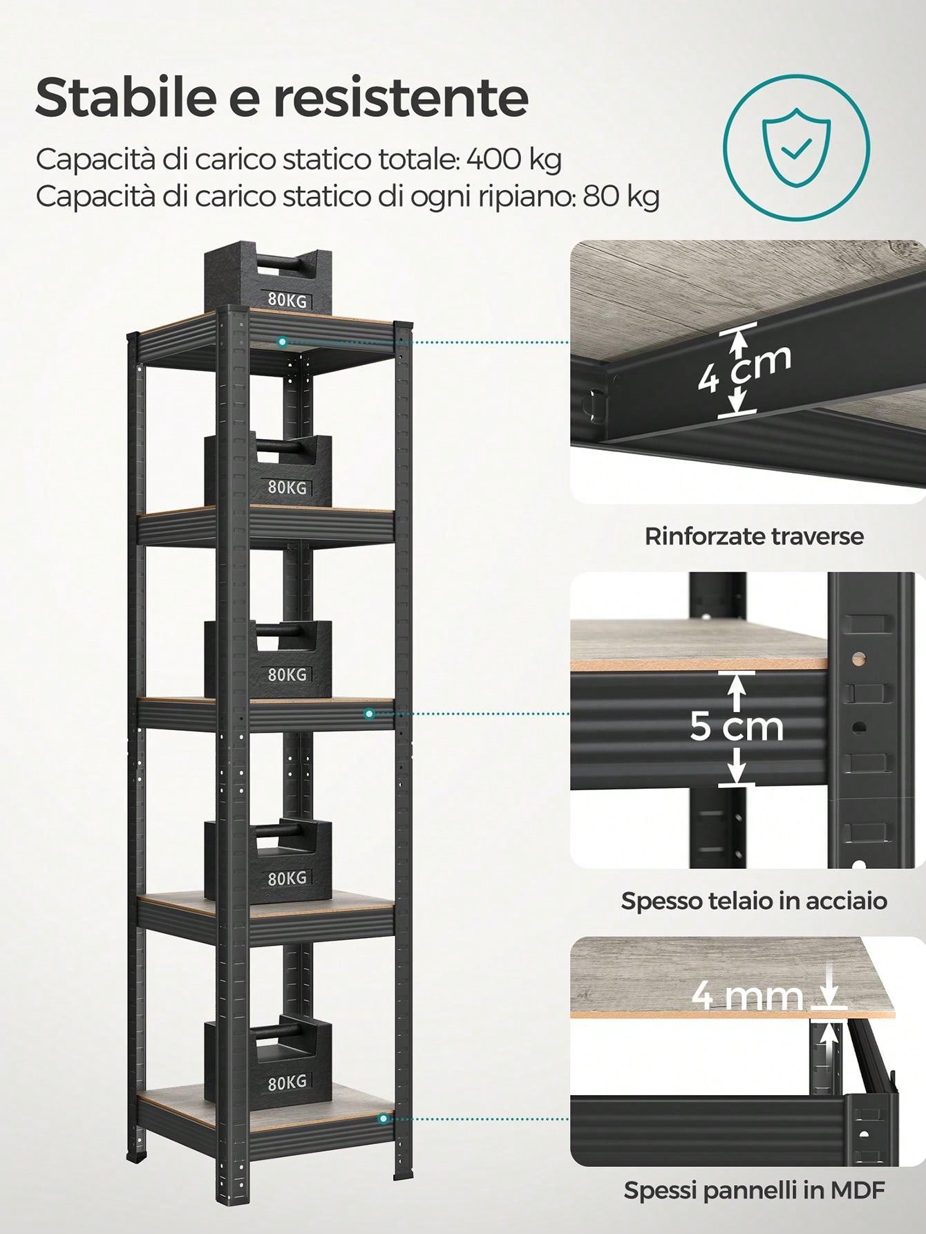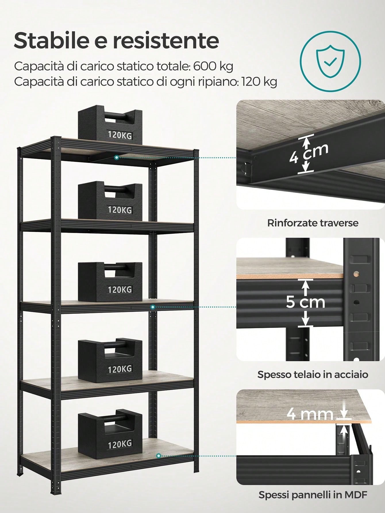 - Capacità di carico statico di ogni ripiano: 80 kg/120 kg/130 kg