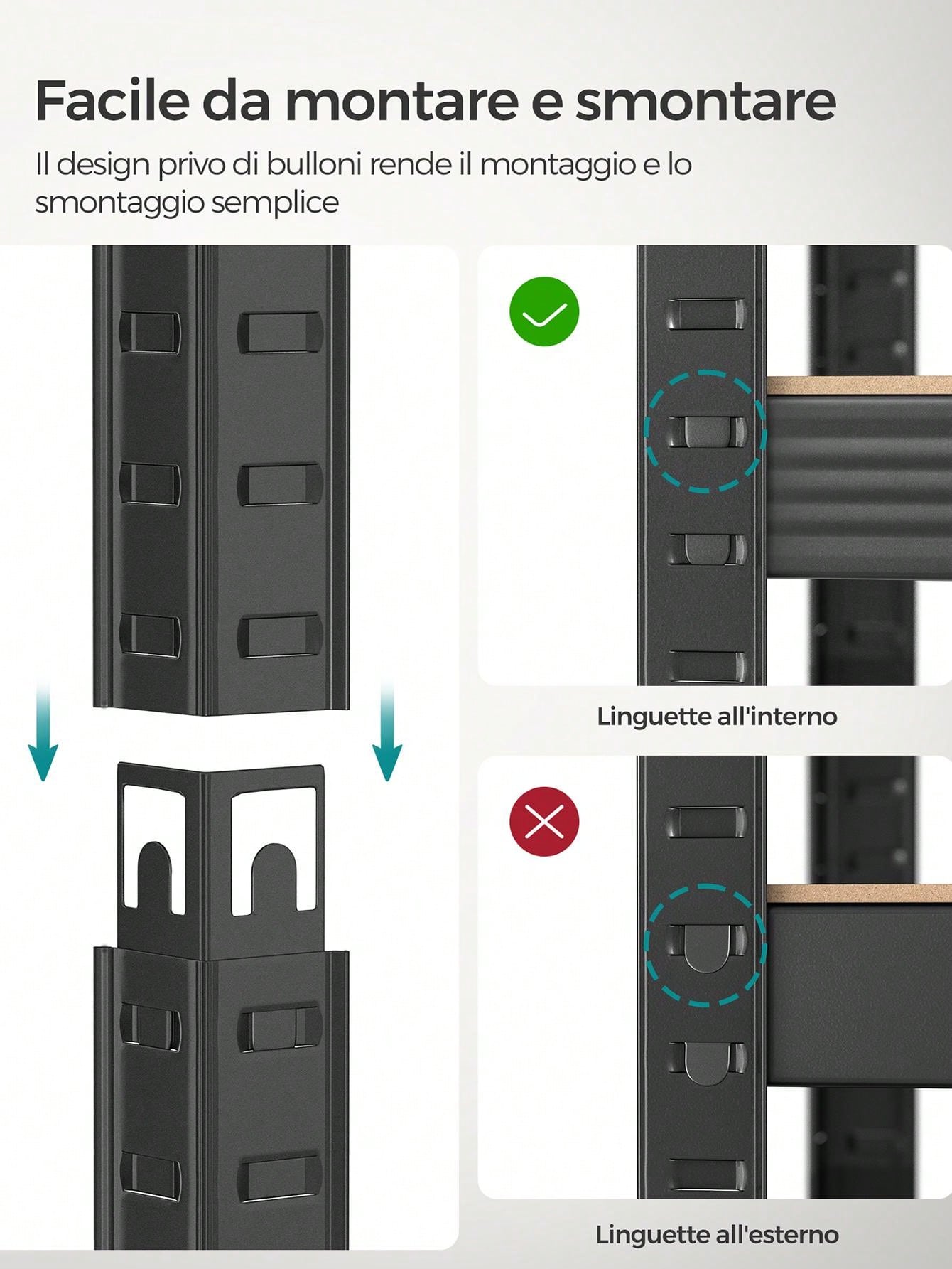 [Ripiani regolabili] L'assemblaggio dello scaffale non richiede attrezzi, le parti possono essere collegate con gli incastri e l'altezza tra i ripiani può essere regolata in modo flessibile in base alle esigenze di stoccaggio
