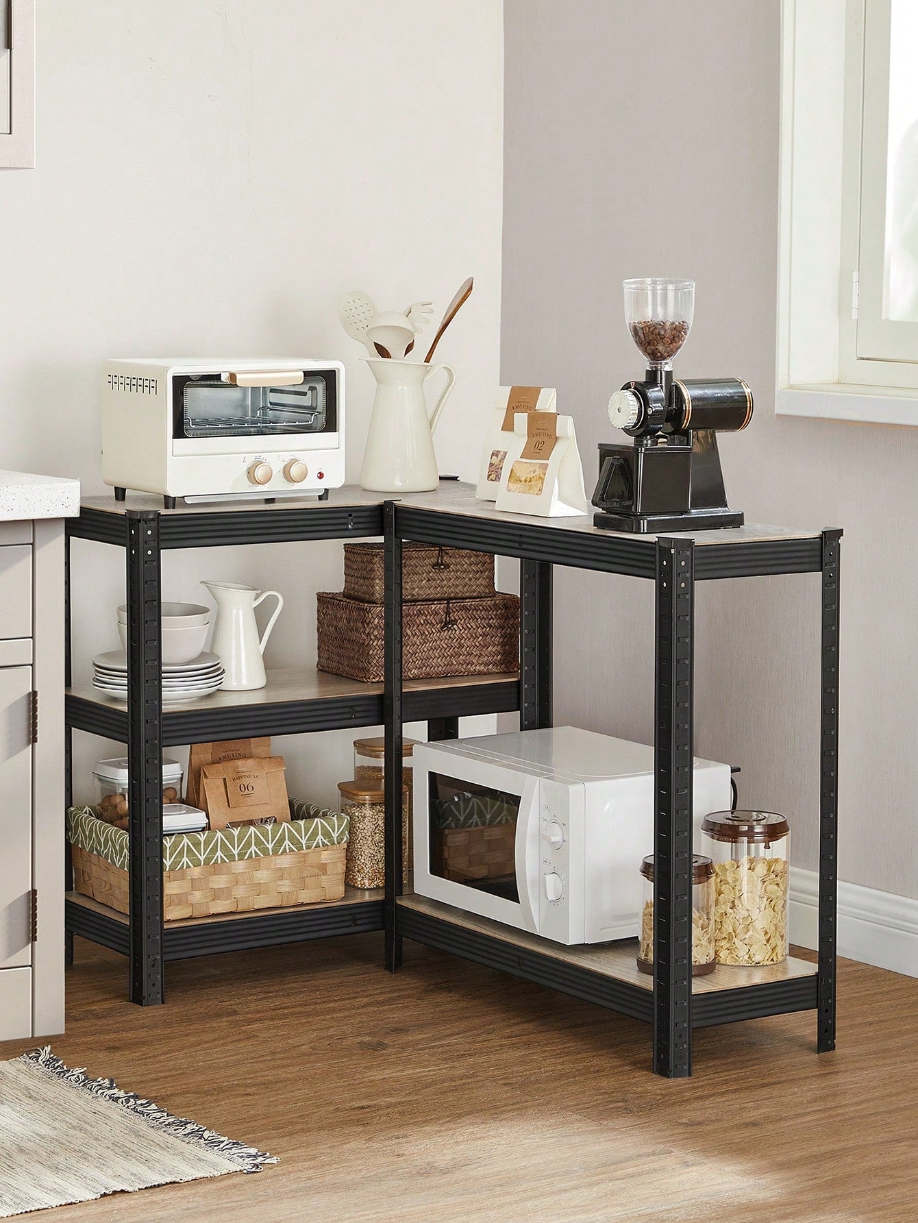 [Due scaffali divisi] Lo scaffale può essere diviso in due scaffali bassi, uno in cucina come supporto per il forno e il microonde, l'altro può essere posizionato nello studio per collocare libri, pianti, stampante, ecc.