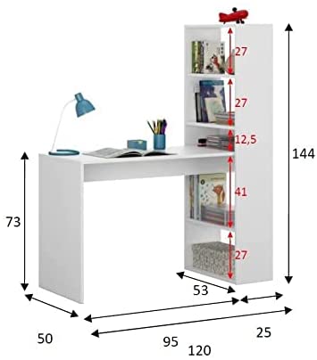 - Misure totali: 120 x 53 x 144 cm - Misure scrivania: 95 x 50 x 73 cm - Misure libreria: 25 x 52 x 144 cm.