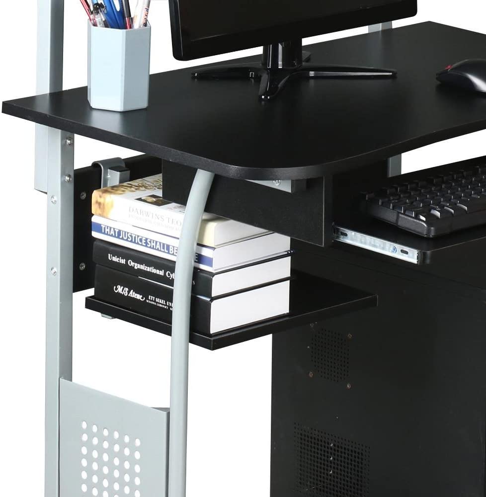 - Ripiani Multipli per Vari Tipi di Archiviazione: Questo tavolo per computer nero ha diversi livelli per soddisfare le diverse esigenze di archiviazione. Il ripiano superiore può essere utilizzato per posizionare piccole stampanti o fax domestici. C'è un rack di archiviazione laterale per alcune piccole cose, come notebook o dischi. Inoltre, il ripiano inferiore è per CPU mainframe e altri oggetti di grandi dimensioni.