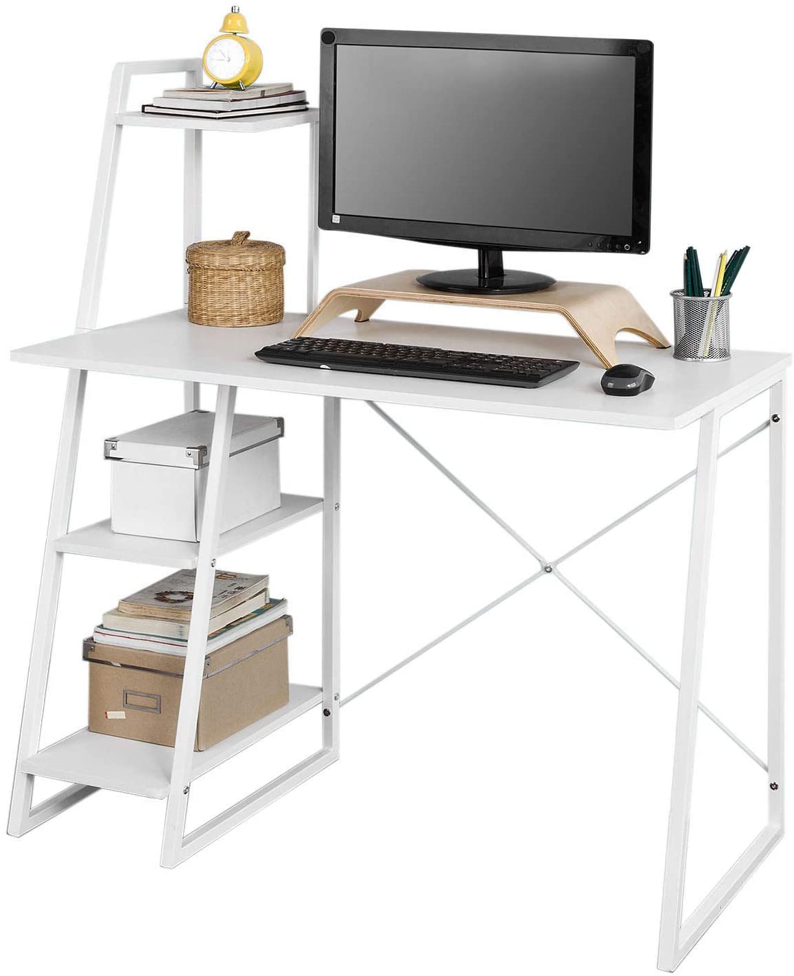 Scrivania,Porta PC,Tavolo per Computer,con Tre Ripiani,Bianco