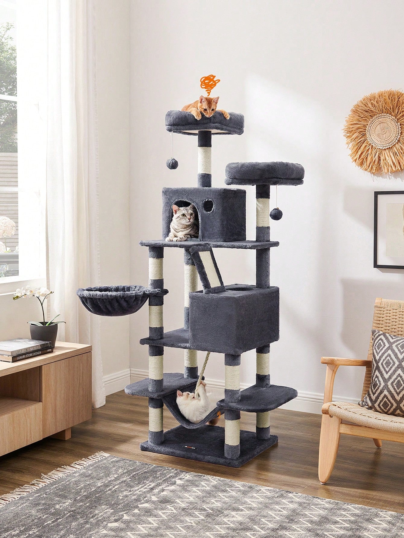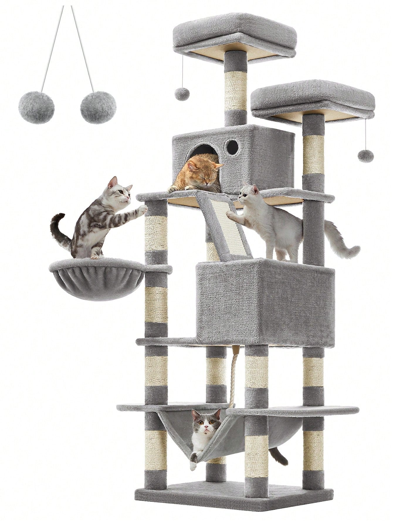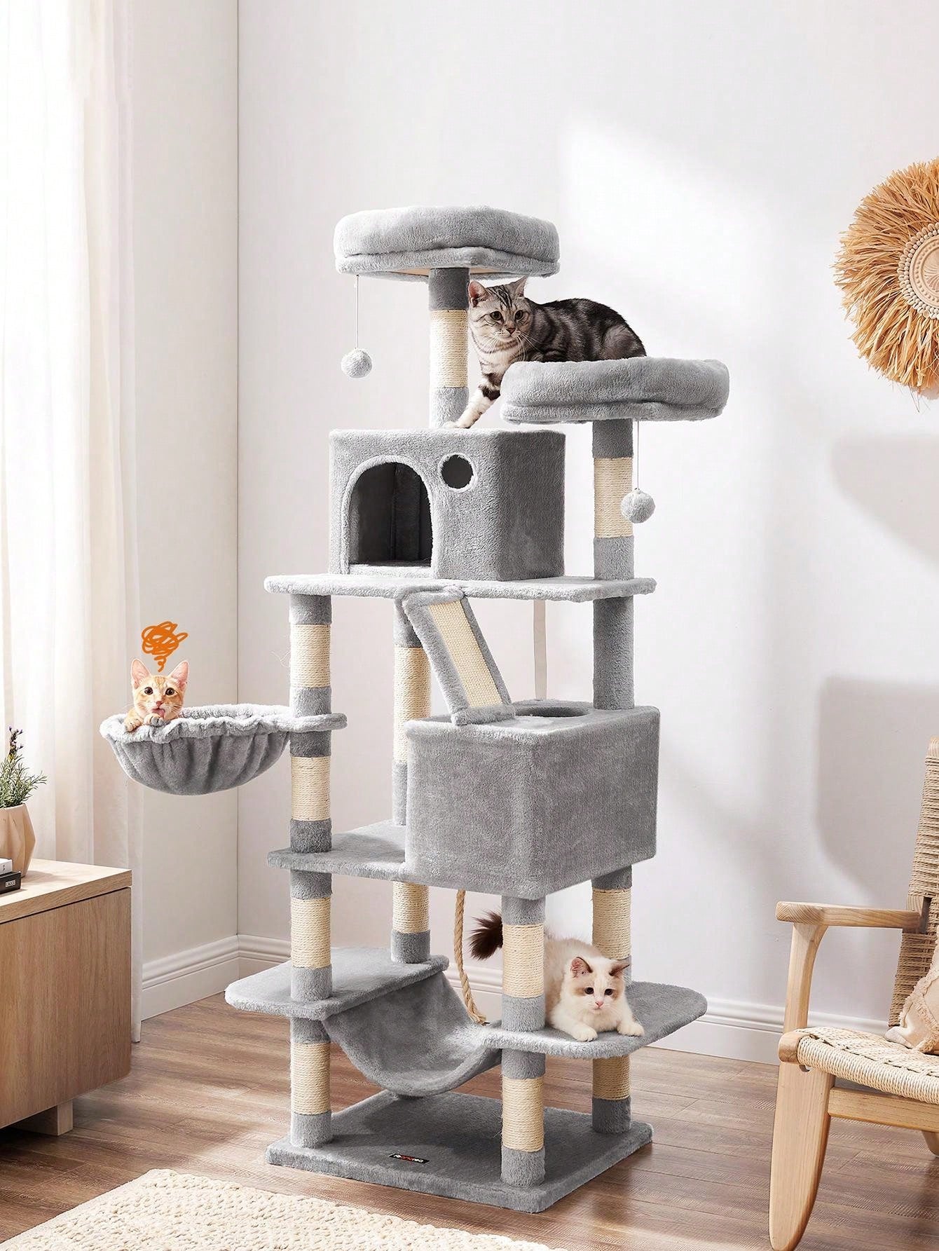 Divertimento a tutto tondo: Con 2 pompon, una corda da gioco, 2 grotte, un cestino e un'amaca, i tuoi gatti non si annoieranno mai su questa torre da gioco per gatti.