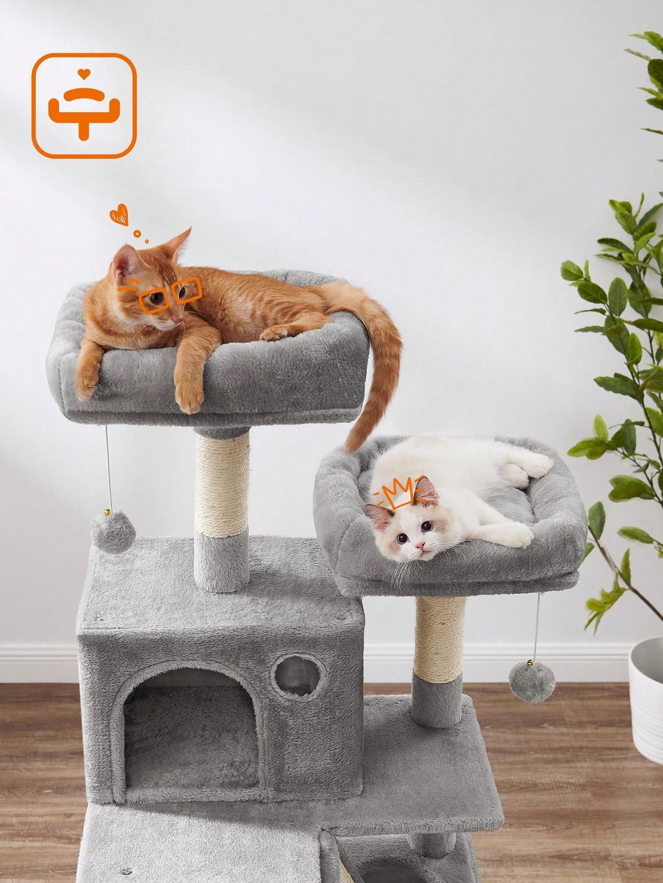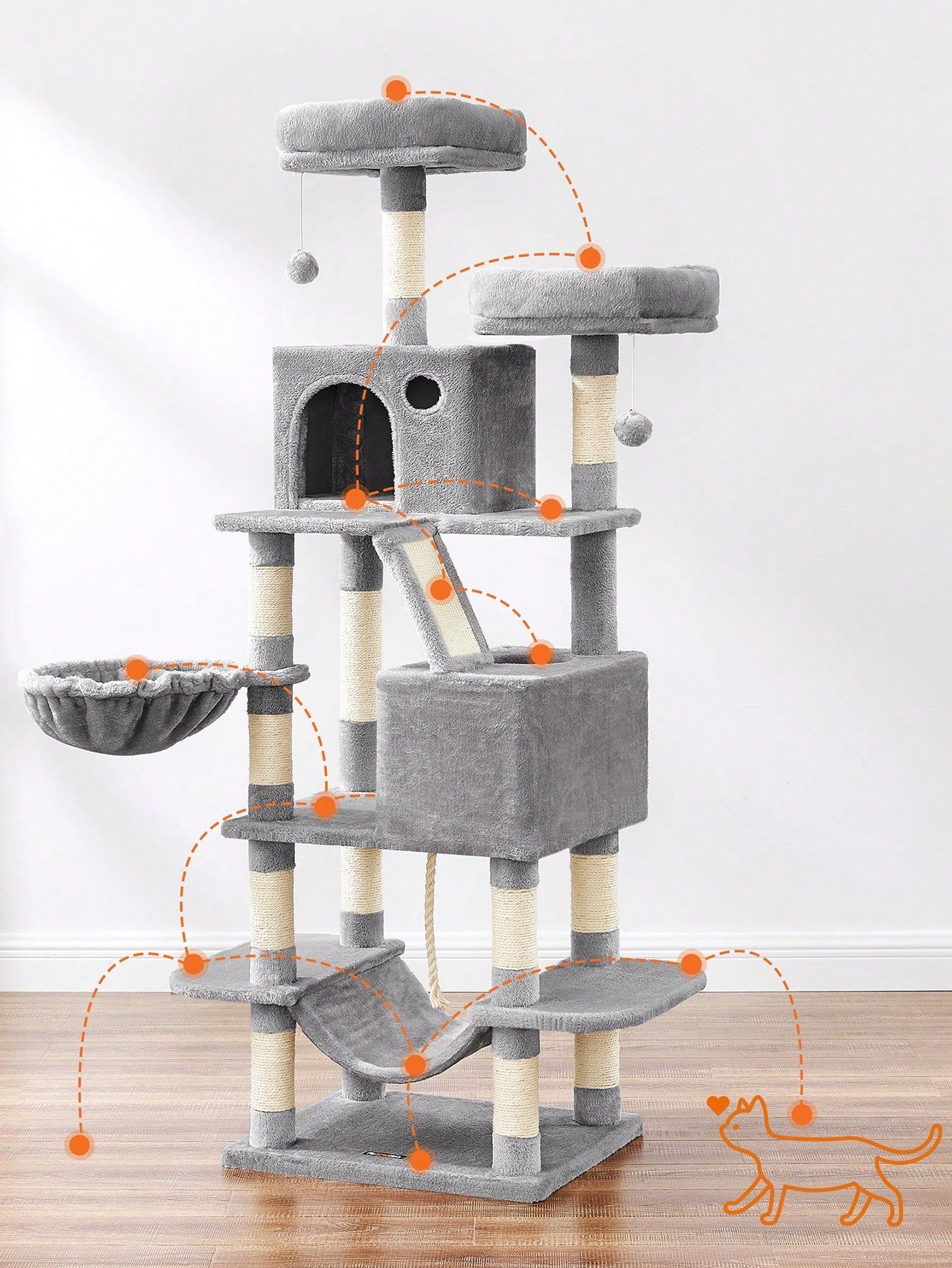 [Parco giochi tutto compreso] Con 2 posatoi imbottiti, 2 accoglienti grotte, 1 soffice cesto, 2 pompon e 1 amaca, gatti di diverso carattere possono trovare il loro posto preferito in questa villa a più livelli ricoperta di peluche, perfetta per famiglie con più gatti