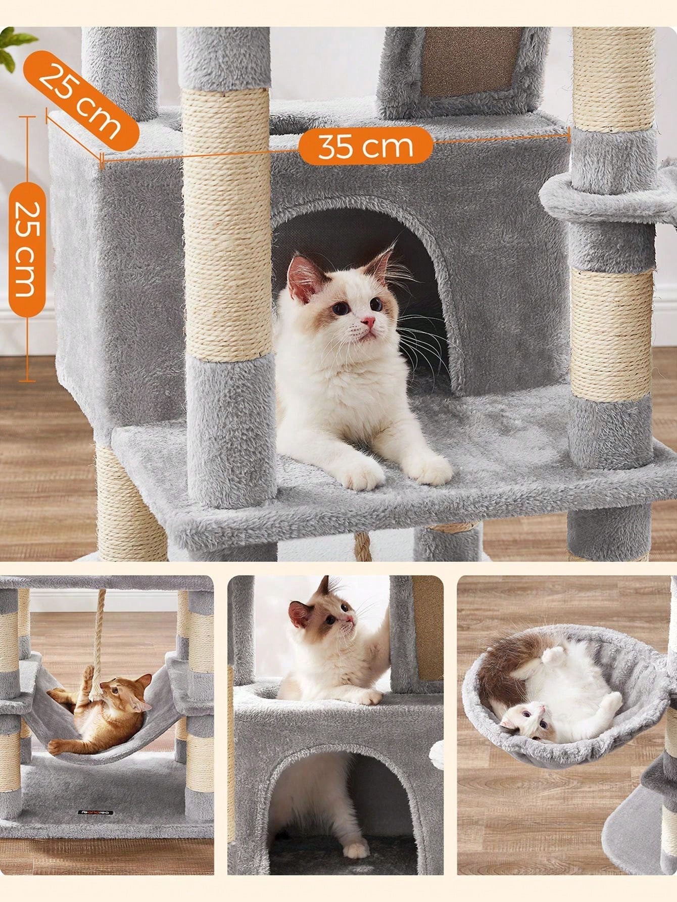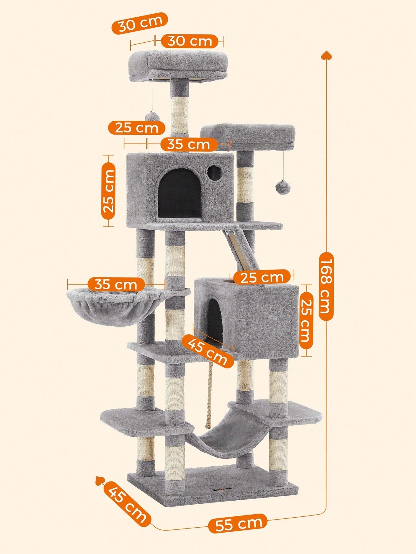 Alto 168 cm, divertimento nell'arrampicata] Alto 168 cm. 5 livelli. Breve distanza tra i livelli di 25-30 cm. Questo albero per gatti in peluche è perfetto per i gatti che amano le arrampicate e i posti alti,
