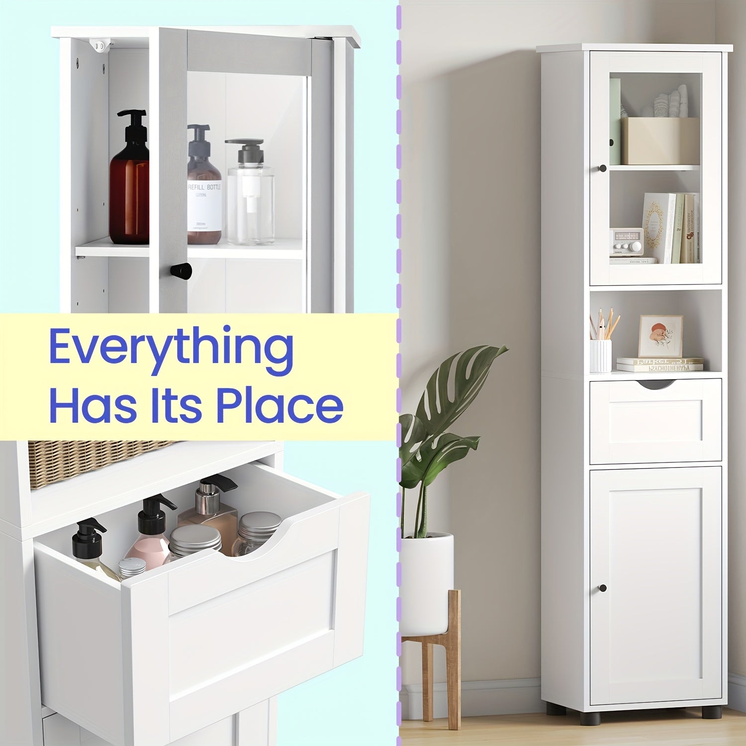 Armadio da bagno alto e sottile con porte in vetro e ripiani regolabili Organizzatore salvaspazio