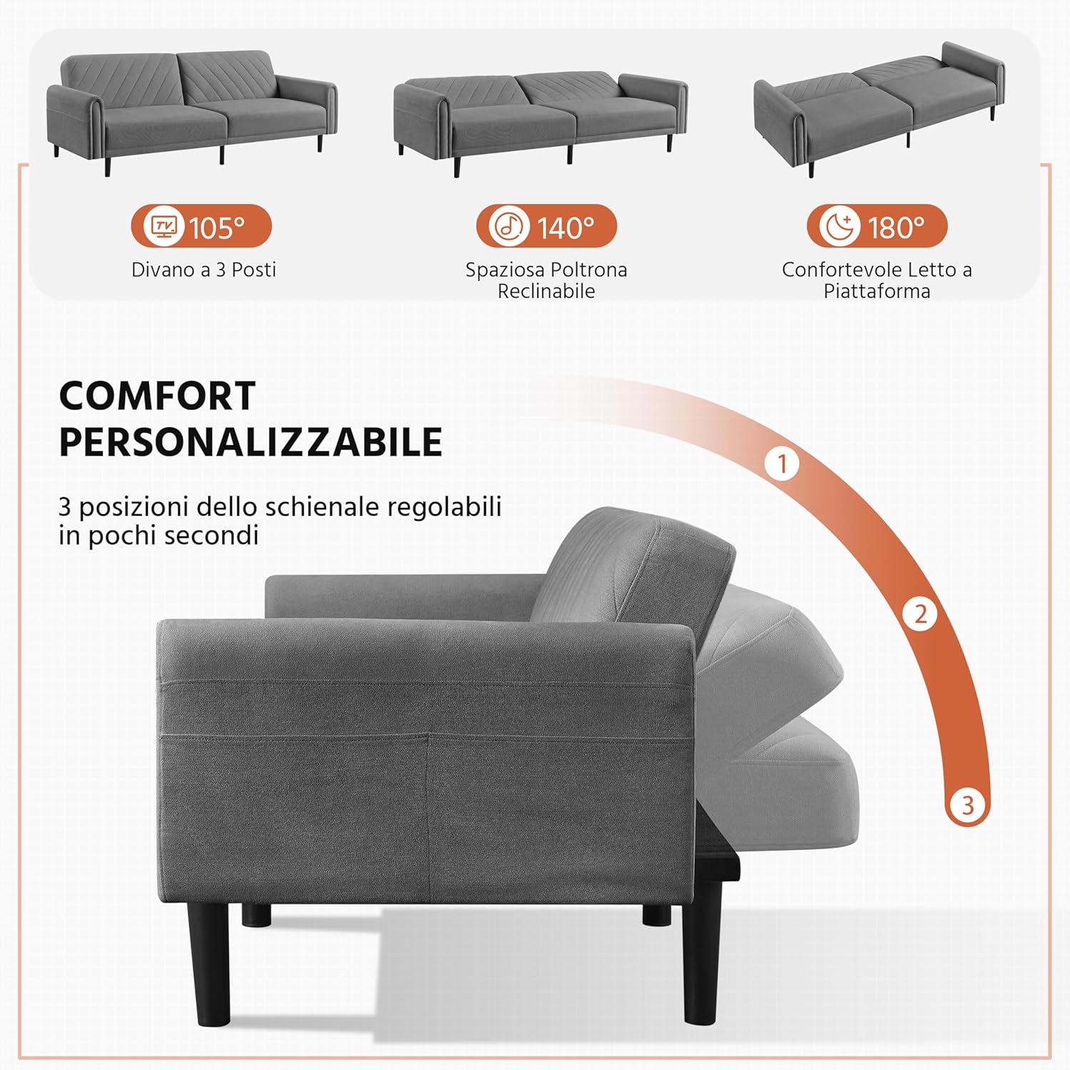 【Adatto a spazi ridotti】Per spazi ristretti, il nostro divano letto multifunzione offre comfort istantaneo. Da divano a tre posti, si trasforma in un letto temporaneo di 176 x 98 cm per accogliere ospiti improvvisi.