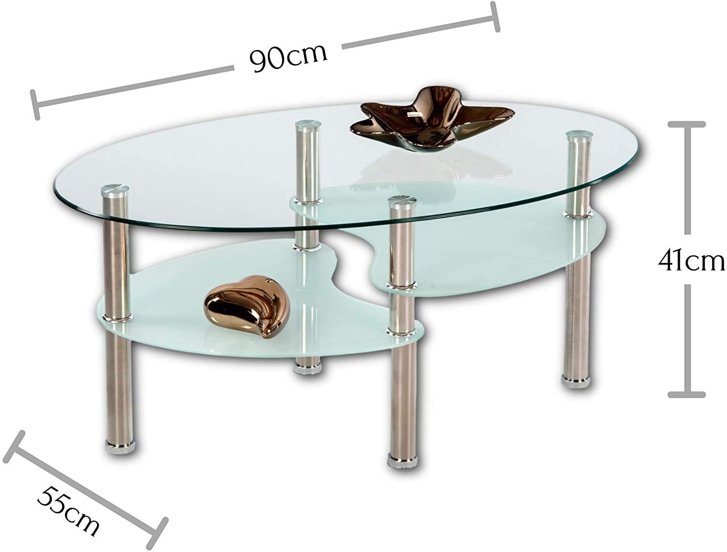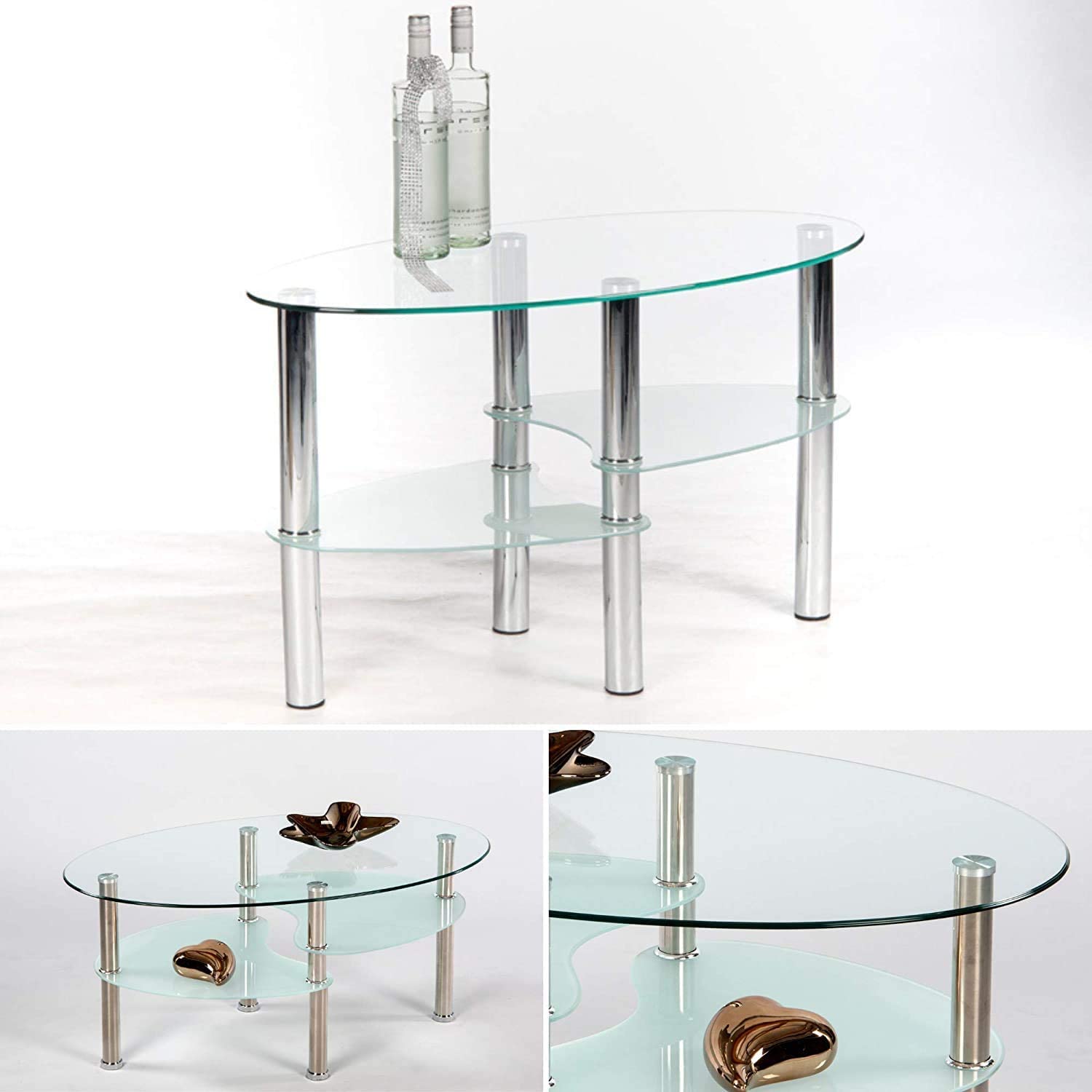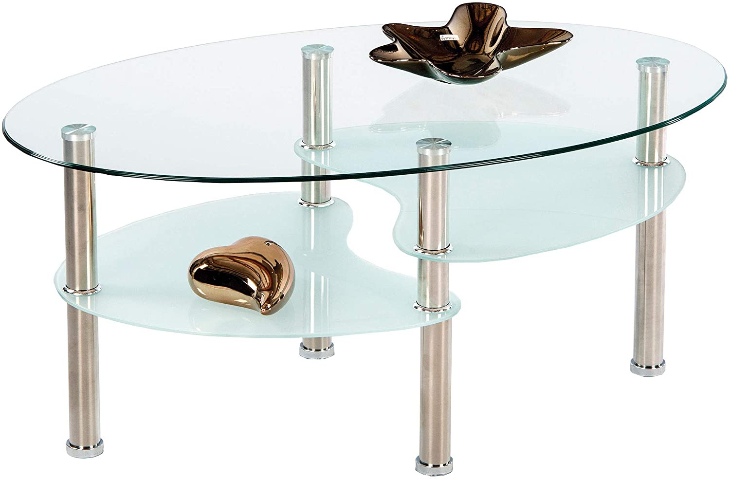 Tavolino da Soggiorno in Vetro con Piedi in Metallo, Forma Ovale con 2 Ripiani,